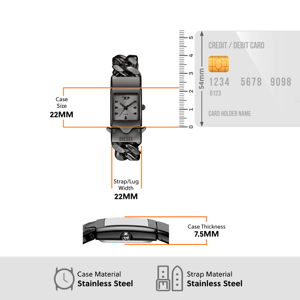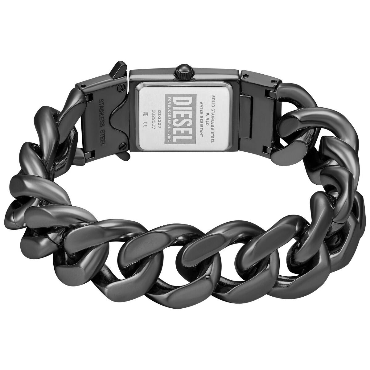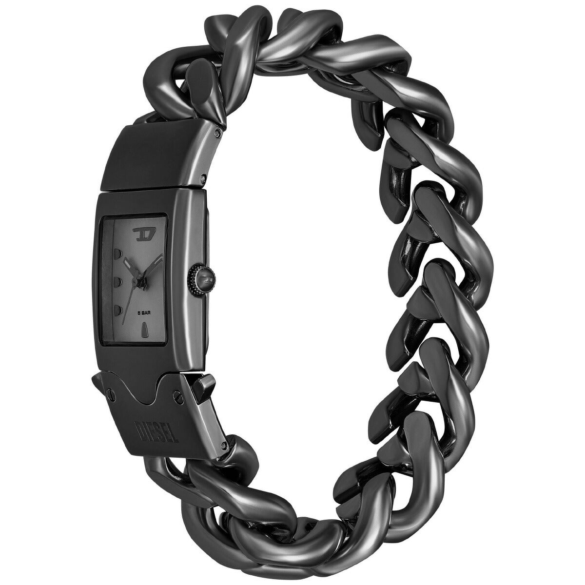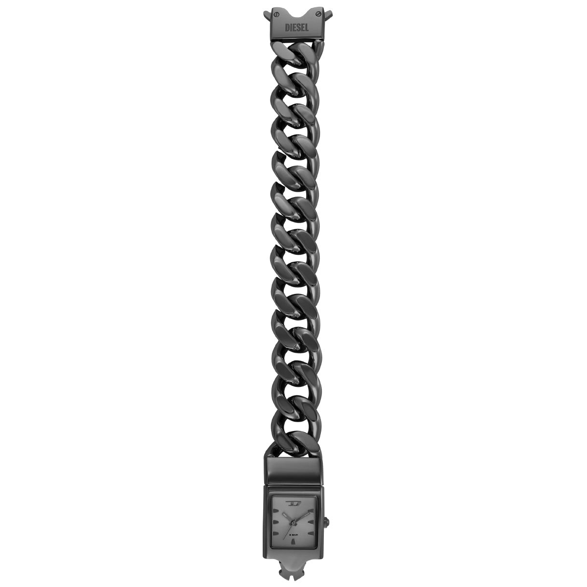 DIESELの22mm CLOSERウォッチ。ガンメタルのサンレイダイヤル、三針ムーブメント、ジュエリーからインスピレーションを得たガンメタルのステンレススチール製バックル留めブレスレットアタッチメントが特徴です。