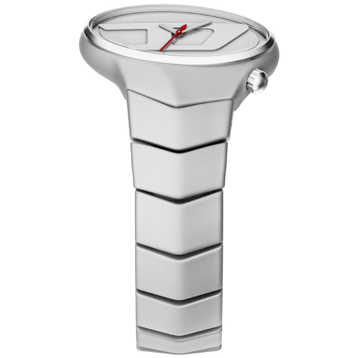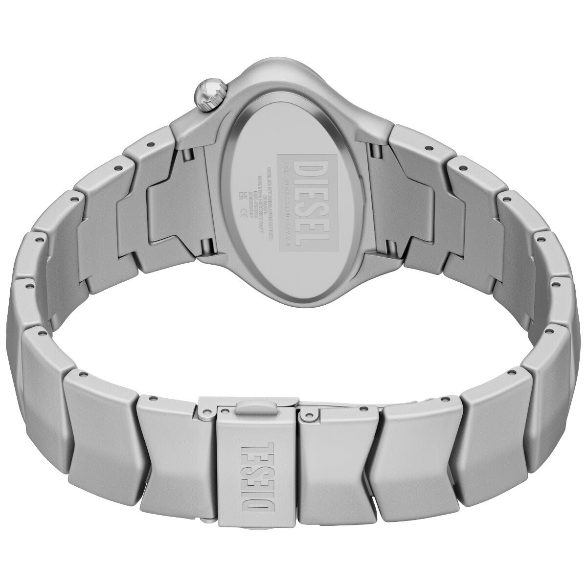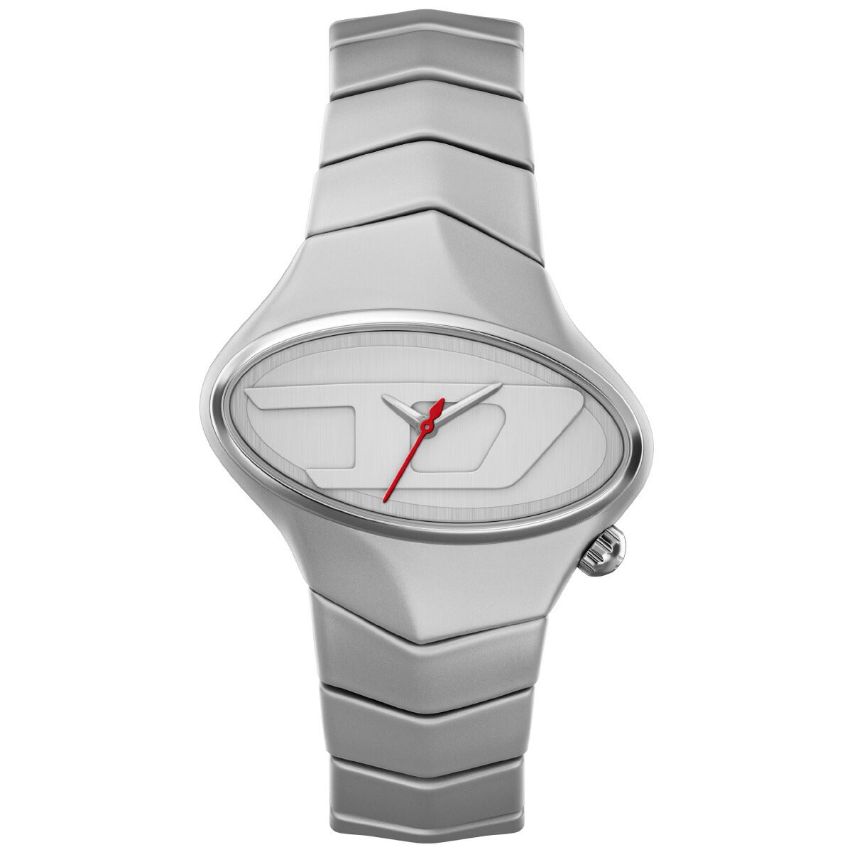 ブラッシュ仕上げのシルバーダイヤルを備えたDIESEL D-RUSH 42mm径ウォッチ。三針ムーブメントとマットシルバーのステンレススチール製ブレスレットを組み合わせました。