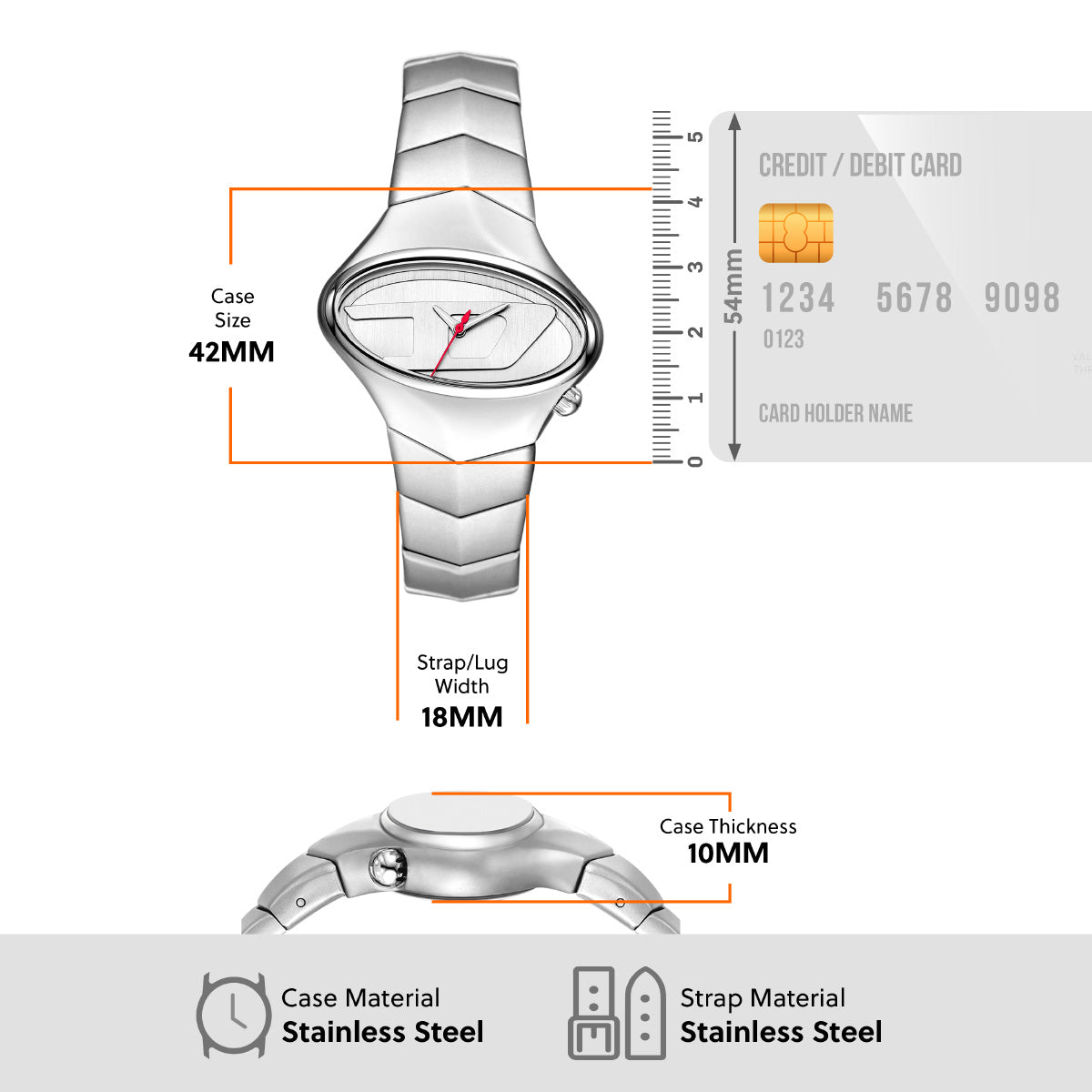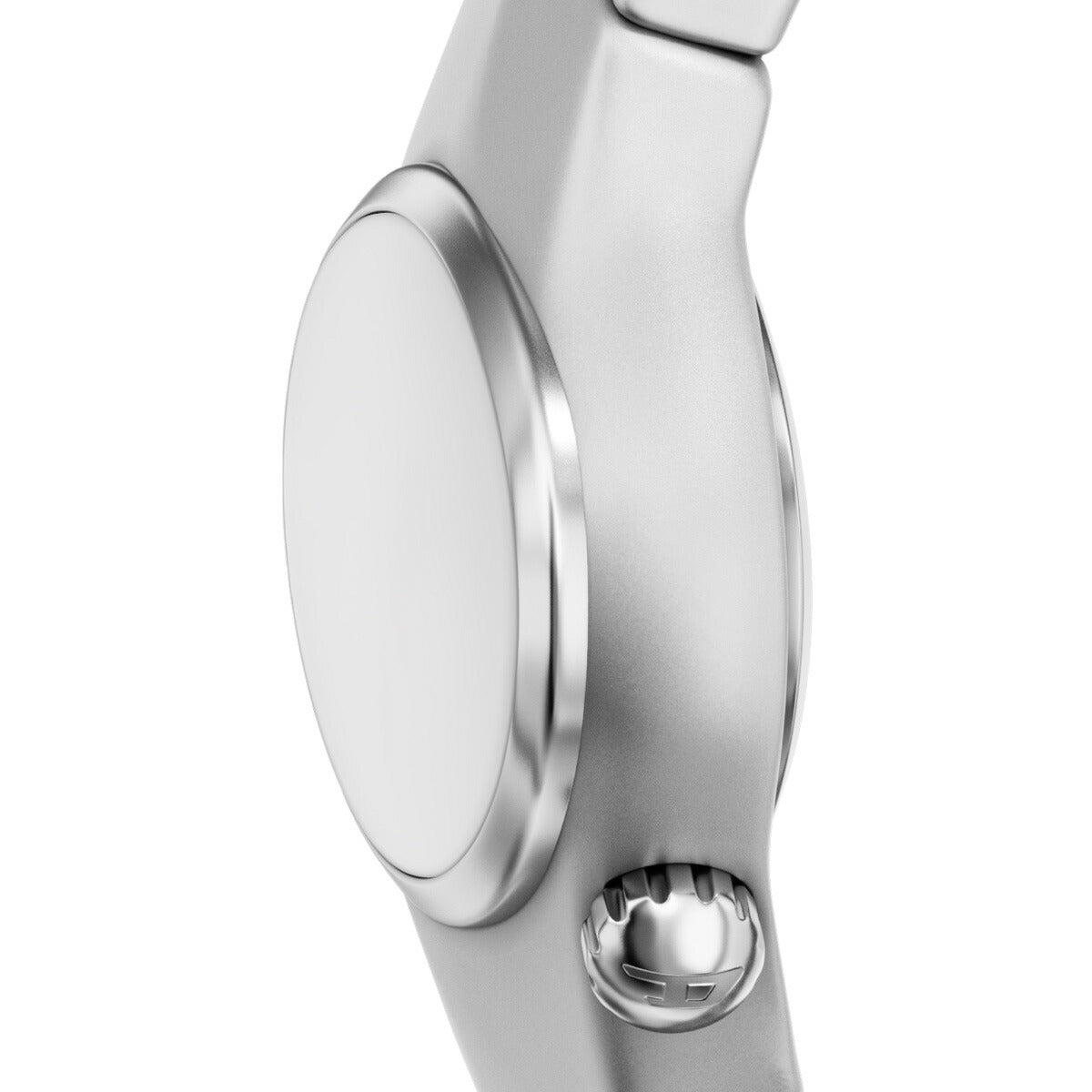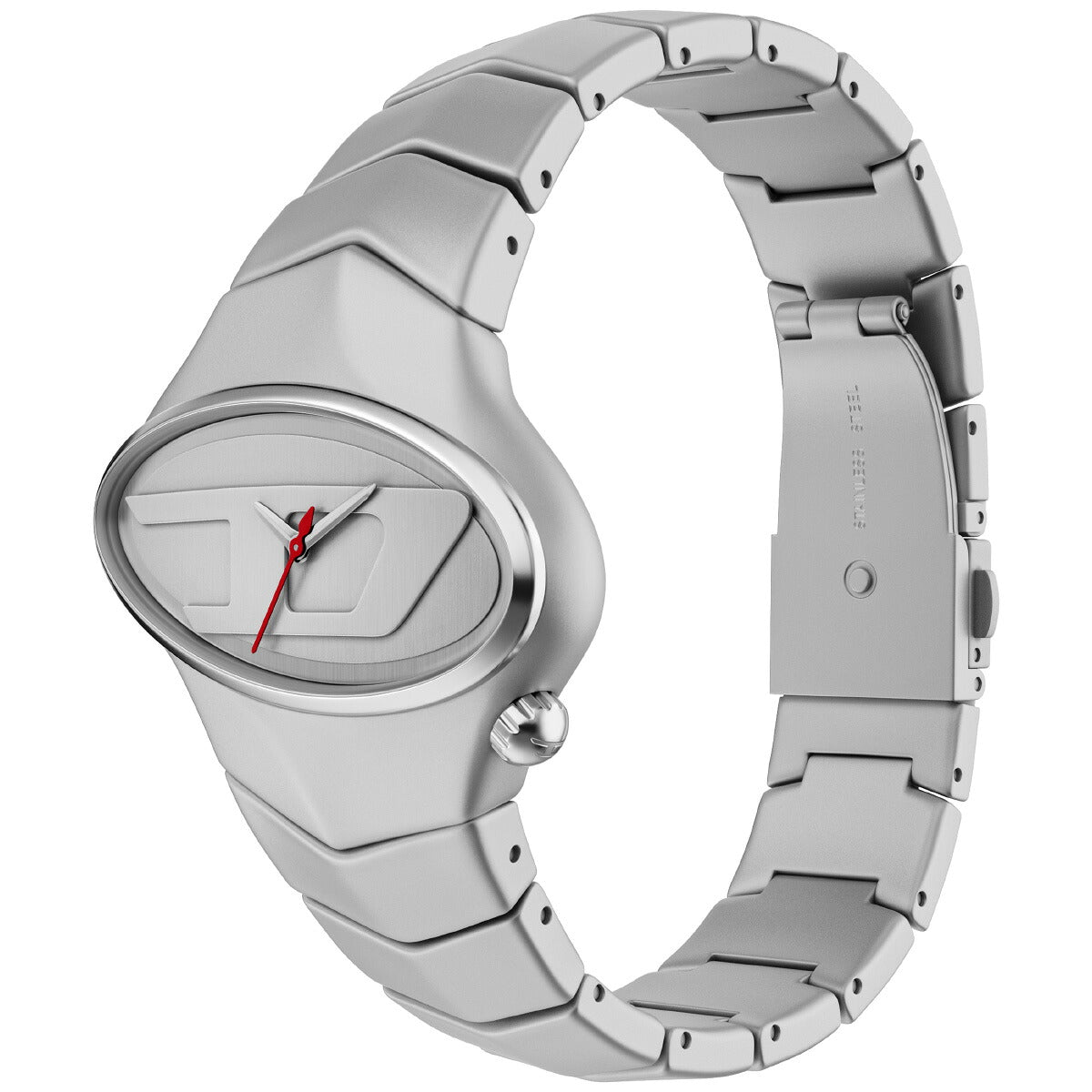 ブラッシュ仕上げのシルバーダイヤルを備えたDIESEL D-RUSH 42mm径ウォッチ。三針ムーブメントとマットシルバーのステンレススチール製ブレスレットを組み合わせました。
