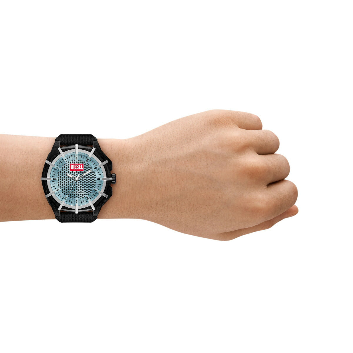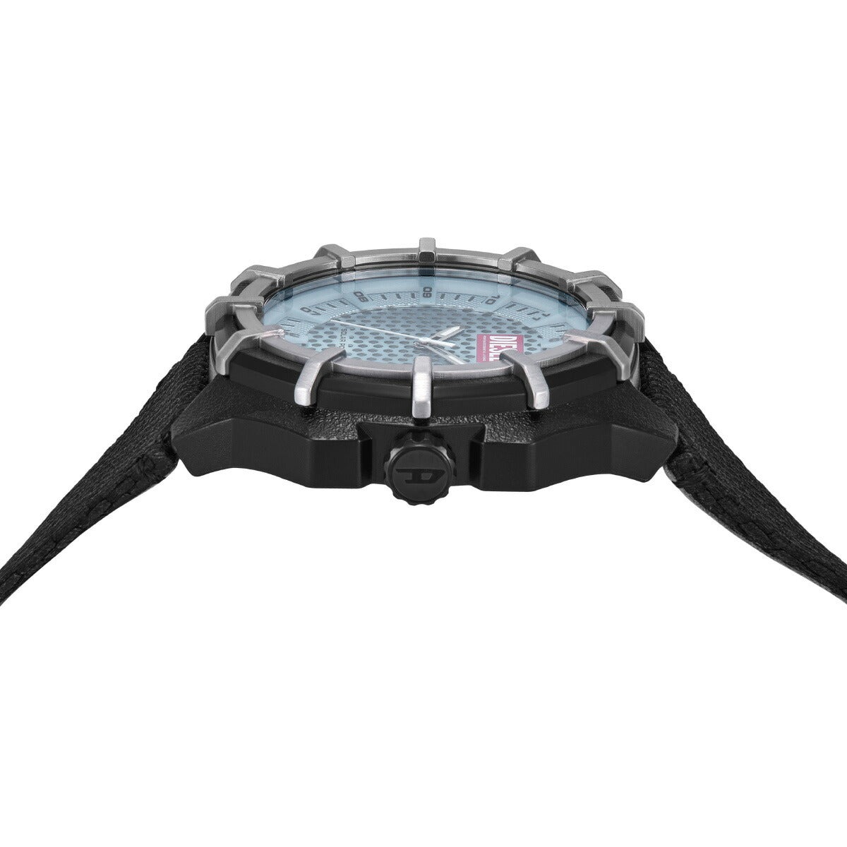 一部にキャスターオイルを45%使用したバイオベースの51mm径ケースに、三針ソーラーパワームーブメントを搭載したDieselのFRAMEDウォッチ。質感のあるブルーのダイヤルに、裏面にレザーを配した#tide ocean material*製のブラックのストラップを組み合わせました。*#tide ocean materialは100%オーシャンバウンドプラスチックから作られた高品質なリサイクルプラスチック素材です。