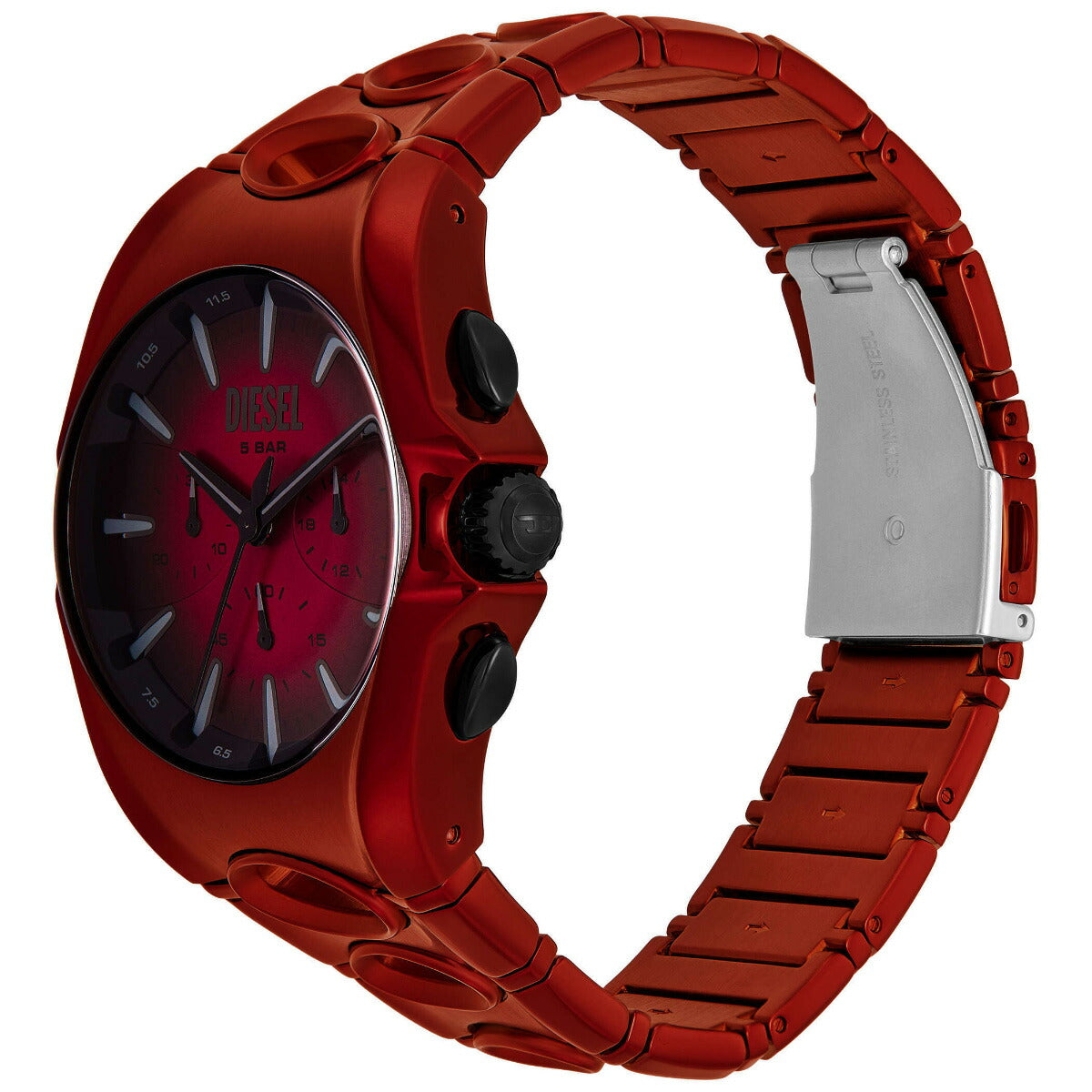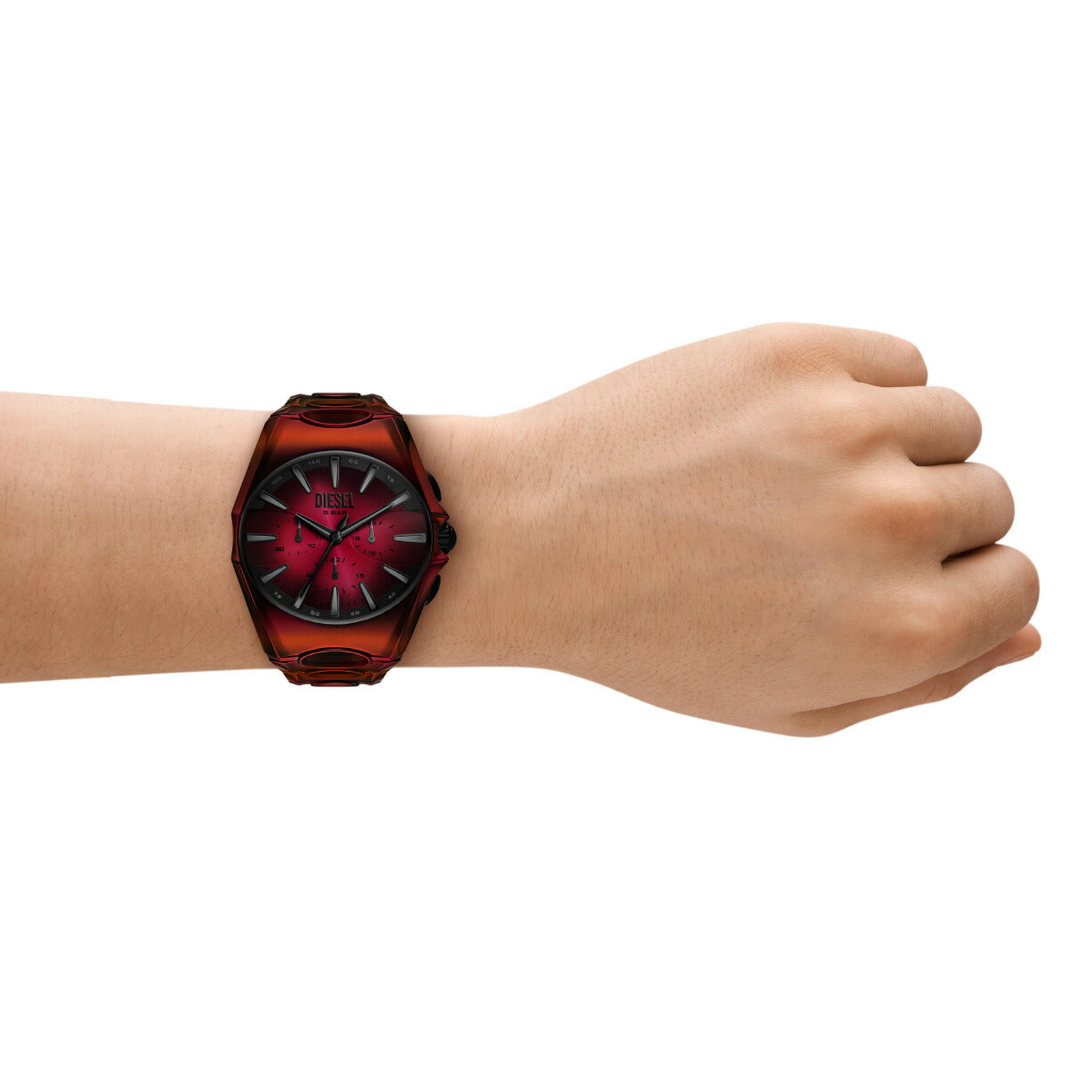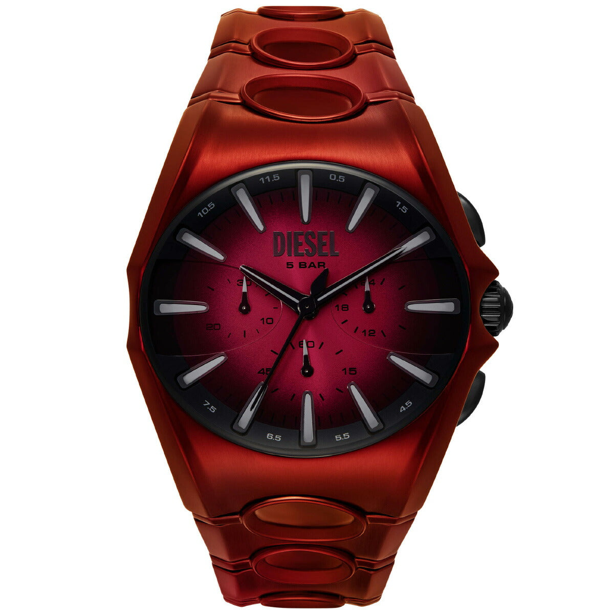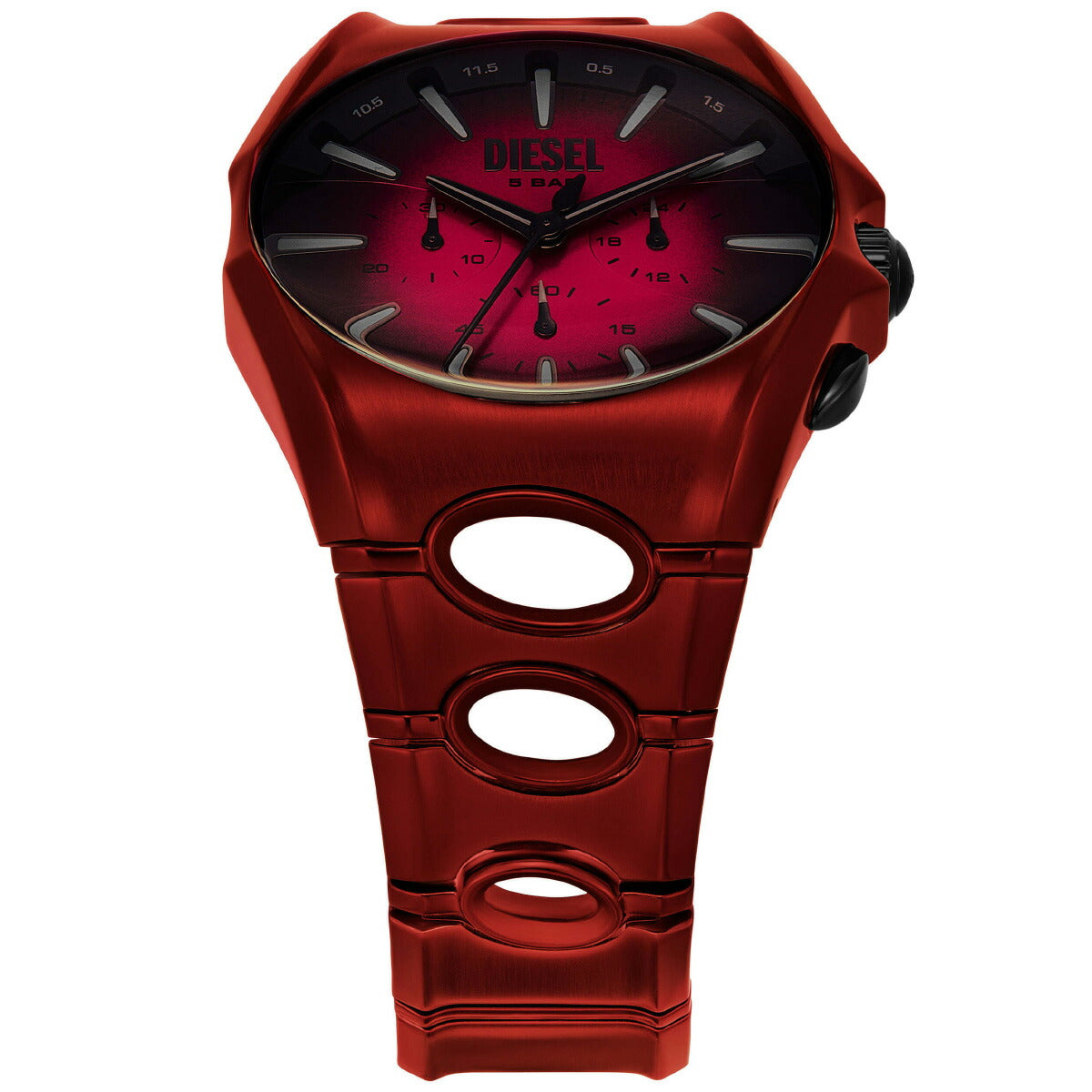 DIESELの48mm d-curveウォッチ。レッド&ブラックグラデーションのサンレイダイヤル、クロノグラフムーブメント、円形のカットアウトがさらにユニークなレッドのステンレススチール製ブレスレットが特徴です。