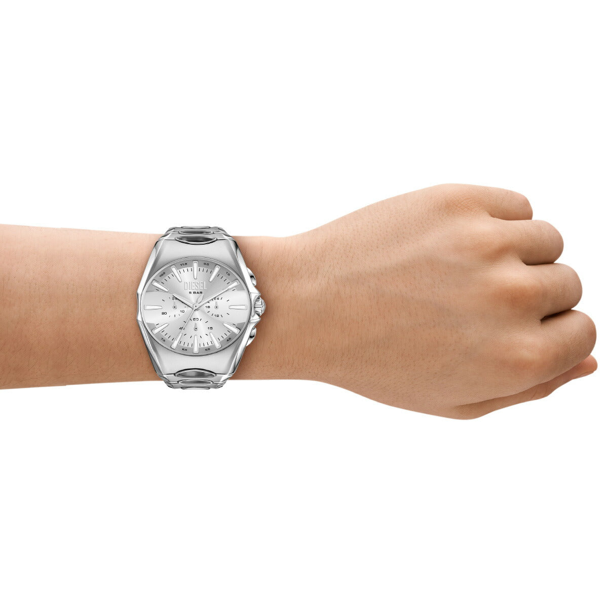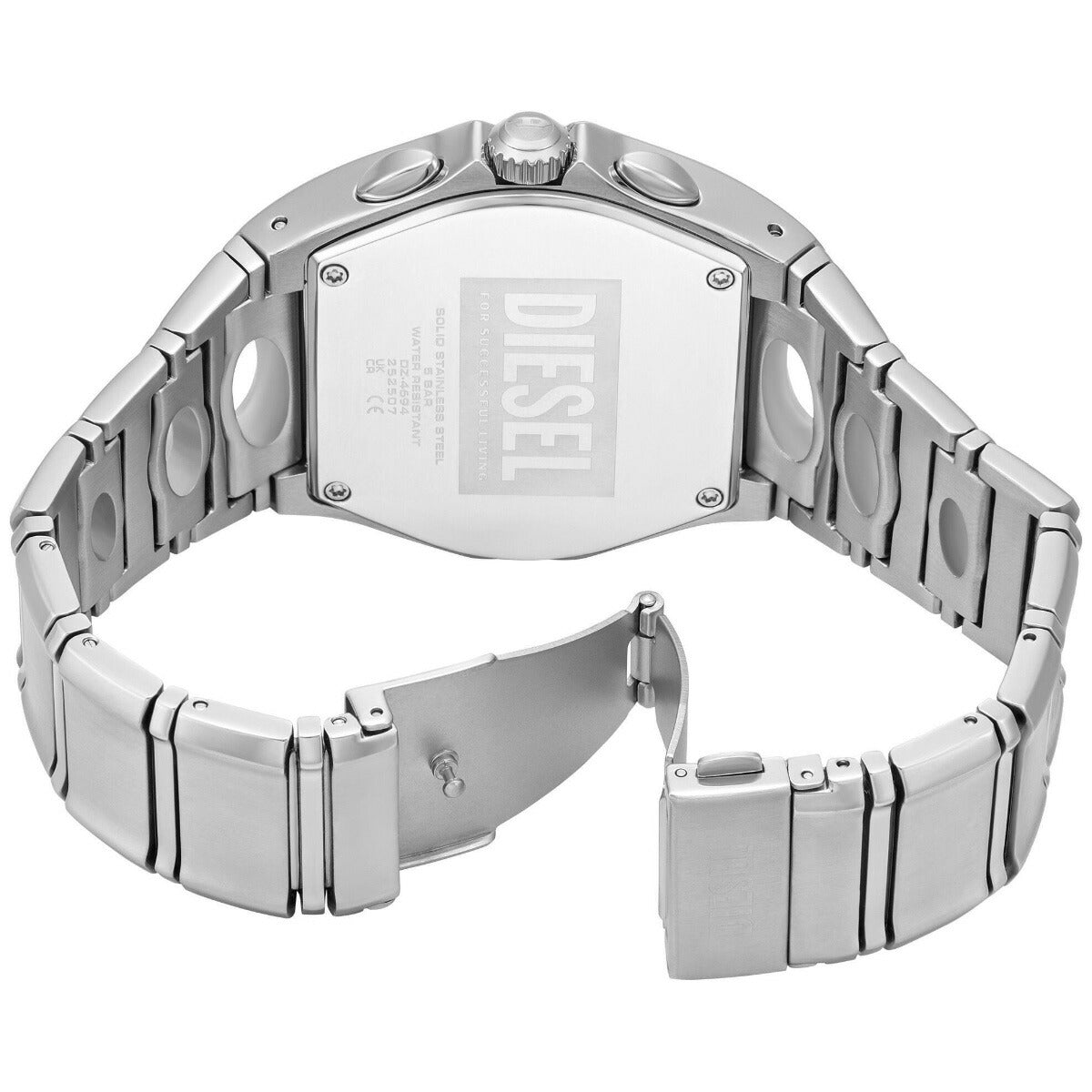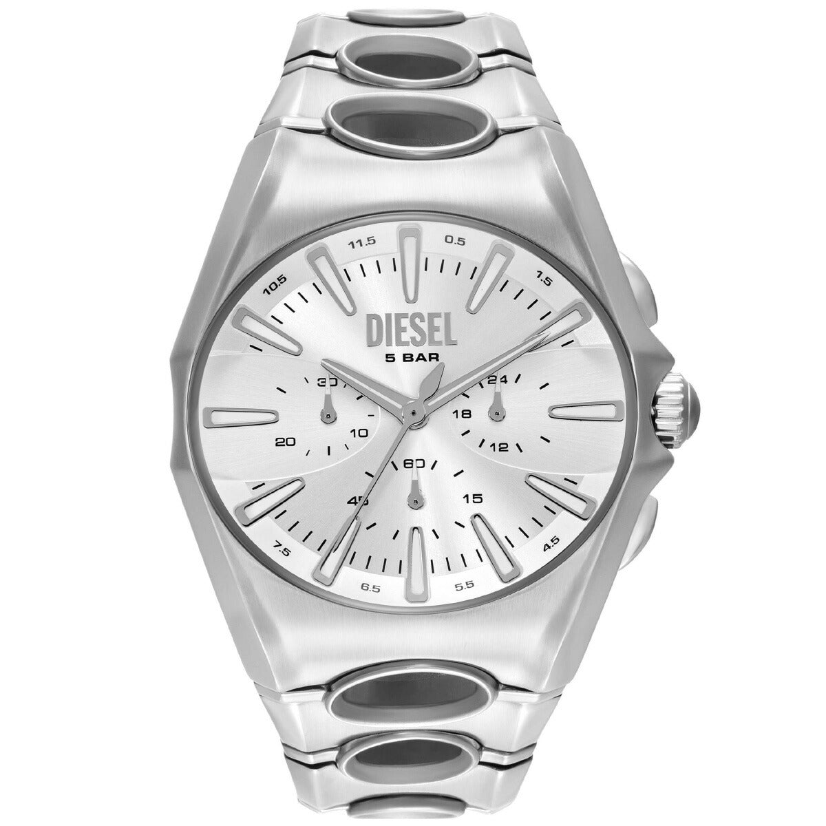 DIESELの48mm D-Curveウォッチ。シルバーのサンレイダイヤル、クロノグラフムーブメント、円形のカットアウトでよりユニークになったステンレススチール製ブレスレットが特徴です。