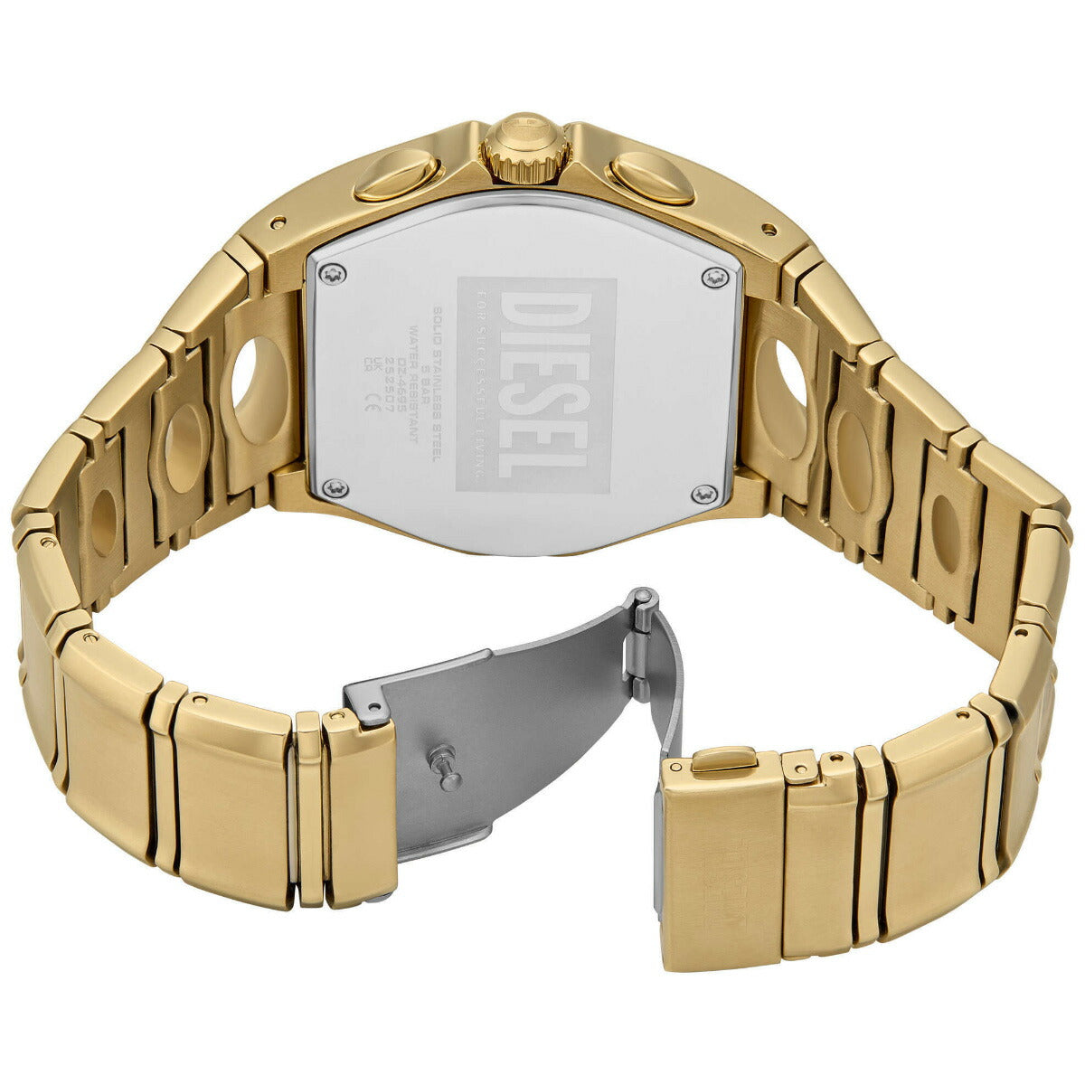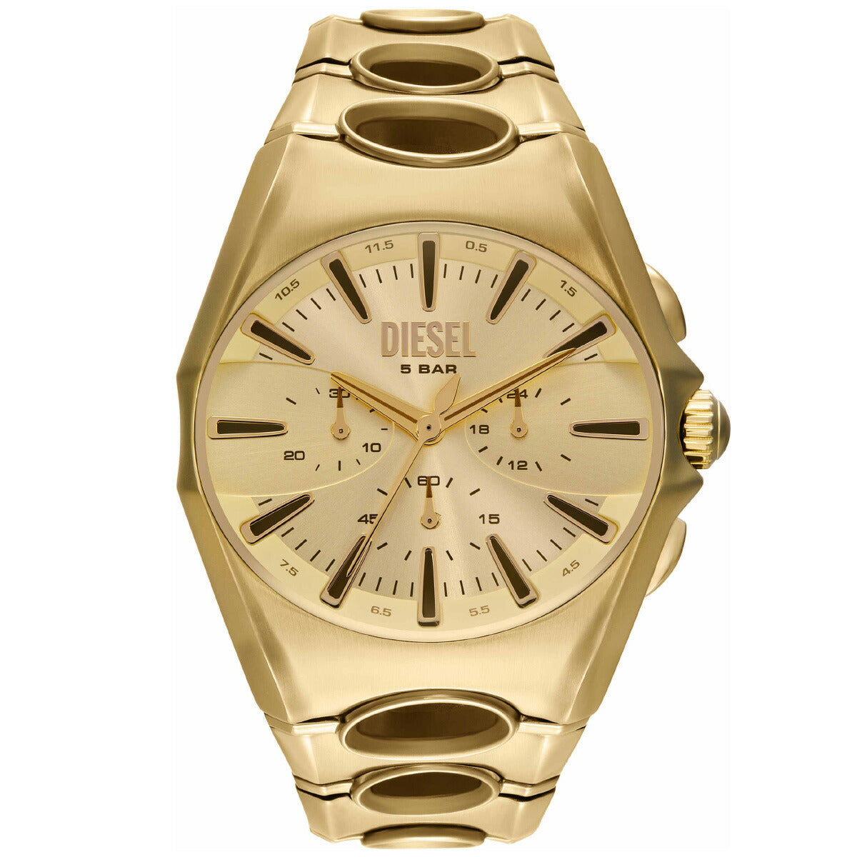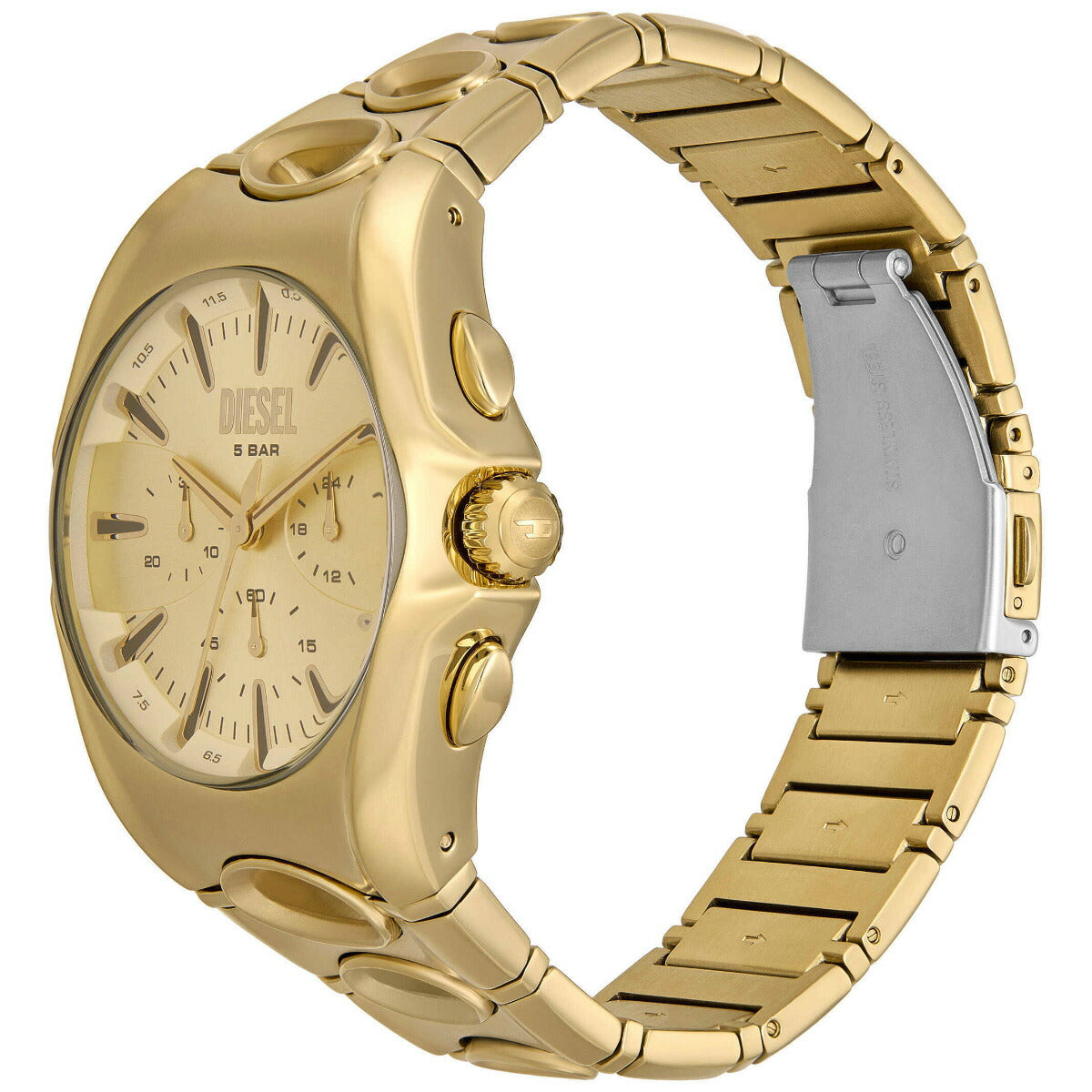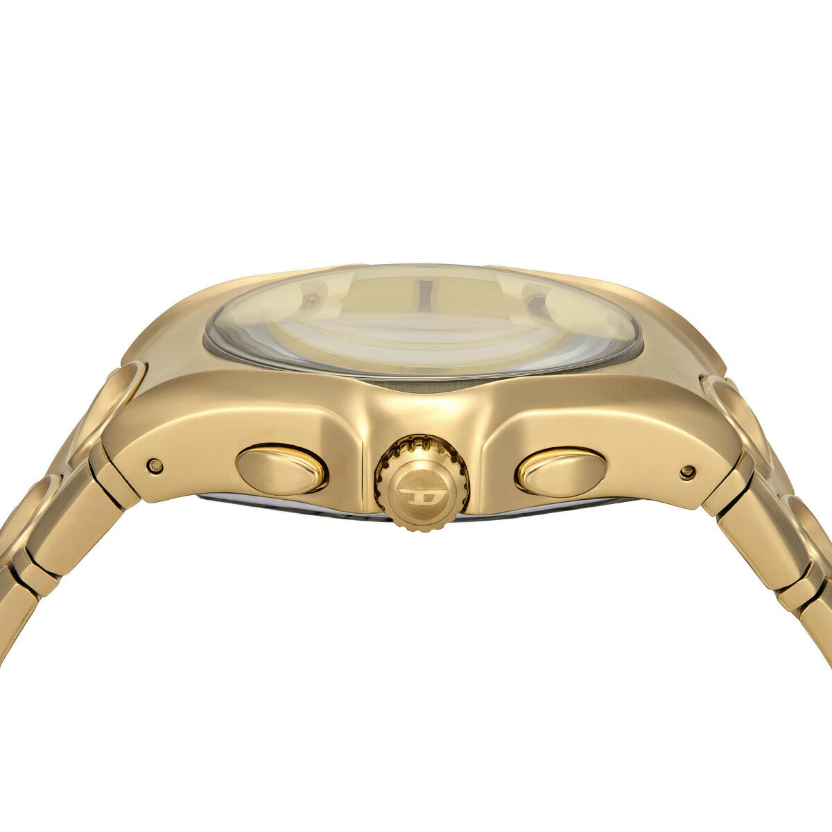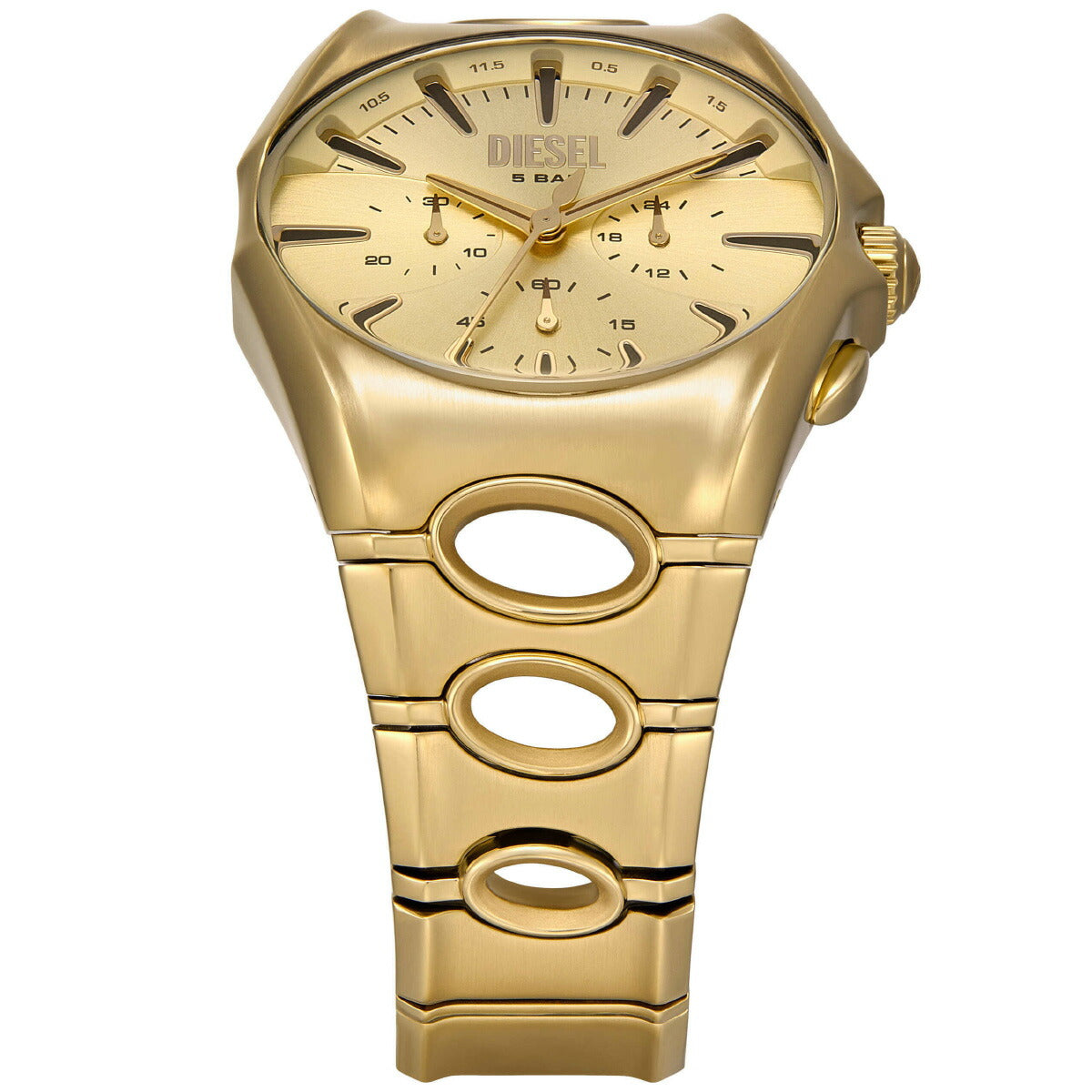 DIESELの48mm D-Curveウォッチ。ゴールドトーンのサンレイダイヤル、クロノグラフムーブメント、円形のカットアウトでよりユニークになったゴールドトーンのステンレススチール製ブレスレットが特徴です。
