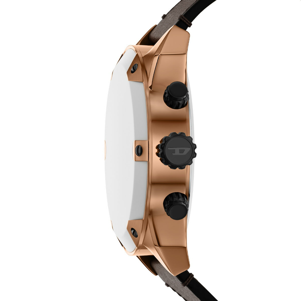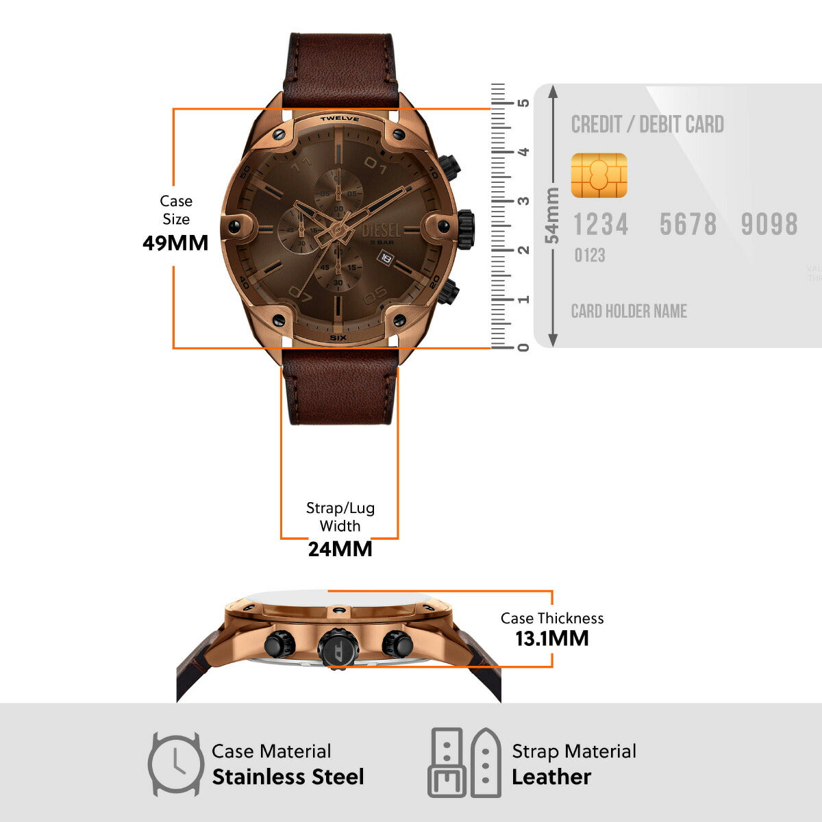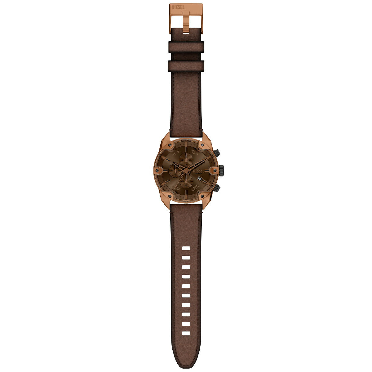 49mm径のケースにクロノグラフムーブメントを搭載したDIESELのSPIKEDウォッチ。ブラウンのサンレイ&ポリッシュ仕上げダイヤルに、ブラウンのレザーストラップを組み合わせました。