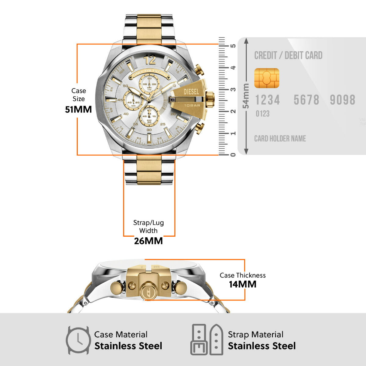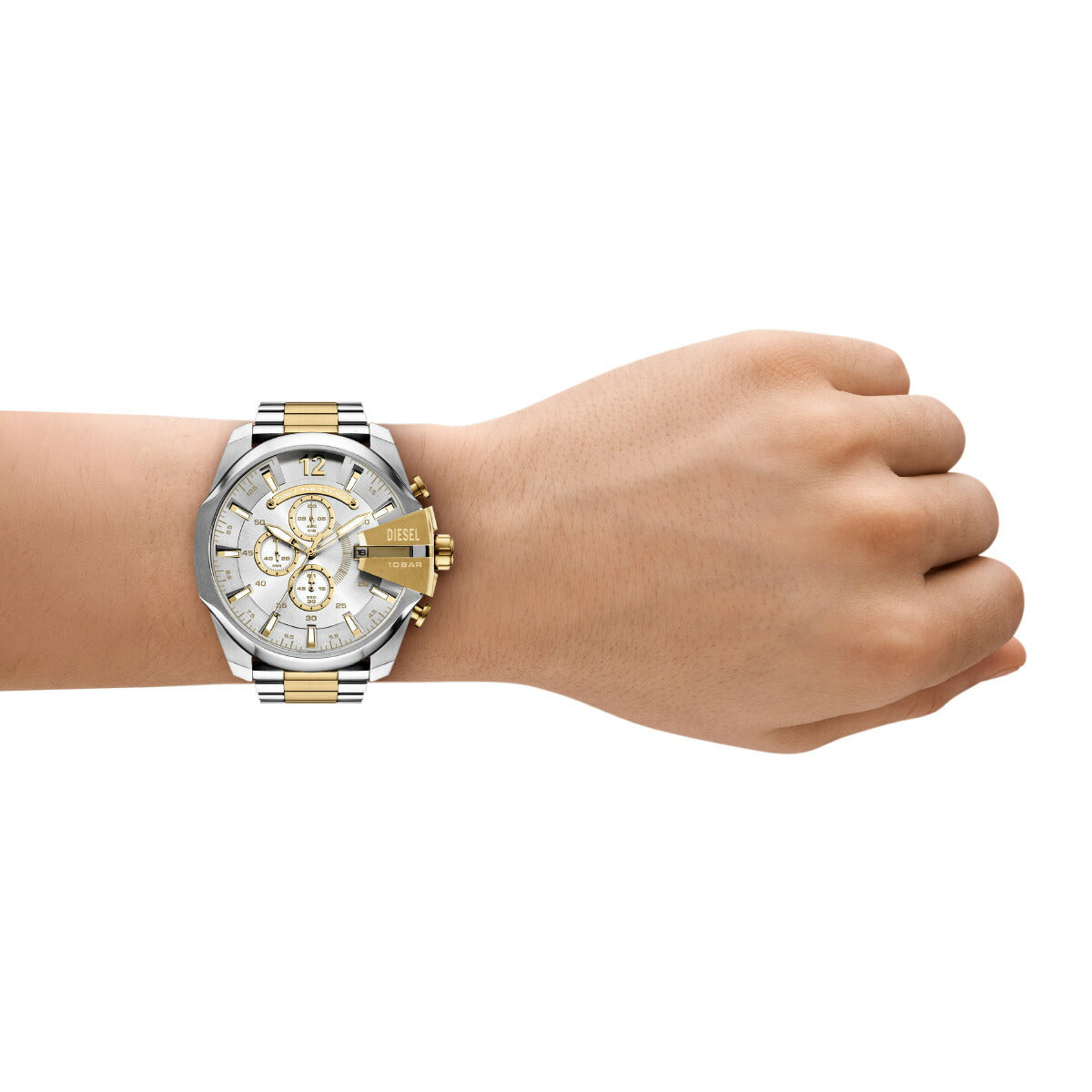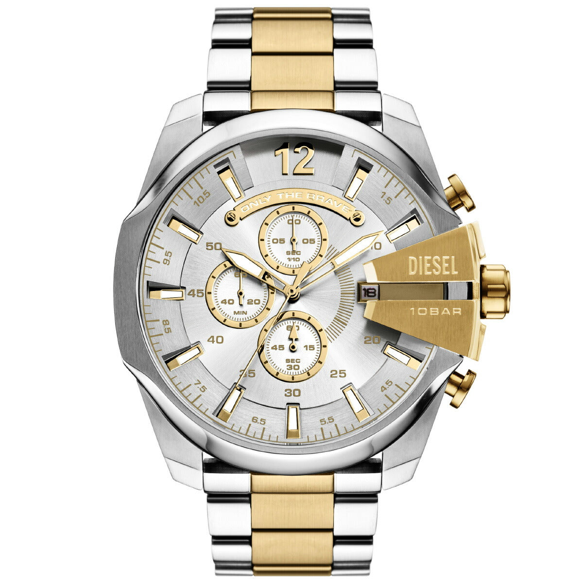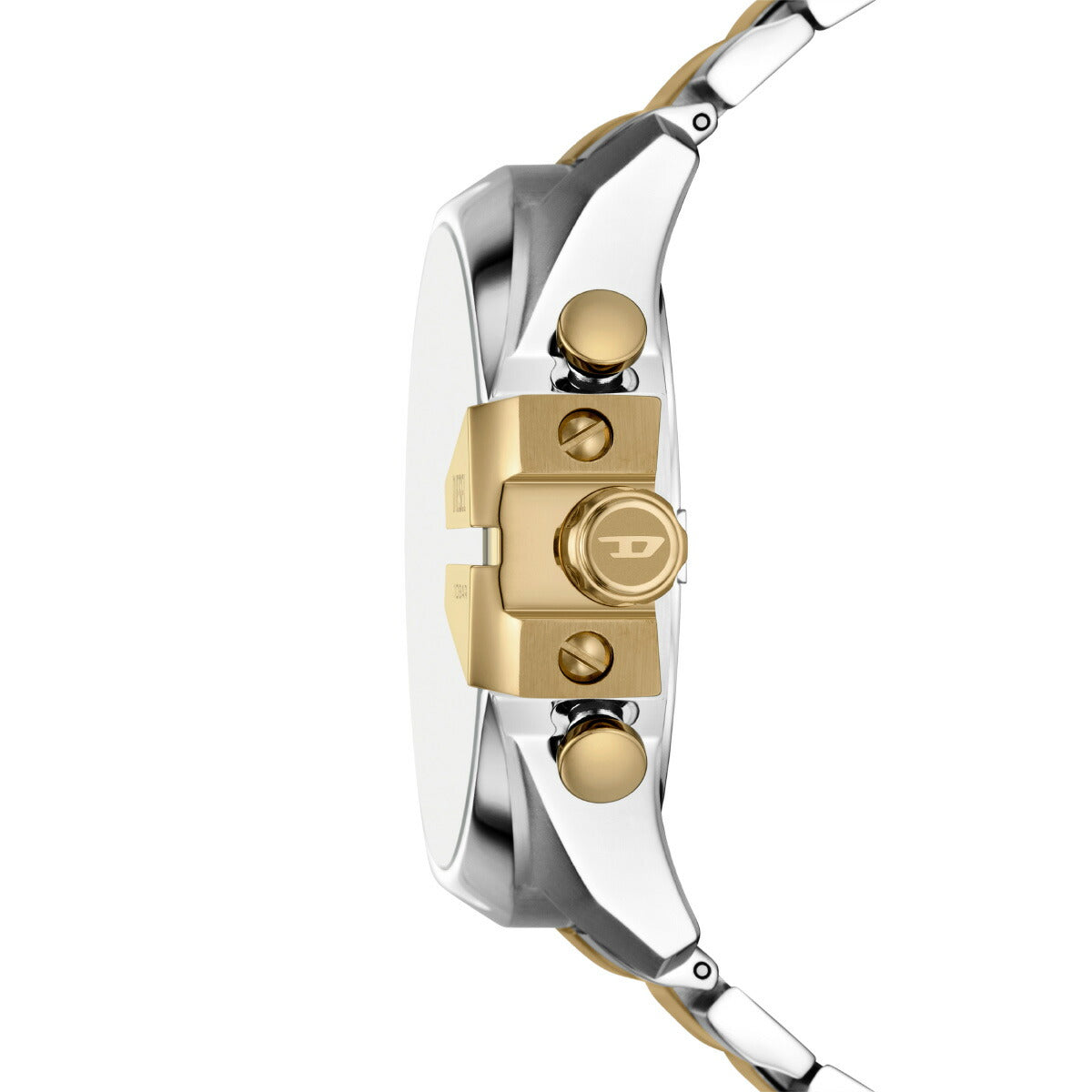 51mm径のケースにクロノグラフムーブメントを搭載したDIESELのMEGA CHIEFウォッチ。サンレイ仕上げとブラッシュ仕上げを施したツートーンダイヤルと、ゴールド&シルバートーンのステンレススチール製ブレスレットを組み合わせました。