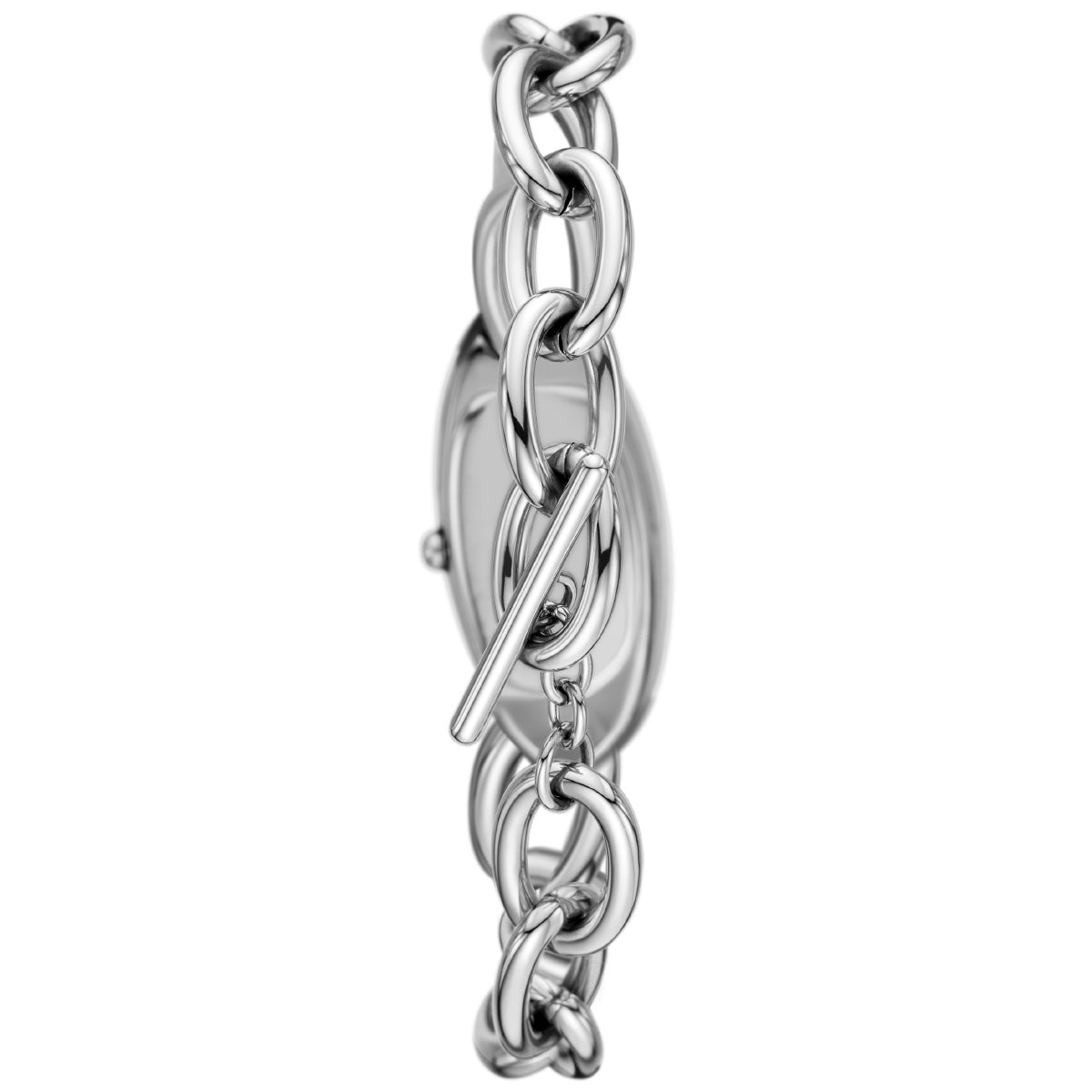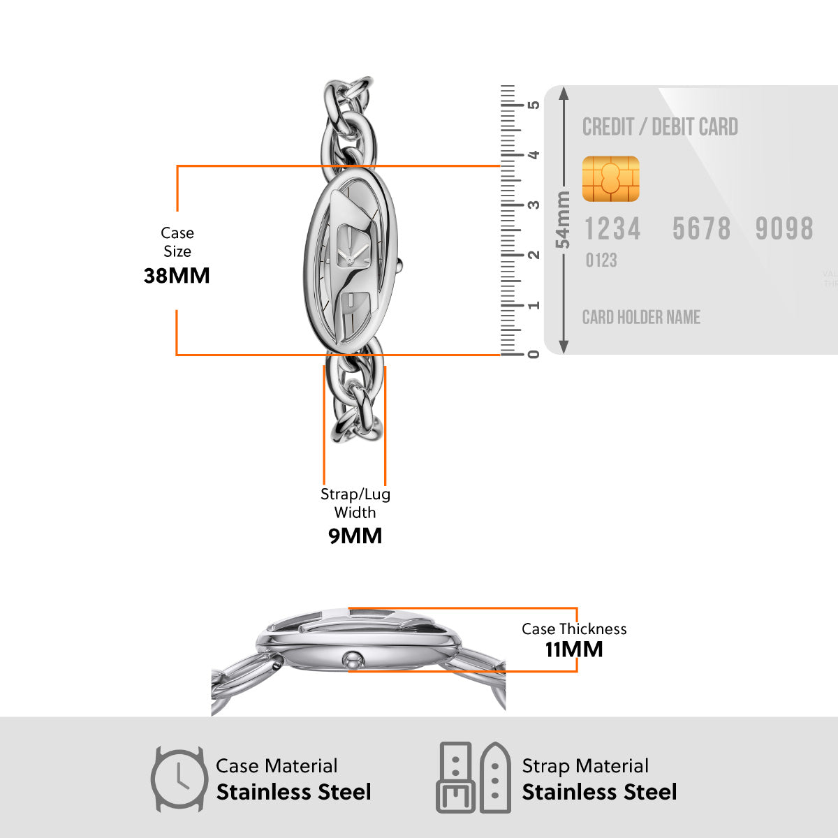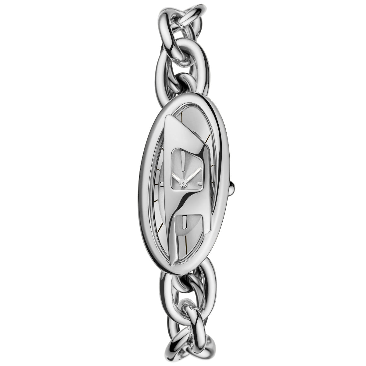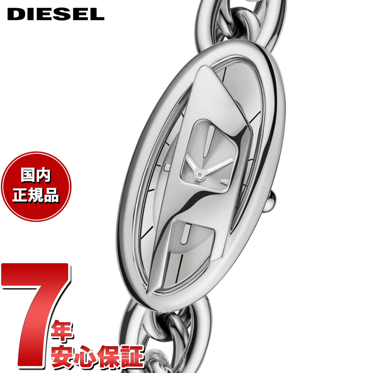 38mm径のケースに二針ムーブメントを搭載したDieselのD-ERAウォッチ。シルバートーンの艶出しサンレイダイヤルに、ステンレススチールブレスレットを組み合わせました。