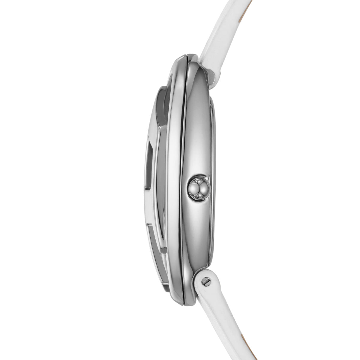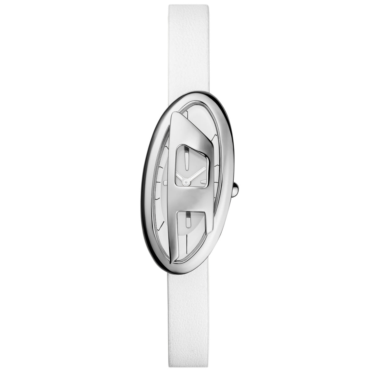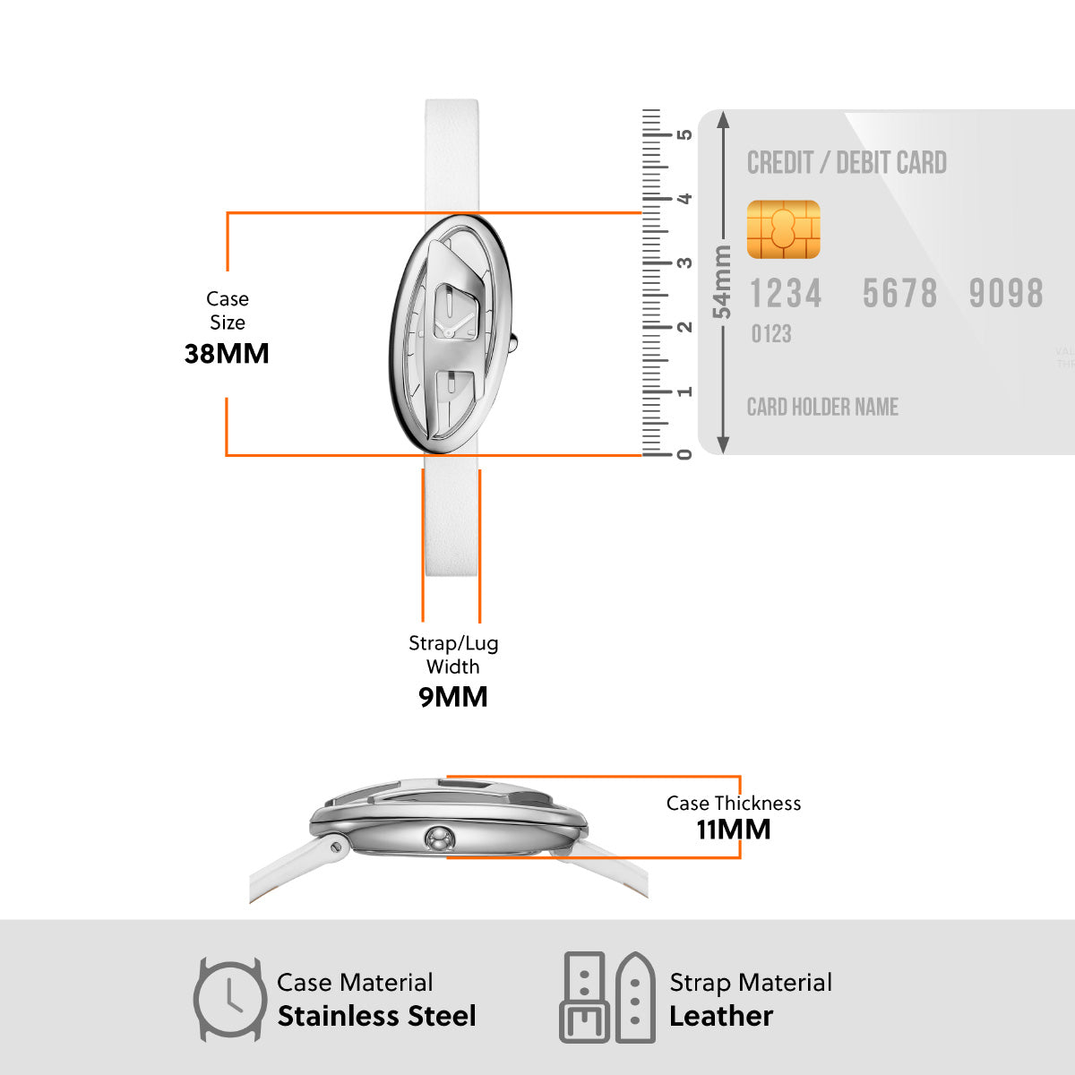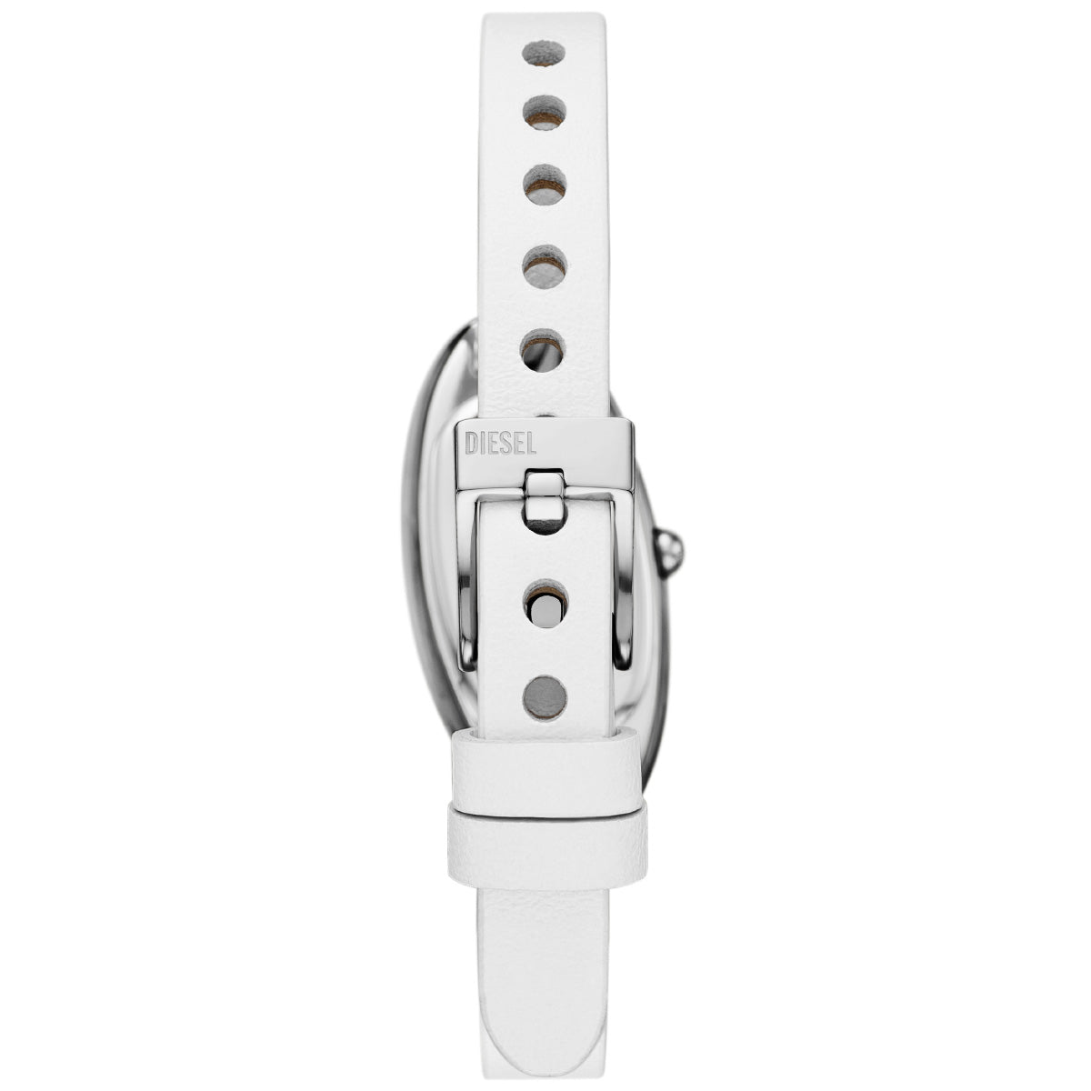 38mm径のケースに二針ムーブメントを搭載したDieselのD-ERAウォッチ。ホワイトのダイヤルに、ホワイトのレザーストラップを組み合わせました。