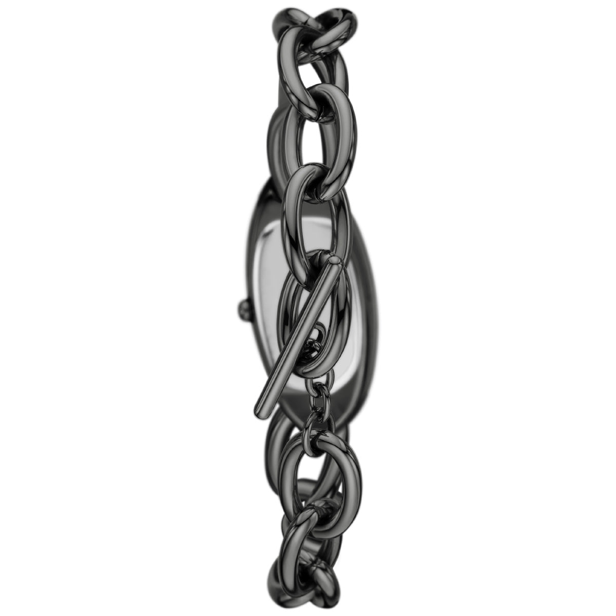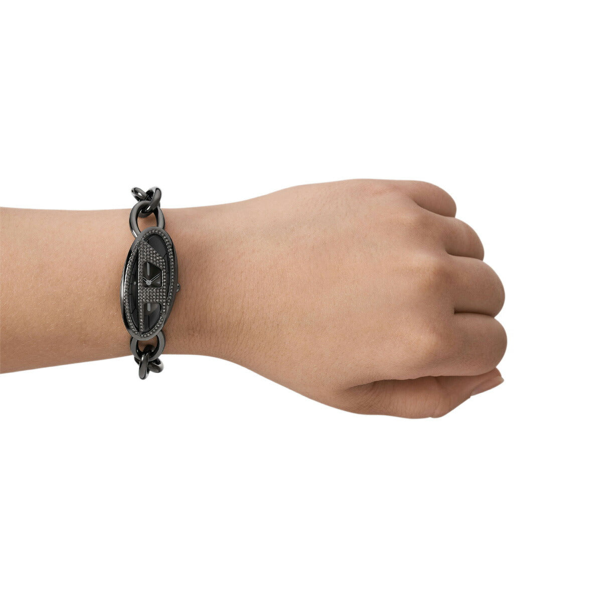38mm径のケースに二針ムーブメントを搭載したDieselのD-ERAウォッチ。ブラックの艶出しサンレイダイヤルに、パヴェディテールをあしらったガンメタルのステンレススチールブレスレットを組み合わせました。