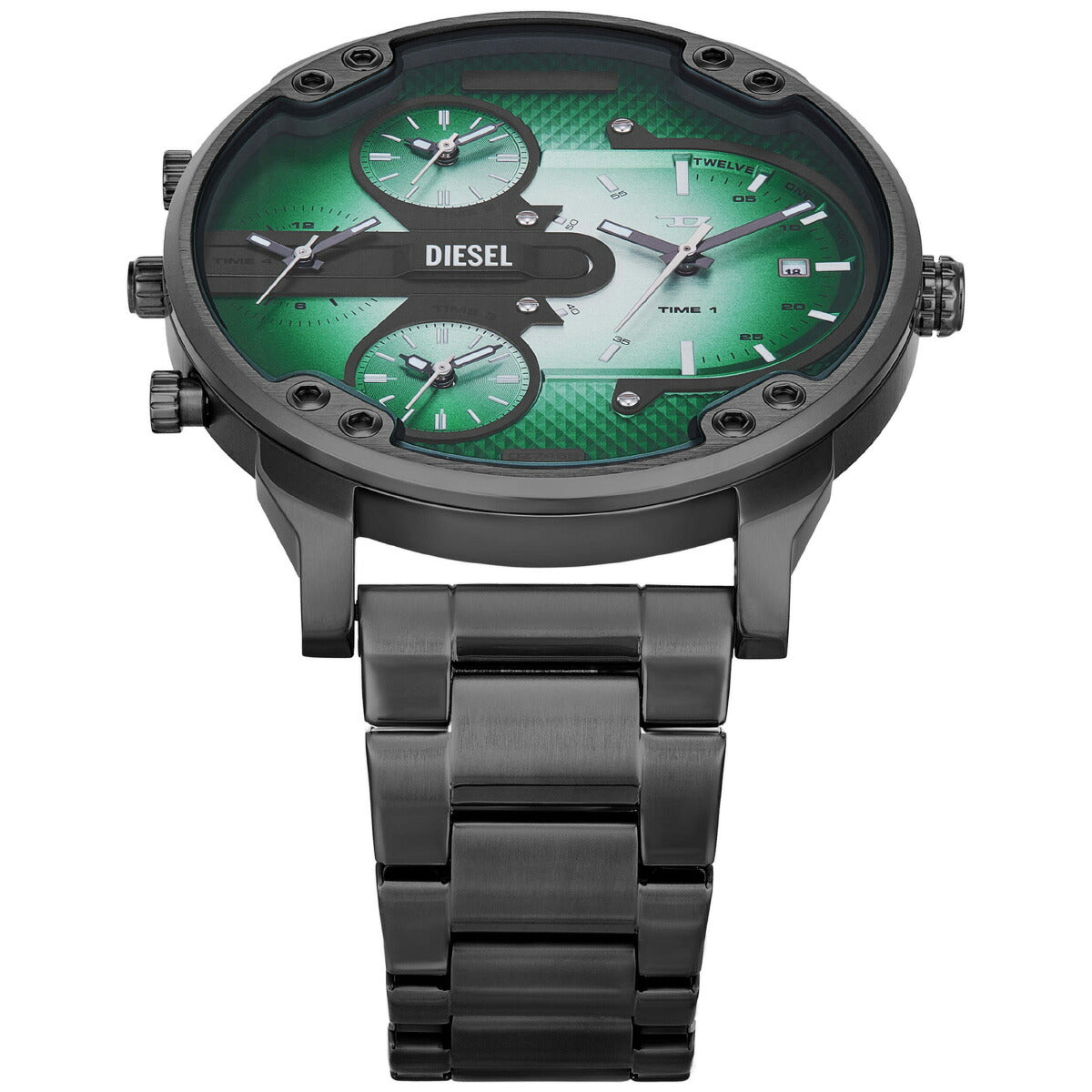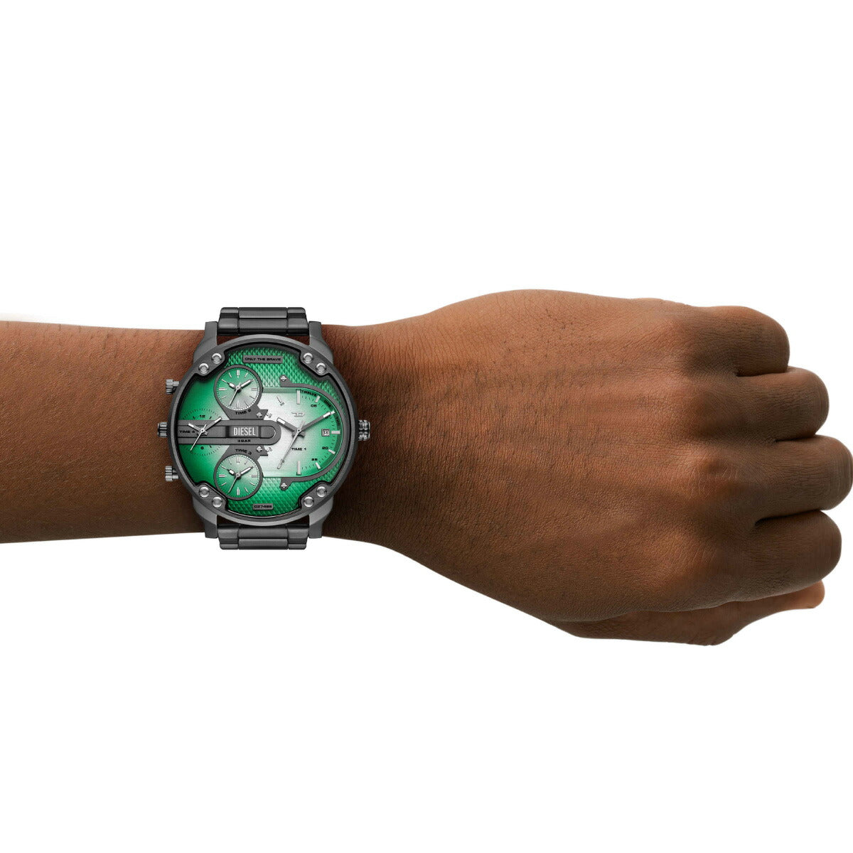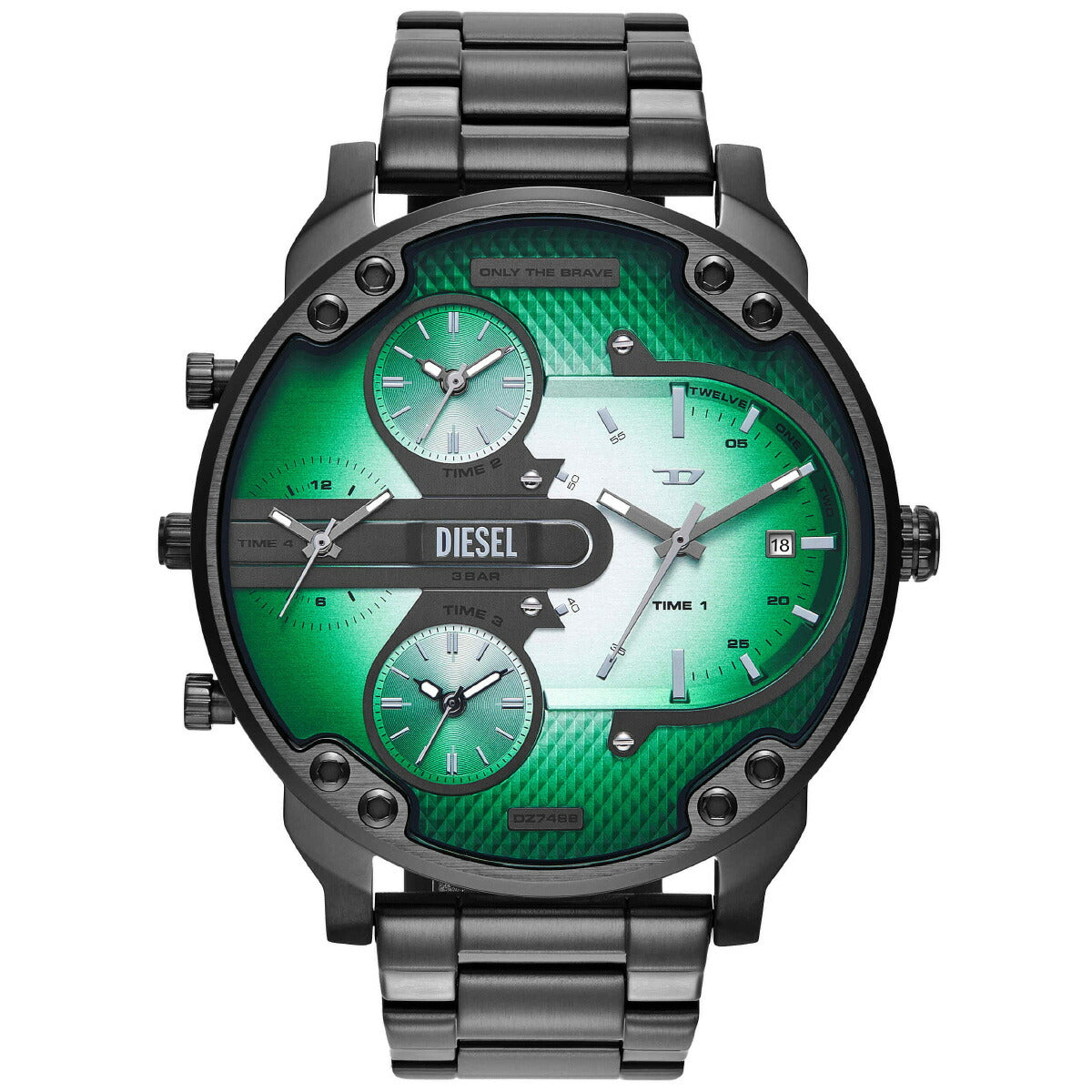 54mm径のケースにマルチムーブメントを搭載した、DieselのMR. DADDY SLIMウォッチ。グリーン&ホワイトのダイヤルに、ガンメタルのステンレススチールブレスレットを組み合わせました。