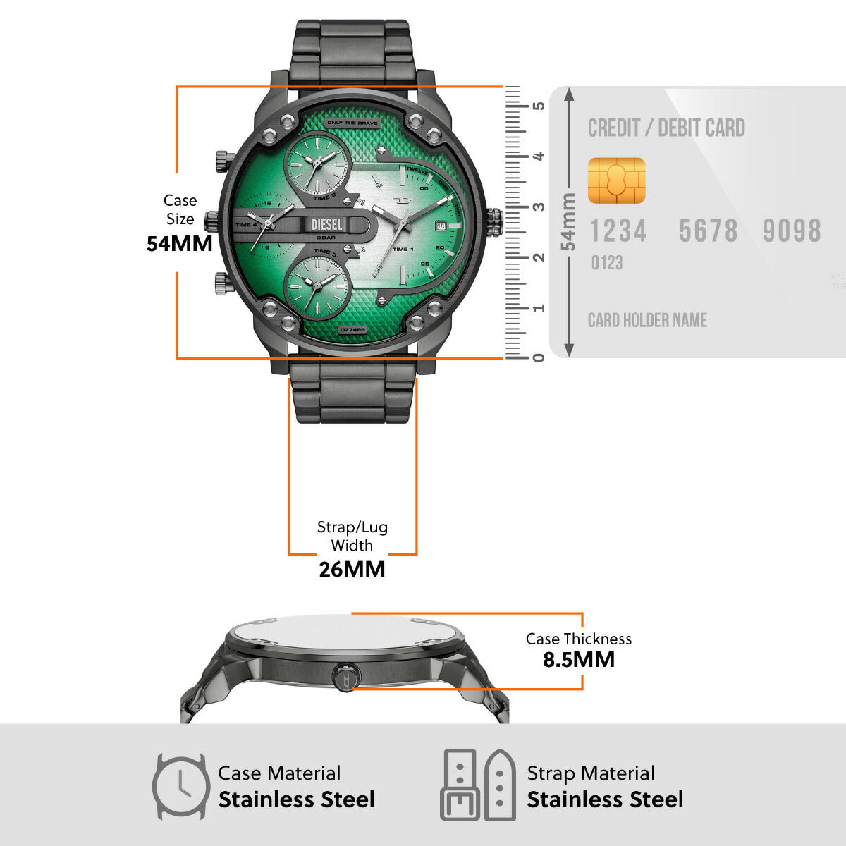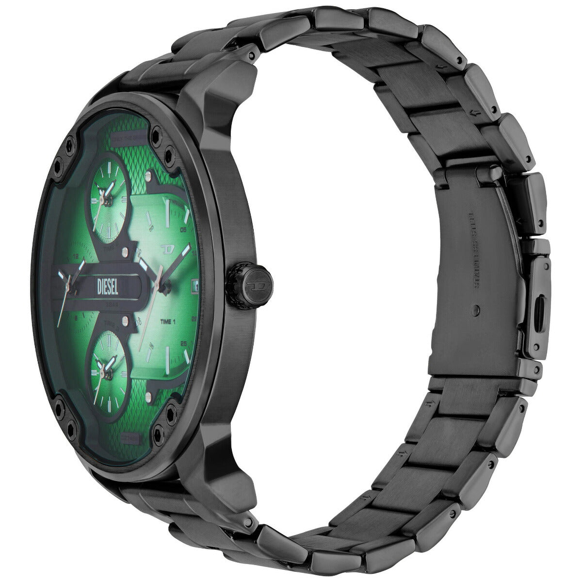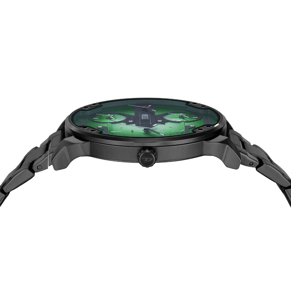 54mm径のケースにマルチムーブメントを搭載した、DieselのMR. DADDY SLIMウォッチ。グリーン&ホワイトのダイヤルに、ガンメタルのステンレススチールブレスレットを組み合わせました。
