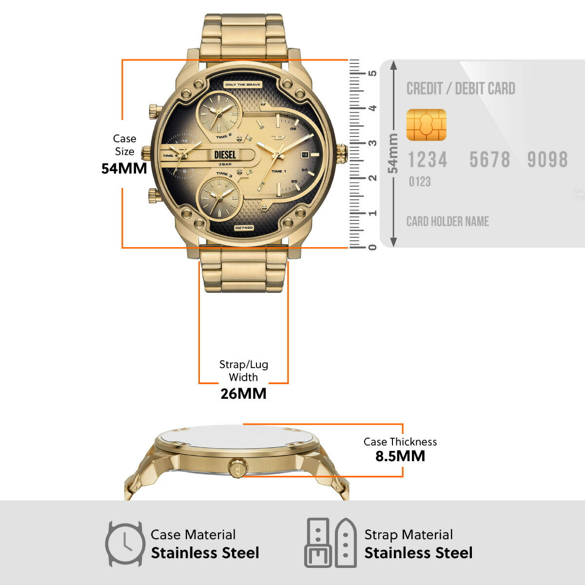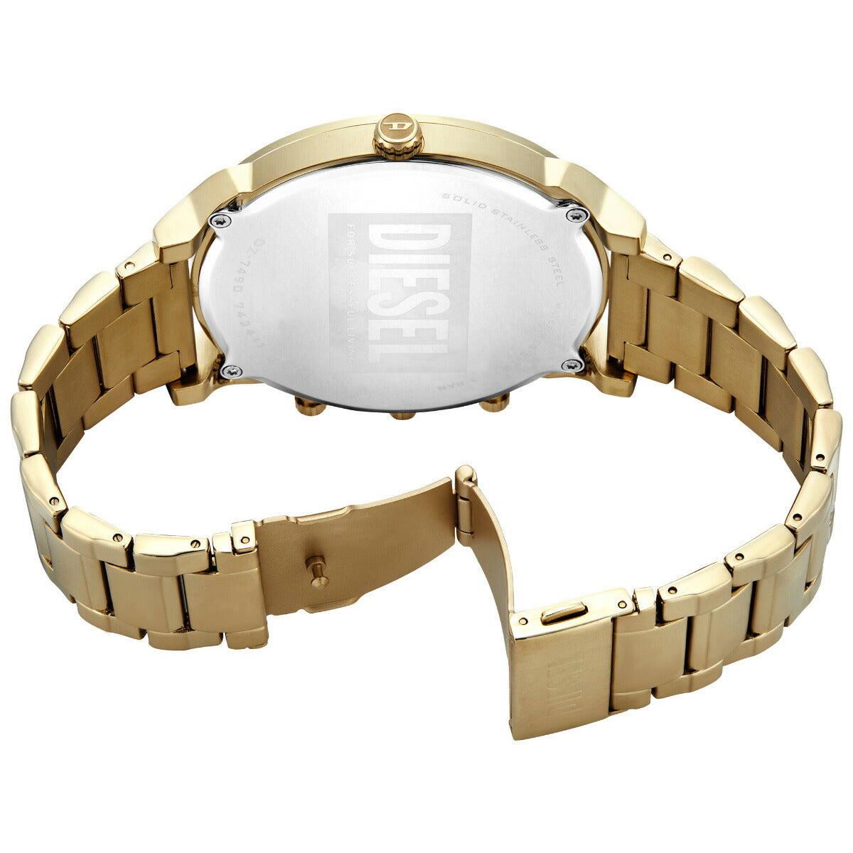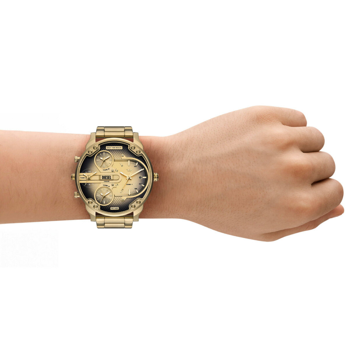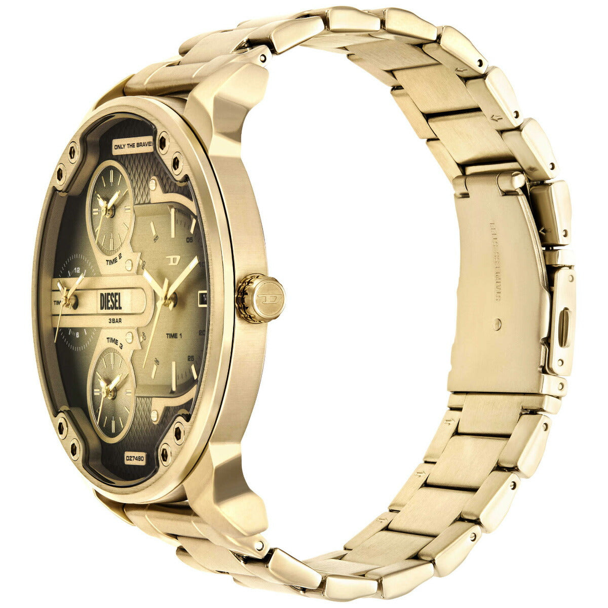 54mm径のケースにマルチムーブメントを搭載したDieselのMR. DADDY SLIMウォッチ。ブラック&ゴールドトーンのダイヤルに、ゴールドトーンのステンレススチールブレスレットを組み合わせました。