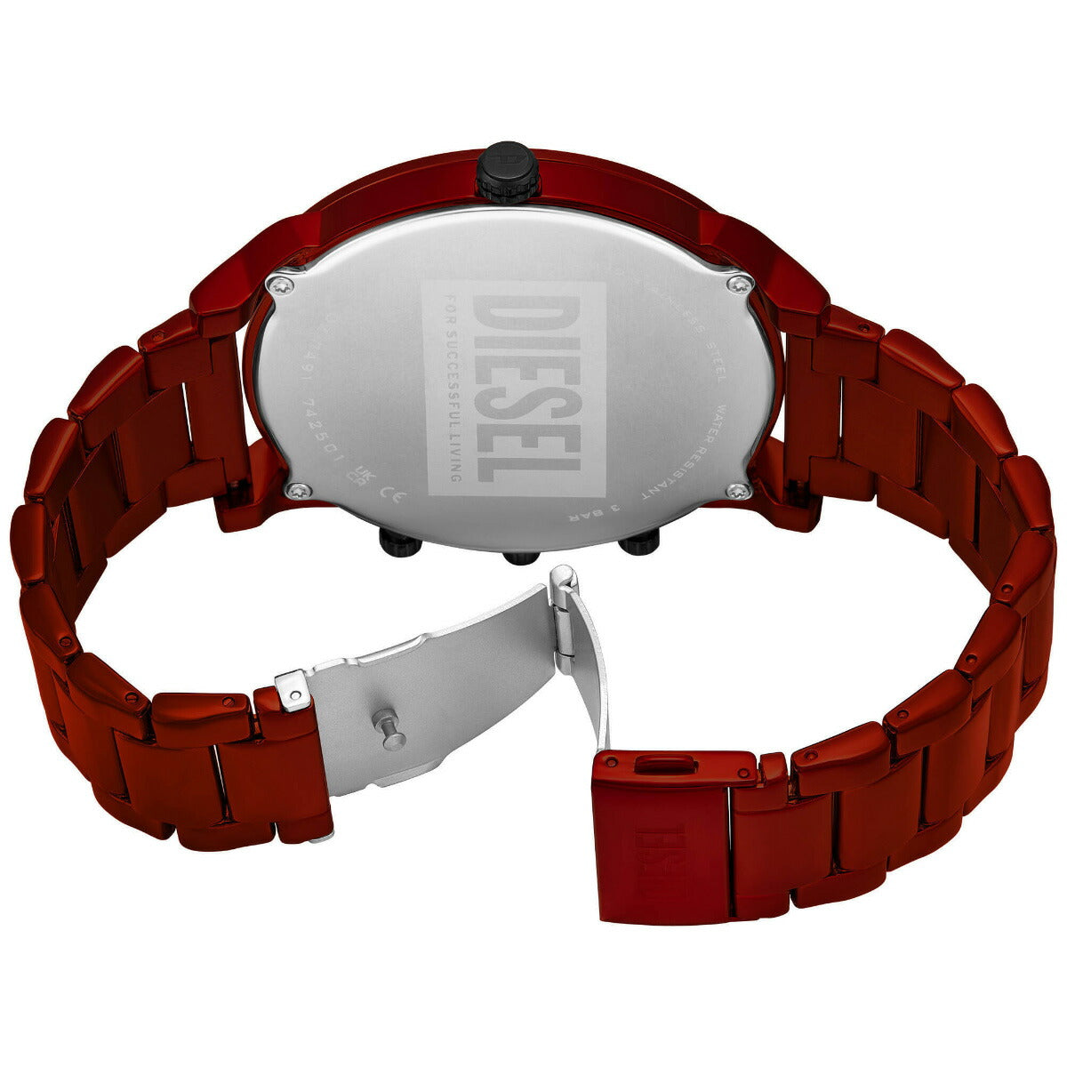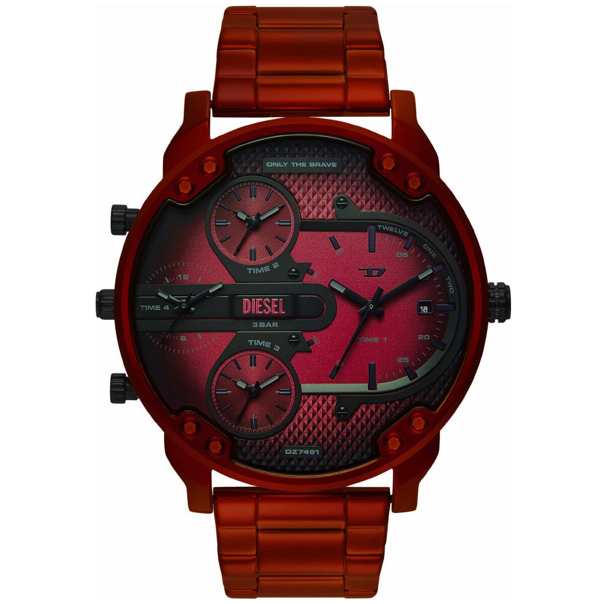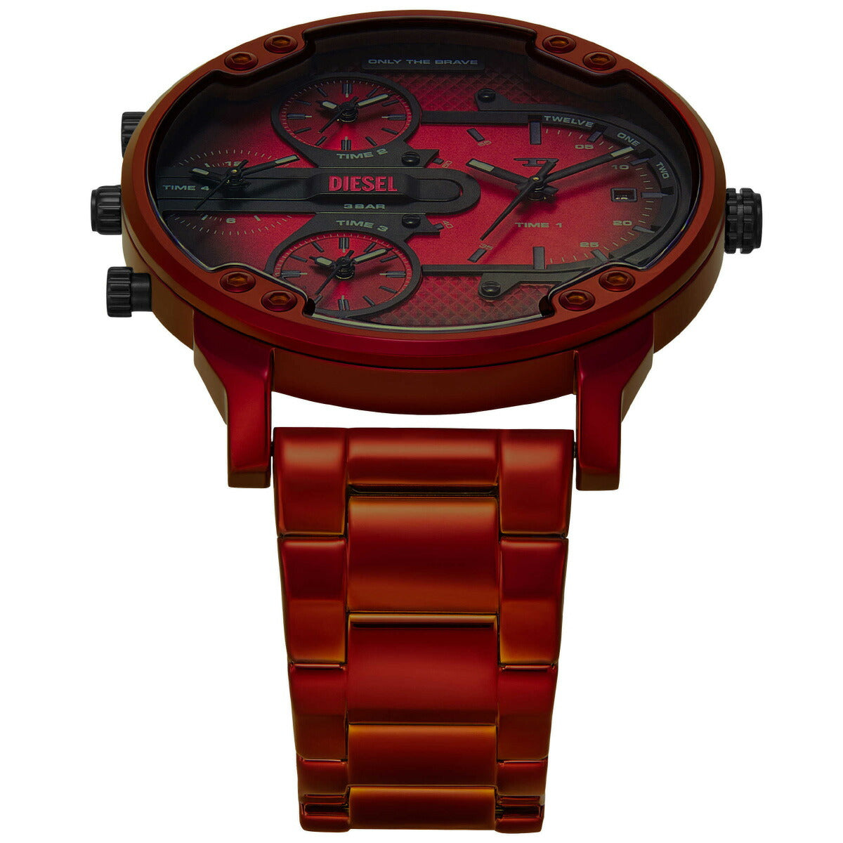 DIESELの54mm Mr. Daddy Slimウォッチ。レッド&ブラックグラデーションのサンレイダイヤル、複数の時間を設定できるムーブメント、レッドのステンレススチール製ブレスレットが特徴です。