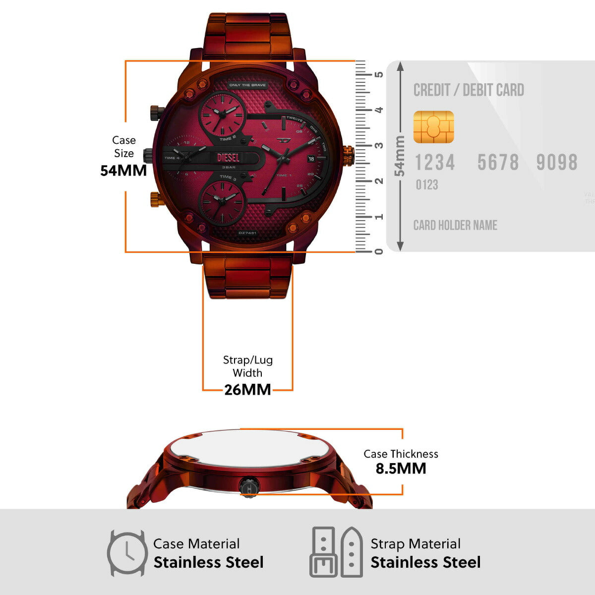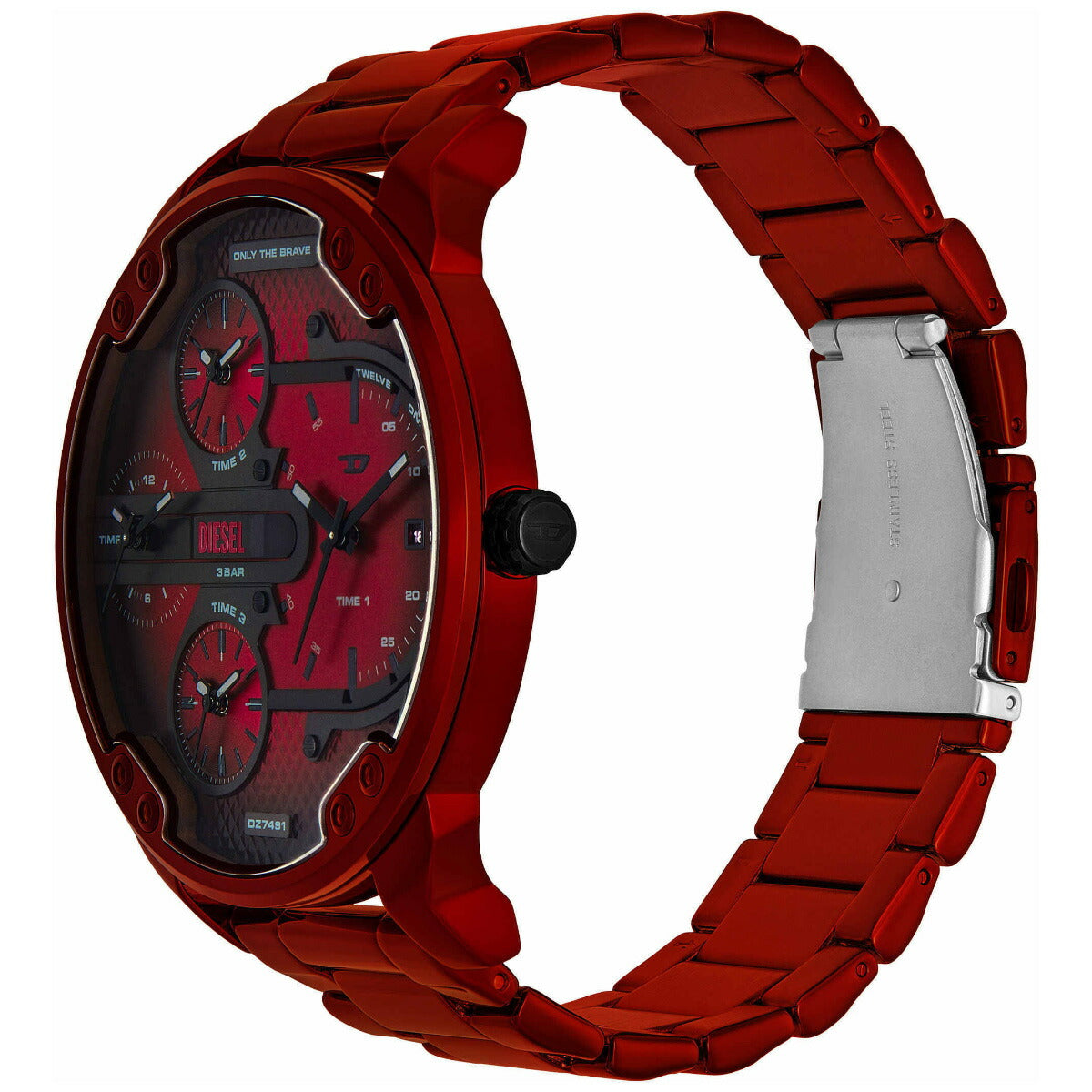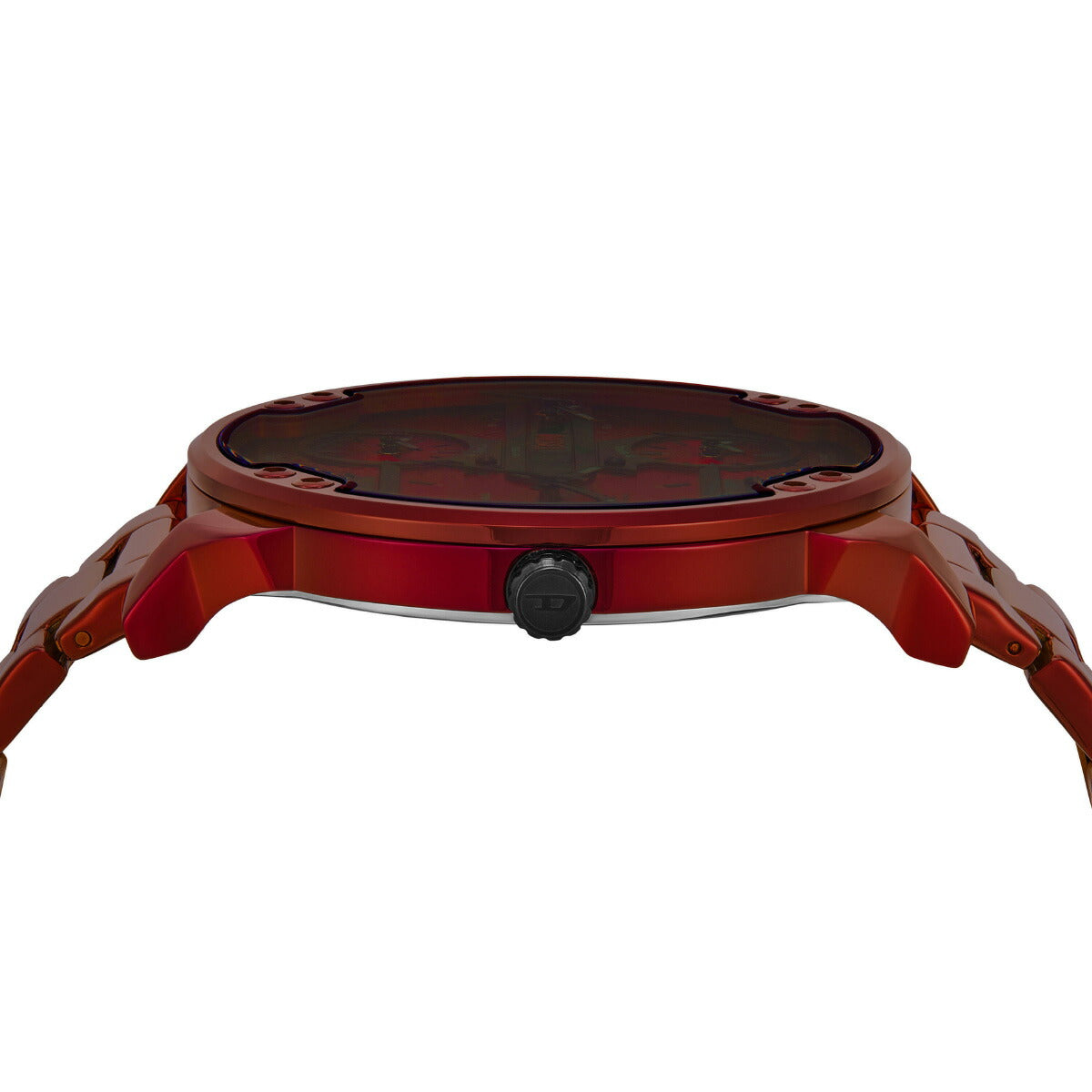 DIESELの54mm Mr. Daddy Slimウォッチ。レッド&ブラックグラデーションのサンレイダイヤル、複数の時間を設定できるムーブメント、レッドのステンレススチール製ブレスレットが特徴です。