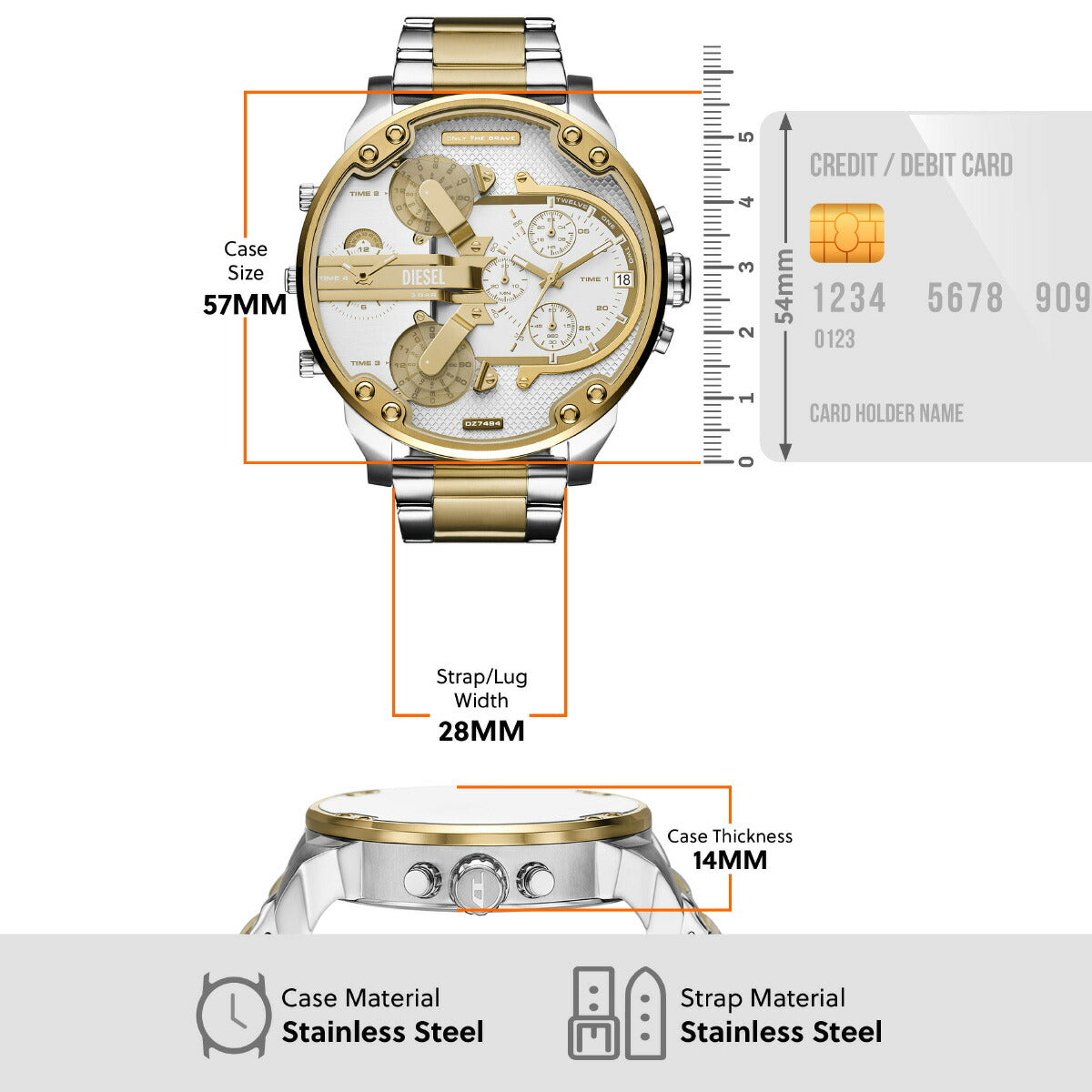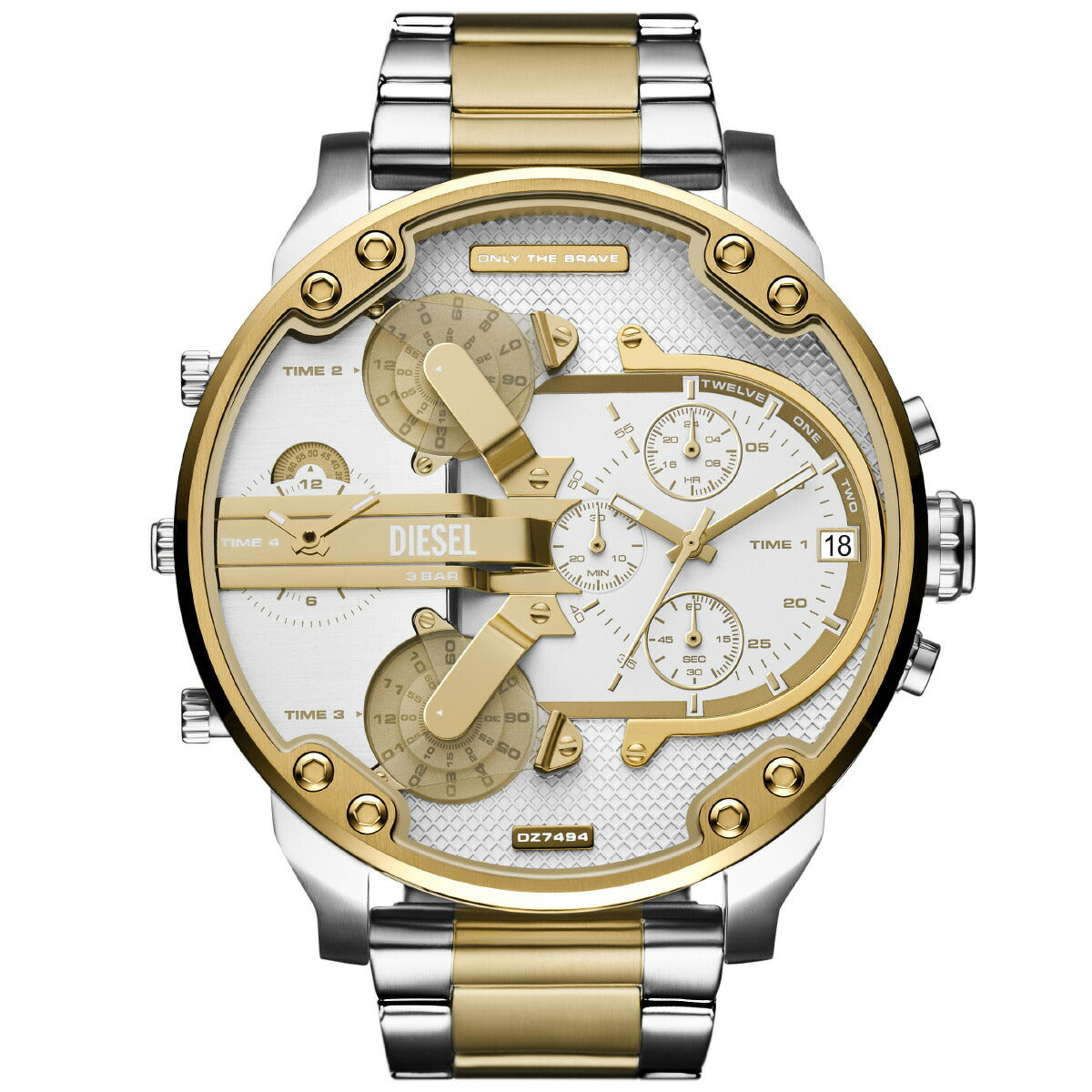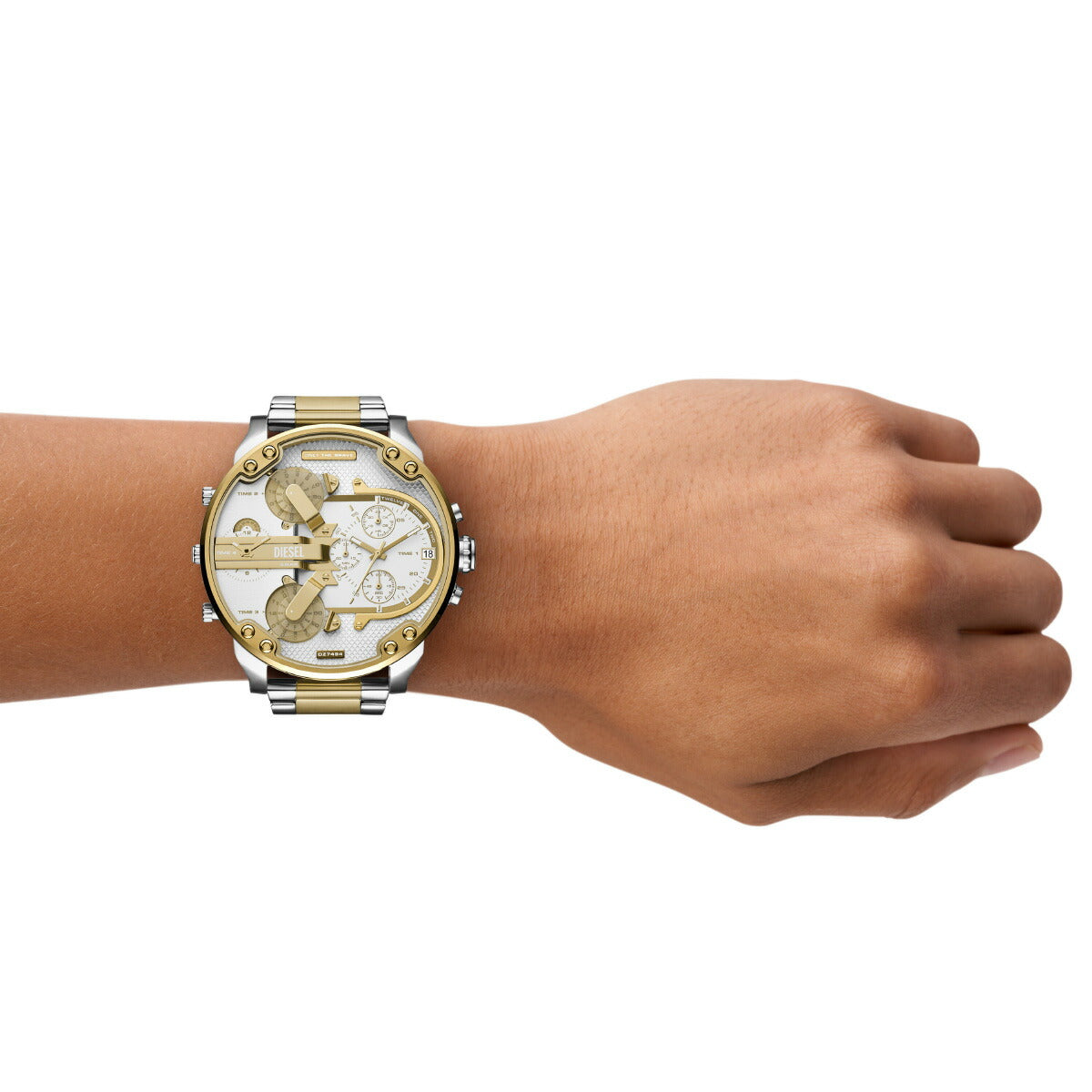 57mm径のケースに複数の時間を設定できるムーブメント機能を搭載した、DIESELのMR. DADDY 2.0ウォッチ。ポリッシュ仕上げとブラッシュ仕上げを施したツートーンダイヤルに、ゴールドとシルバートーンのステンレススチール製ブレスレットを組み合わせました。