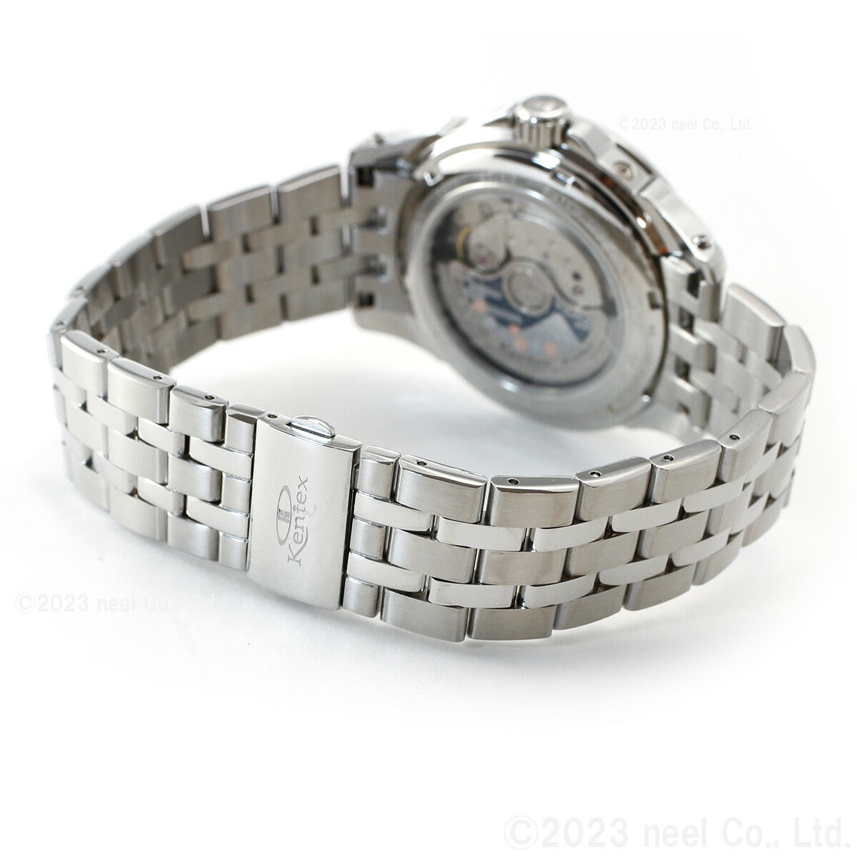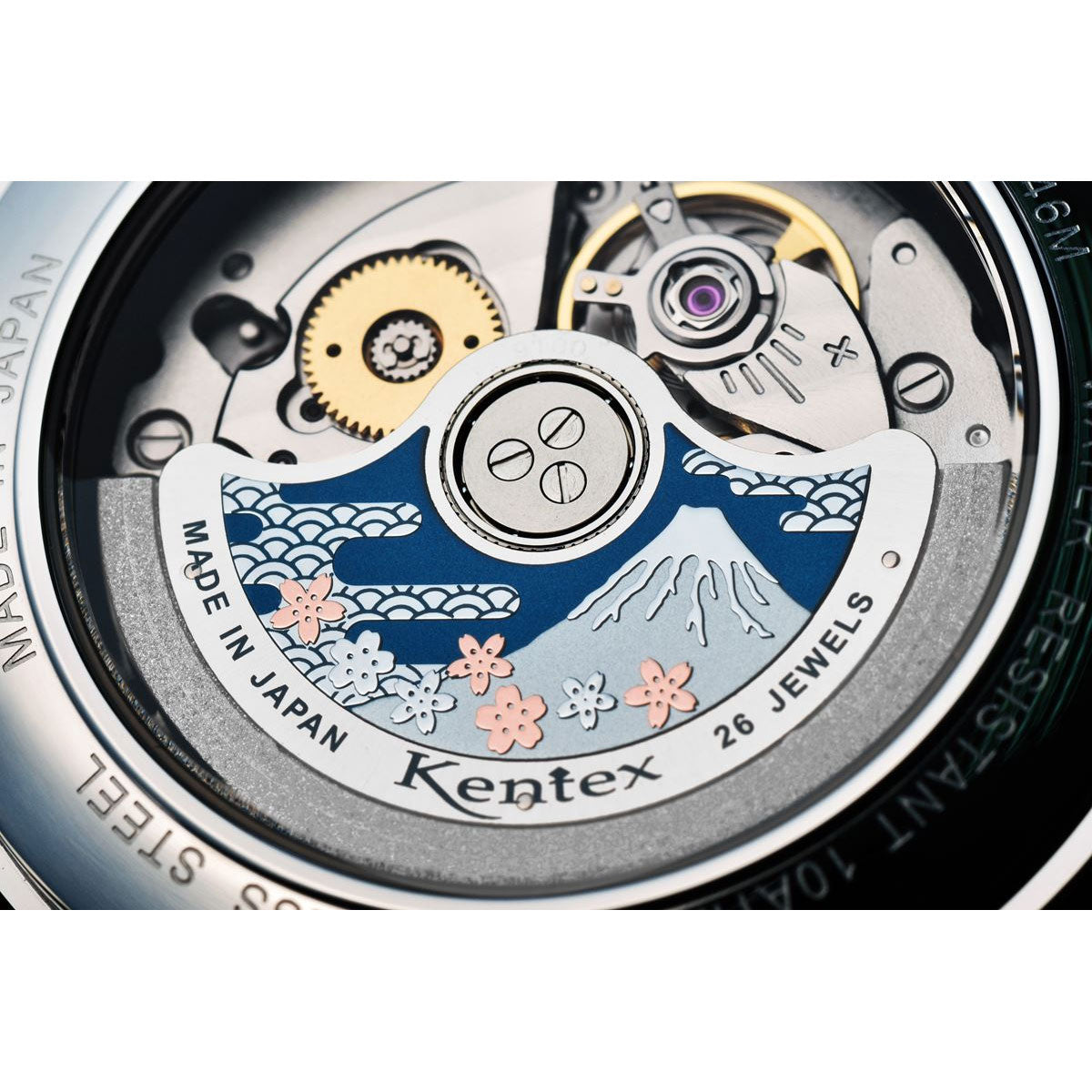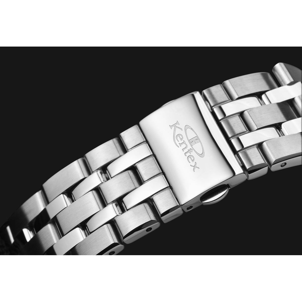 国産ハイビート、マルチファンクションの自動巻きモデル。高精度28800振動、26石のハイビートに、パワーリザーブ表示、日付、月、曜日表示も備えたマルチファンクション仕様で、Kentexが誇る本格自動巻き式のドレススポーツモデルとなっています。前作から、ラグ回りの加飾ピンに加えて、桜富士のローターデザインなど、ディテールデザインが更なる進化を遂げました。ケースはサジカルグレード(医療水準)のSUS316L高耐蝕性ステンレス材を使用。日本人の腕回りを考えたケース径41mmの適度なサイズ感で、オンオフ使いやすいドレッシーなスポーツモデルです。ハイビート、マルチファンクション、パワーリザーブ、秒針規制機能など、本格高性能の日本製ムーブメント仕様で、”一生もの”として持つにふさわしい自動巻き式時計。トップガラスは両面カーブサファイアと、無反射コーティング仕様で高い視認性を確保。文字盤は外周の渦目と、中心からの放射目が特徴的な緻密なギョウシェ彫り仕様。ドレスデザインでありながら、10気圧の本格防水性能で、アクティブなシーンでも安心して使用が可能。ローターには、桜富士をあしらったオリジナルデザインが施され、ディテールに込めた「和」の美しさが表現されている。裏蓋には、13桁の製品個別IDを刻印。CLUB-Kに製品IDを登録をすることで、定期点検、消耗部品交換、分解洗浄といったメンテナンスサービスをタイムリーに提供。