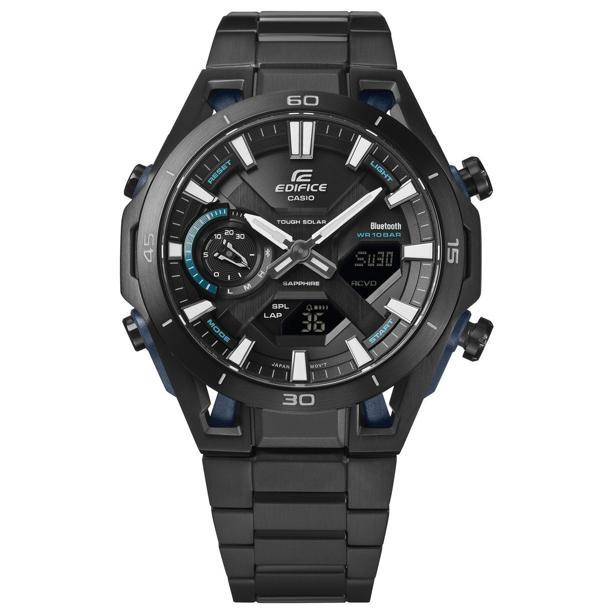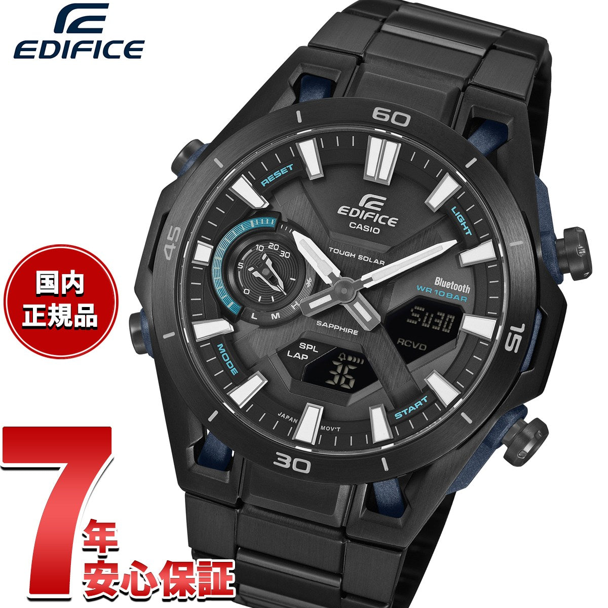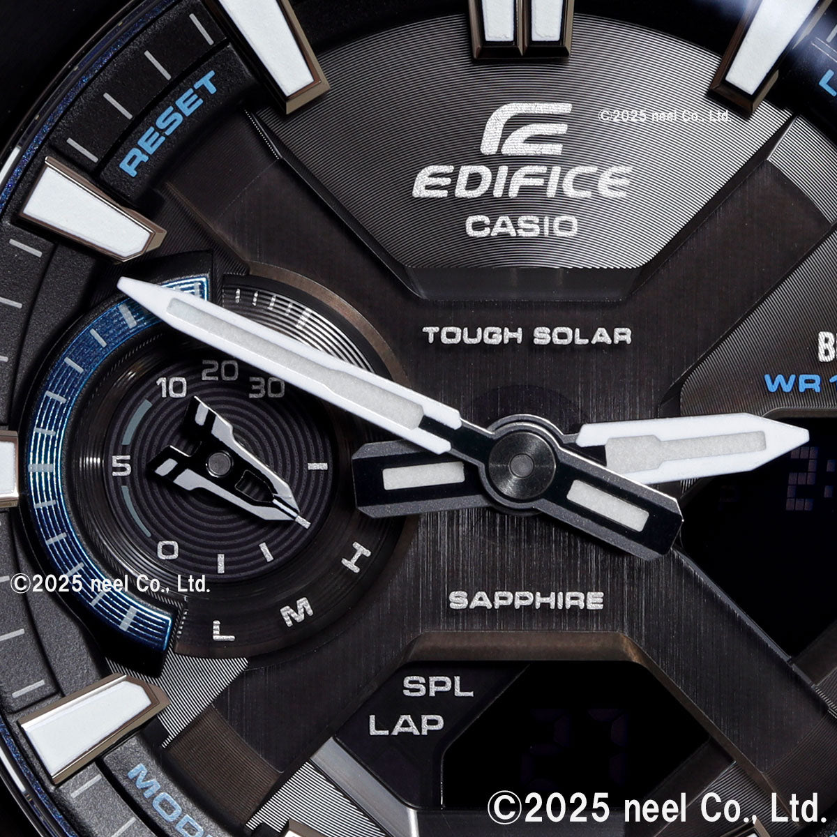 モータースポーツの世界から直接インスピレーションを得た「EDIFICEECB-2300 SOSPENSIONE」は、レーシングカーのエンジニアリングとデザイン哲学を腕時計に融合させました。最大の特徴は、レーシングカーのダブルウィッシュボーンサスペンションをイメージした独創的なラグデザイン。4か所に配置されたプッシュロッド風のロッドが、モータースポーツの機能美を表現しています。立体的な文字板が生み出す奥行きと相まって、ダイナミックな存在感を放ちます。カーボンファイバー強化樹脂とステンレススチールを組み合わせたケースは、レーシングマシンのように軽量かつ高剛性も備えています。ECB-2000 SOSPENSIONEからケース径を2mmダウンサイジングし、よりスマートな装着感を提供します。機能面も充実。Bluetooth(R)搭載によりスマートフォンと連携し、正確な時刻調整やワールドタイム設定などをアプリから簡単に操作可能。タフソーラーによる安定した電源供給、傷に強いサファイアガラス、実用的な10気圧防水など、高い実用性も備えています。レーシングカーの精密機械としての美学と先進技術を腕元で体感できる「EDIFICE ECB-2300 SOSPENSIONE」。モータースポーツへの情熱を日常に取り入れたい方に最適なタイムピースです。