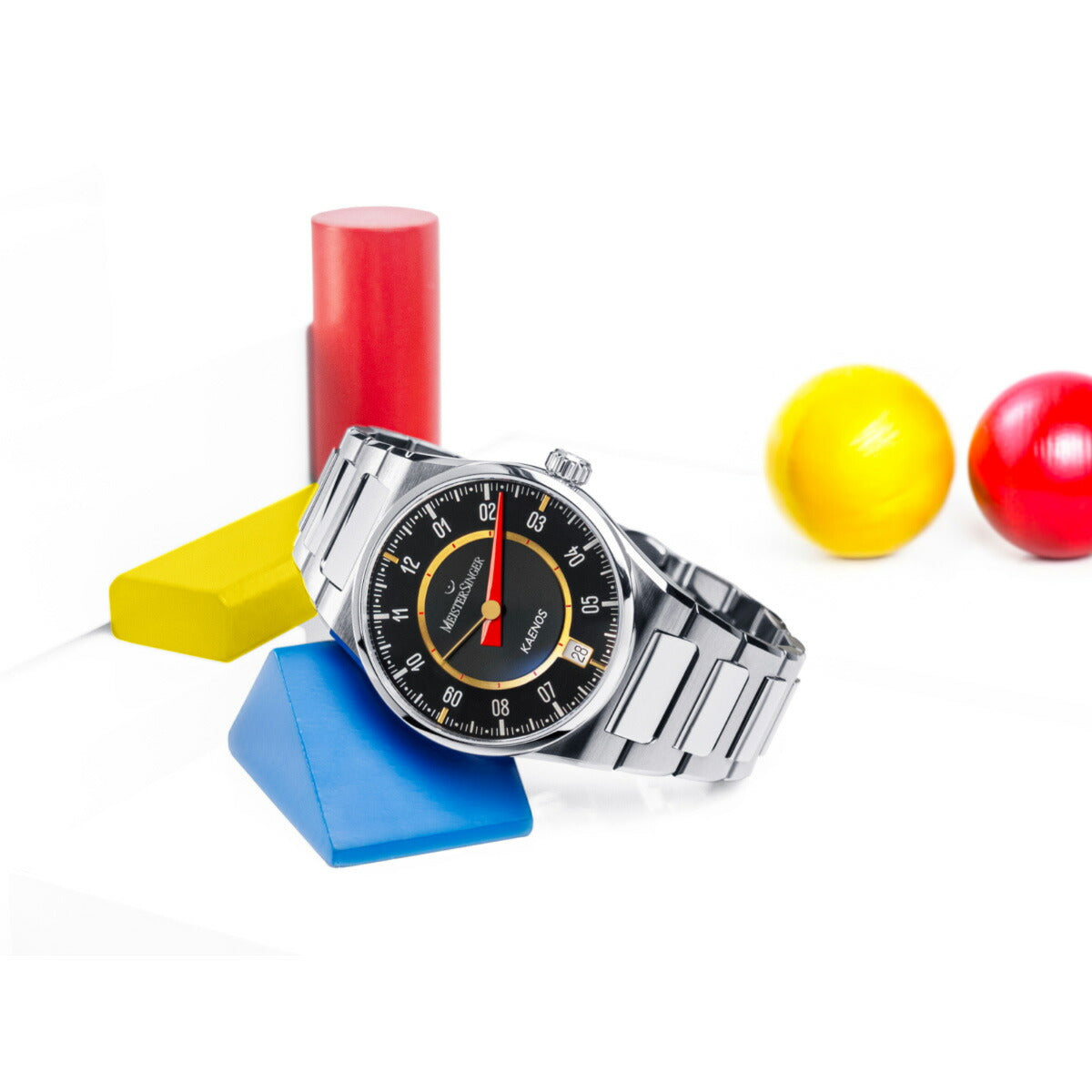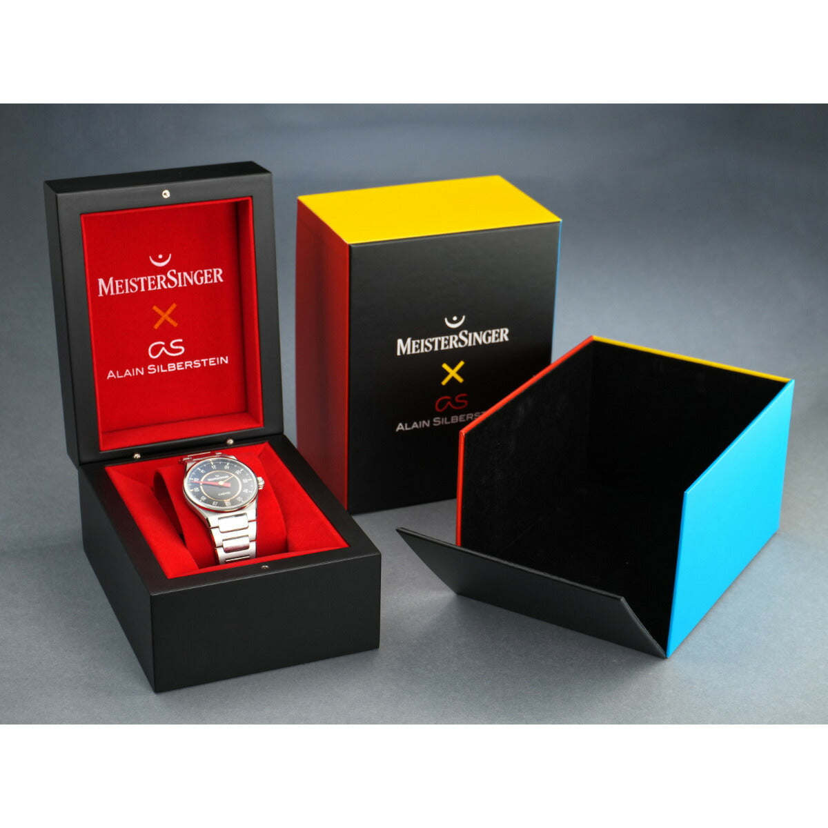 アラン・シルベスタインの作品は、大胆な色使い、幾何学的なフォルム、そして遊び心のあるデザインが特徴であり、時計業界の伝統的なデザインとは一線を画しています。自身の名を冠したブランドを数十年にわたって率いたシルベスタインは、オート・オルロジュリー(高級時計製造)の世界でアイコニックな存在となりました。このエディションウォッチは225本限定で製作されており、MeisterSingerのシングルハンドの哲学を守りながら、シルベスタインの独創的なデザインを融合。さらに、スムーズに流れる秒針を採用することで、時計に新たな躍動感を加えました。これは単なる機能ではなく、時間の流れを視覚的に楽しむためのアートとしてのこだわりです。このモデルは特別なデザインのパッケージとエディションブックレットが付属し、唯一無二のコラボレーションを完成させています。