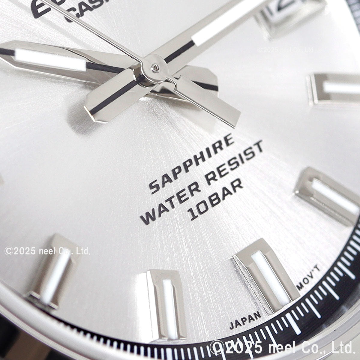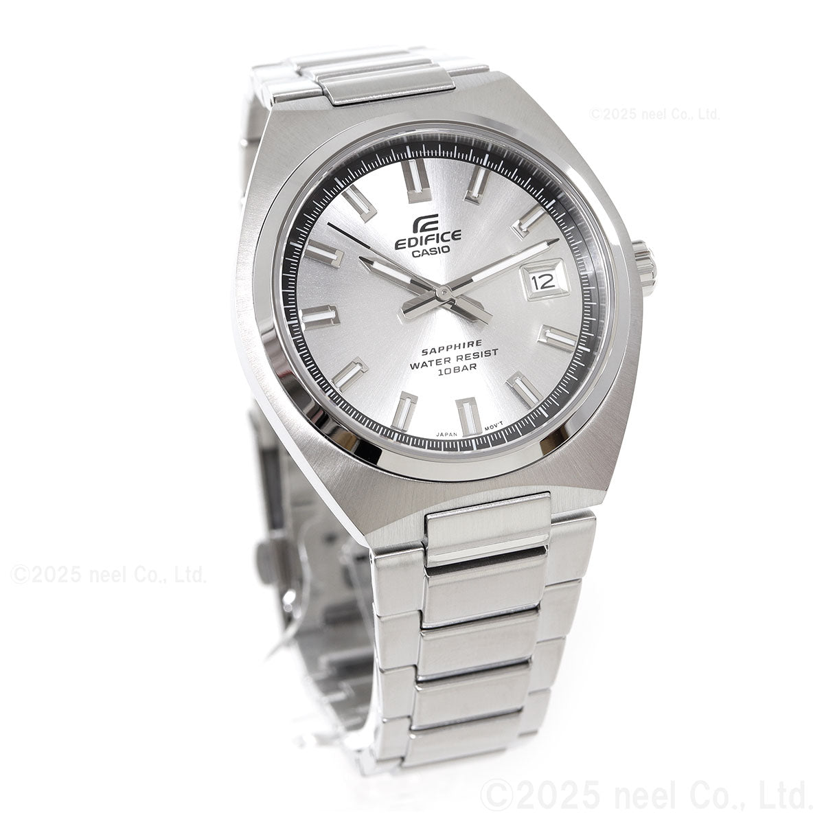 モータースポーツコンセプトのEDIFICEから、クラシックスポーツカーをイメージしてデザインした3針アナログモデルです。クラシックな印象のラウンド形状のステンレススチールケースとミラー仕上げの細身のベゼルが個性的です。ケースには放射状に筋目が入り硬質感を演出します。EFB-109DJ-7AJFのシルバー文字板は中心から放射状に細かな線が広がるサンレイ仕上げを施しています。サファイアガラス、ステンレススチールケース、無垢のステンレススチールバンドのクラシックでスポーティな10気圧防水モデルです。カジュアルからビジネスまで、幅広いシーンで個性を主張できるデザインです。