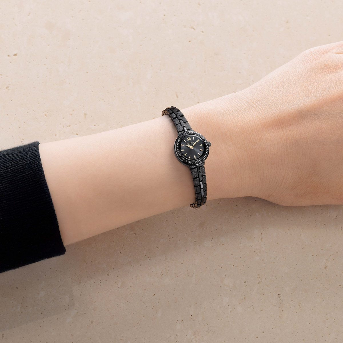 アンティークデザインのエコ・ドライブアクセサリーウオッチ、シチズン Kii:(キー)。神秘的な夜空の星をテーマに、ブラックを基調とした特別なラウンドモデルが登場。自分へのお守りとして、また大切な人への贈り物としても最適な1本です。エトワールノワール[EG2986-53E]:クラシカルで繊細なブレスバンドのラウンドモデル。小ぶりで華奢なスタイルは、アクセサリー感覚で身に着けることができます。エコ・ドライブ搭載の本格的なアンティークデザインを、魅力的な価格で気軽に楽しめます。文字板を彩るゴールドのインデックスや針は、漆黒の夜空に輝く星をイメージしたデザインです。ベゼルのデザインモチーフは「リアン(紐)」で、人との絆や良縁を願う思いが込められています。※フランス語で、エトワールは「星」、リアンは「紐」「絆」「結びつき」を意味します。