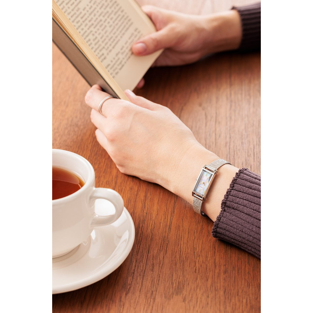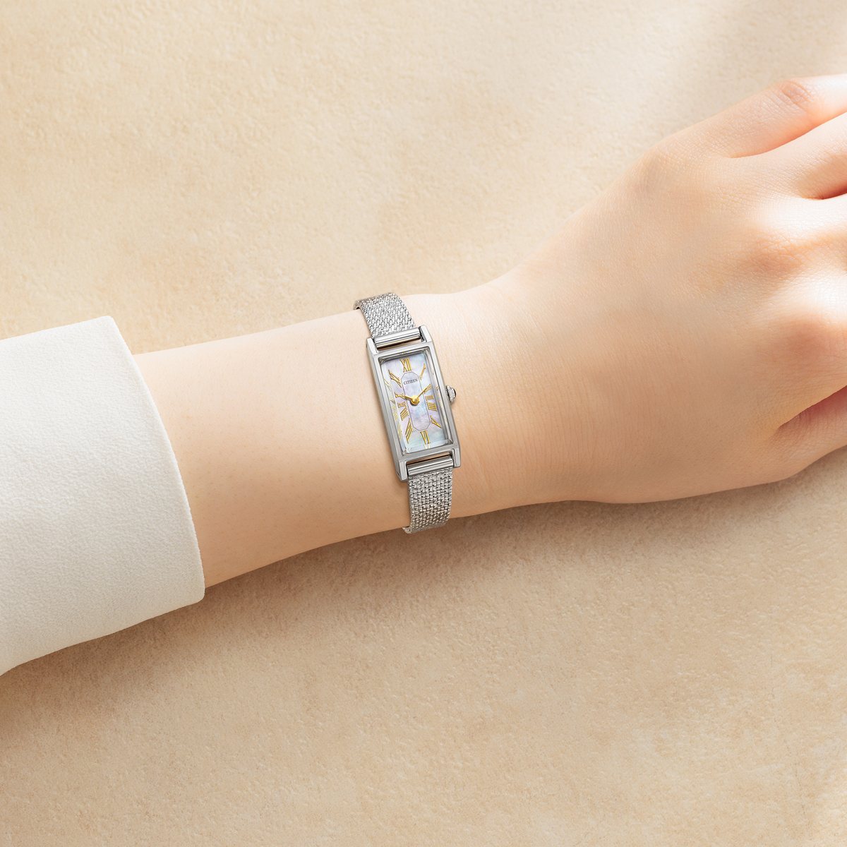 アンティークデザインのエコ・ドライブアクセサリーウオッチ、シチズン Kii:(キー)。人気のスクエアモデルに、2Way仕様の限定モデルが登場。オーセンティックな表情と美しい白蝶貝が、華やかな手元を演出します。華奢でありながら凜とした佇まい、スリムなケースが人気のスクエアモデルをベースに、美しい白蝶貝文字板を合わせた限定モデルです。文字板中央に、ギョーシェ彫りを思わせるパターンを施し、高級感と華やかさをきわだたせています。クラシカルな印象のメッシュバンドに、付け替え可能な革バンドをセットした2Way仕様。ご自身で手軽にバンド交換ができるインターチェンジャブル構造です。シルバーケースのモデルには、手元をクールに彩るネイビーの革バンドをセット。メイクやファションに合わせて印象が変えられます。