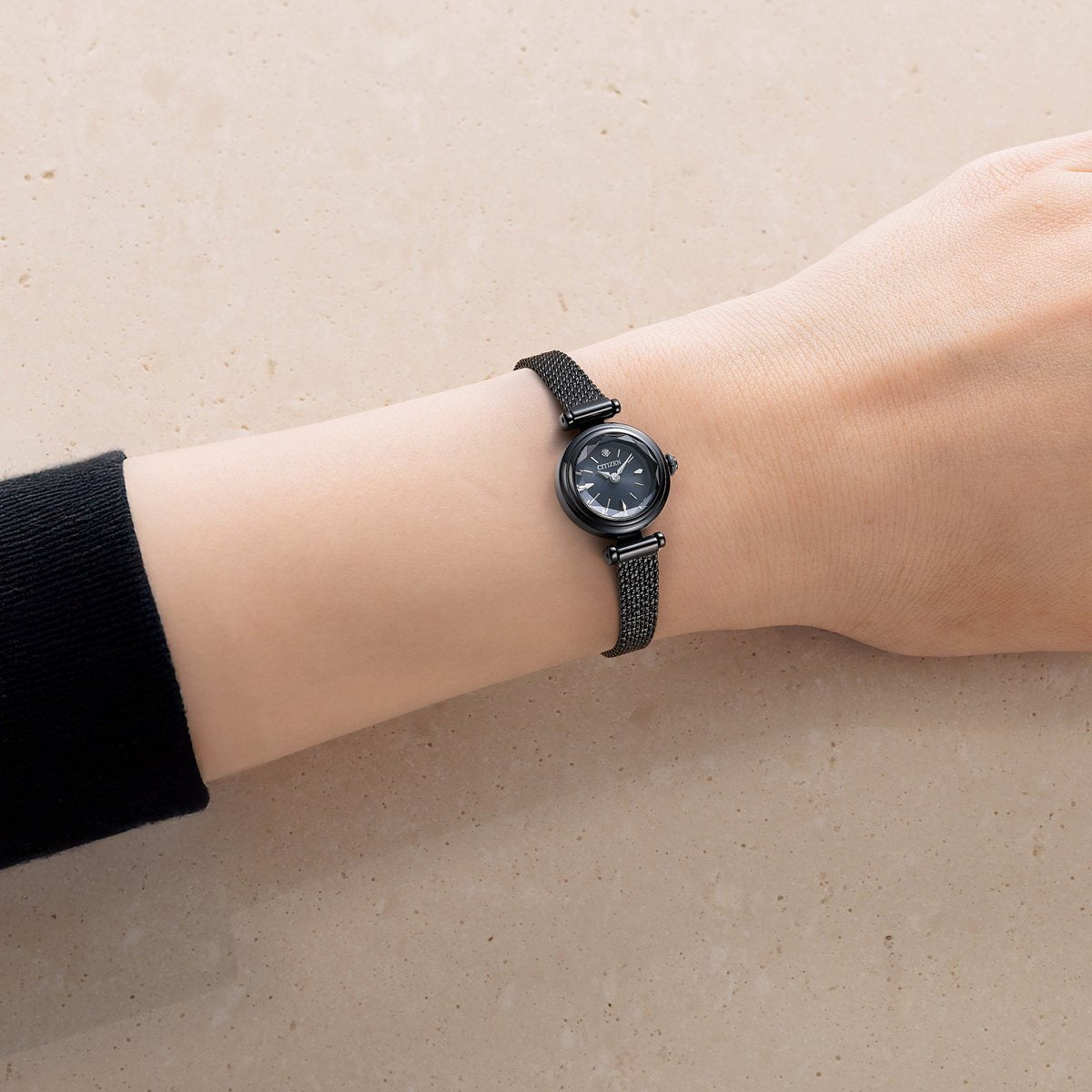アンティークデザインのエコ・ドライブアクセサリーウオッチ、シチズン Kii:(キー)。神秘的な夜空の星をテーマに、ブラックを基調とした特別なラウンドモデルが登場。自分へのお守りとして、また大切な人への贈り物としても最適な1本です。エトワールブルー[EG7085-50L]:ジュエリーのように煌めくラウンドメッシュモデル。ころんとした可愛いフォルムの華奢なラウンドケース。飾りピンに見立てたパーツやメッシュバンドが、シックでアンティークなジュエリーのような表情を演出します。星の煌めきを集めた宝石箱のようなカットガラスが、キラキラと繊細に輝きます。深いブルーに染まる夜空のような文字板には、12時位置に輝く星に見立てた1ポイントのダイヤモンドがアクセントとなっています。※フランス語で、エトワールは「星」、リアンは「紐」「絆」「結びつき」を意味します。