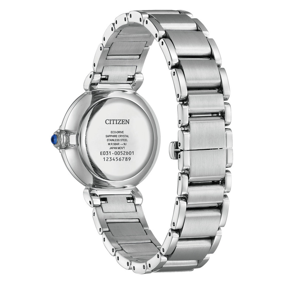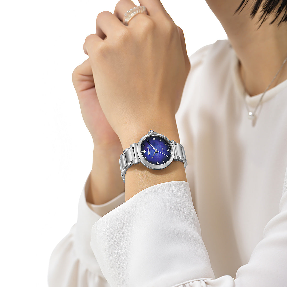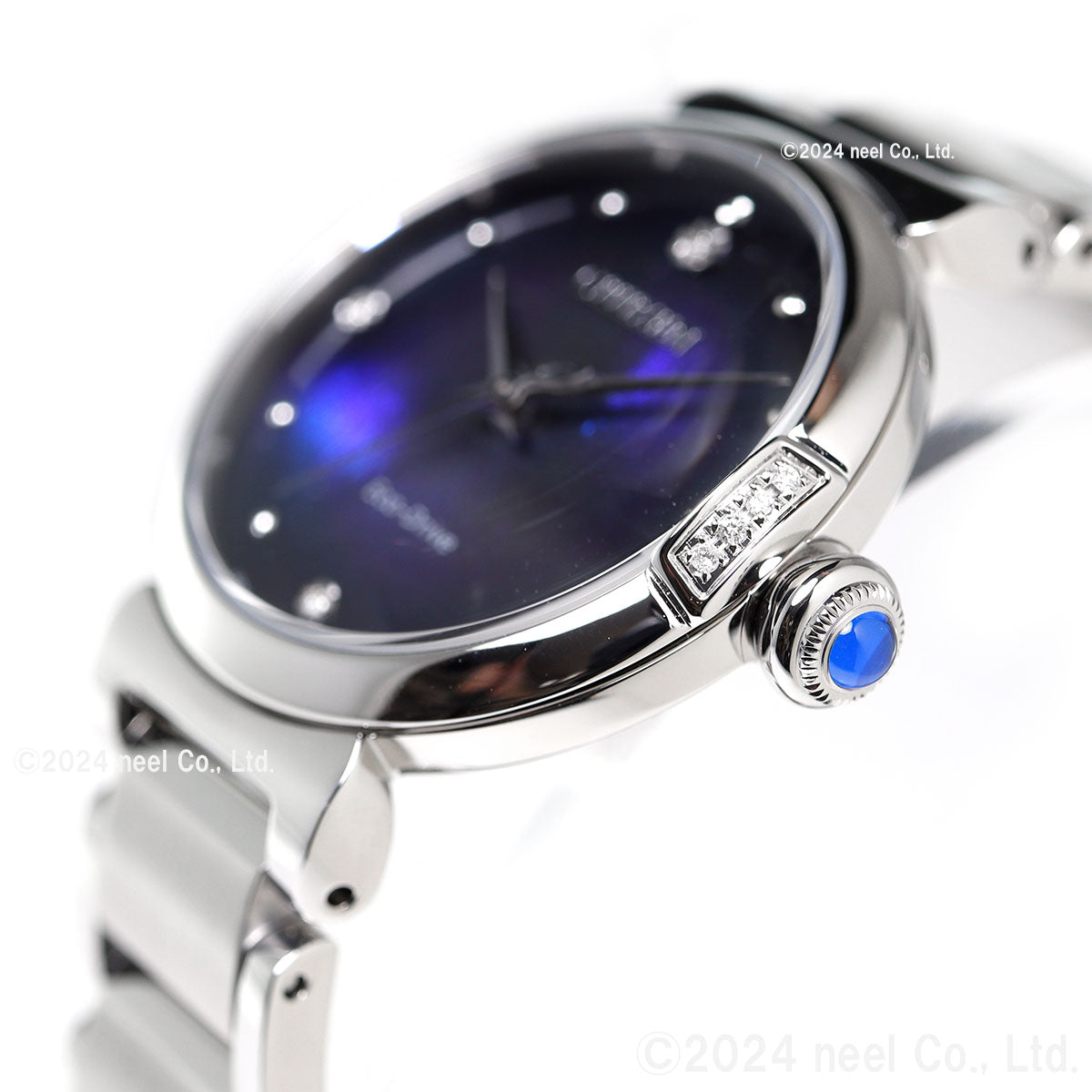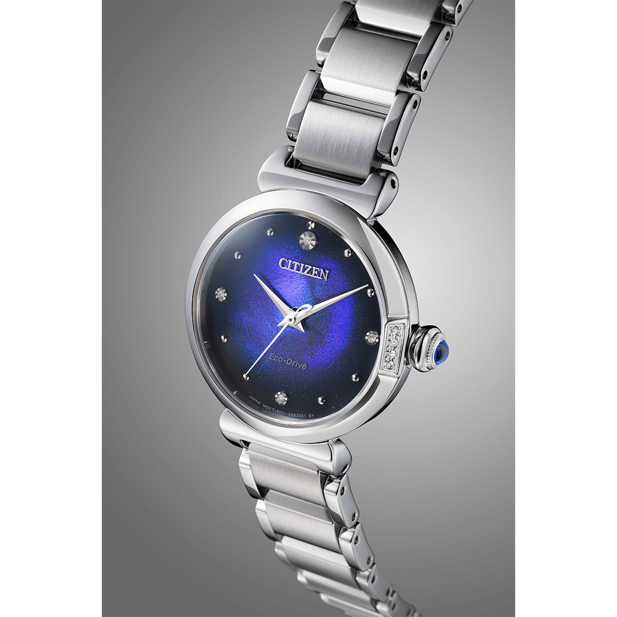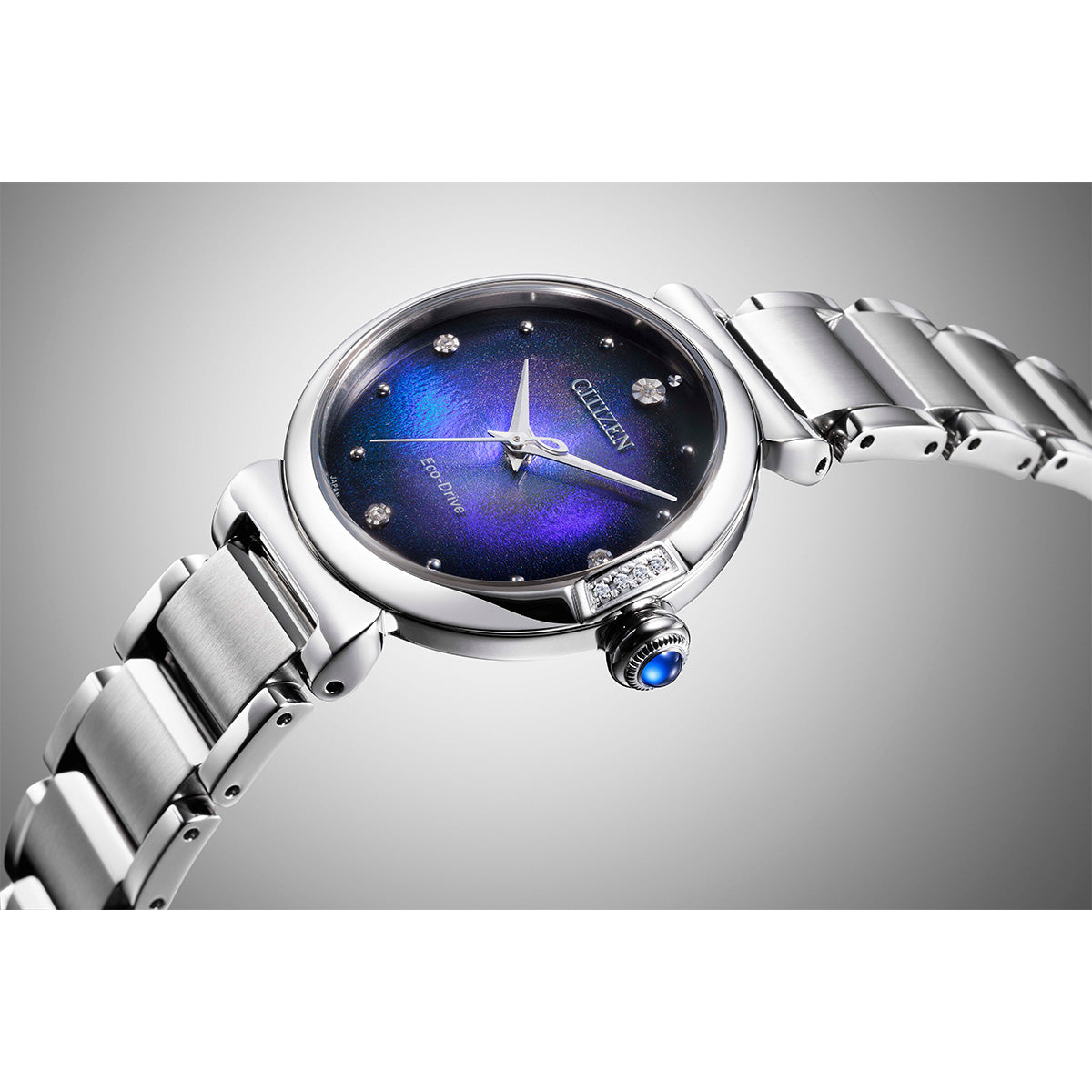 地球のように美しいサステナブルウオッチ、CITIZEN L(シチズン エル)。静かな深海の様子をイメージして、静を感じさせるデザインと少し大きめのフェイスが、構造色の魅力を強調。凜とした佇まいが魅力の1本です。4ヵ所に配したダイヤモンドは、深海から立ち上る気泡のきらめきを表現。文字板の外周にインクジェットのグラデーションを重ねることで、深海の静けさの中に輝く泡を際立たせています。