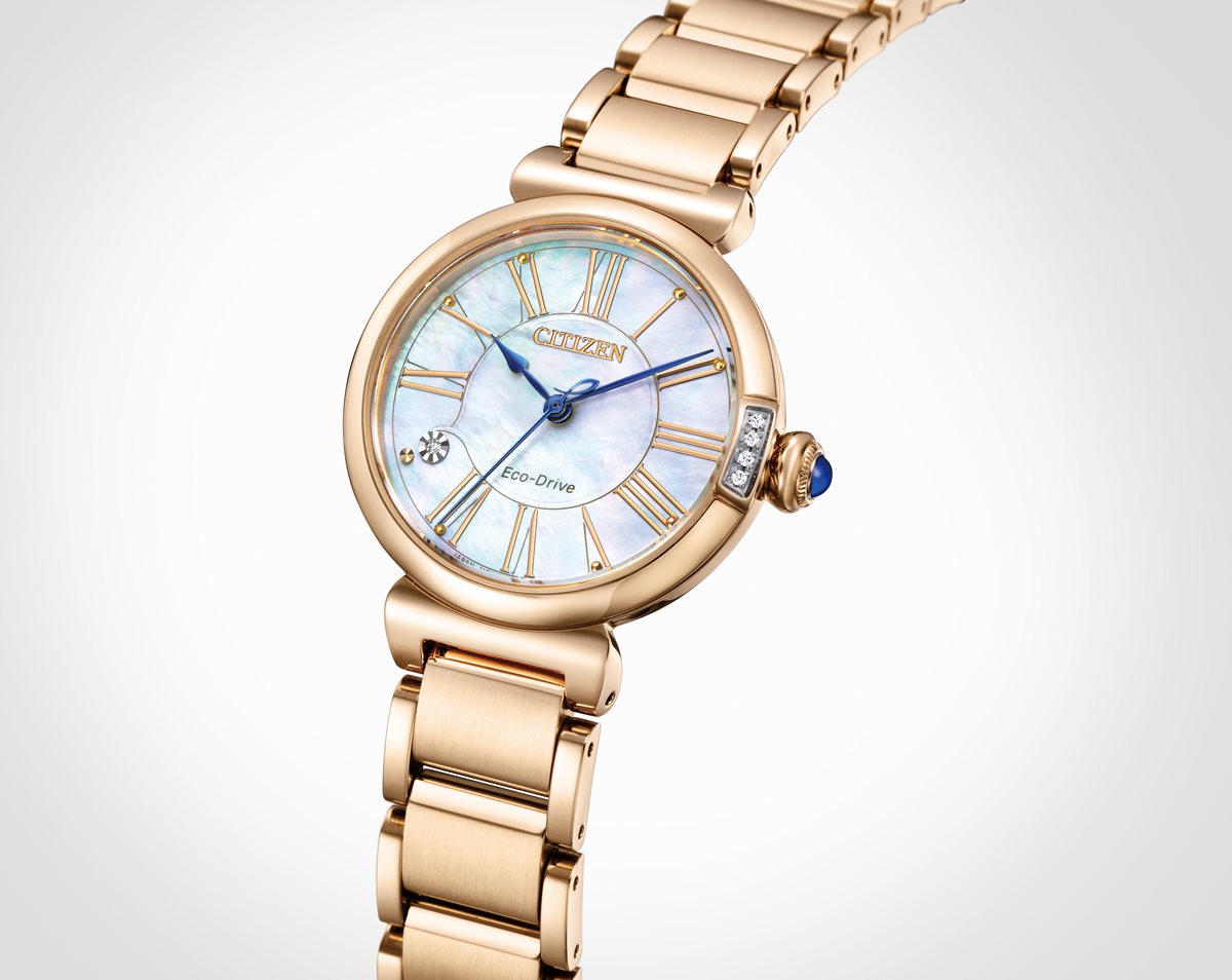 地球のように美しいサステナブルウオッチ、CITIZEN L(シチズン エル)。幸せを呼ぶスズランをモチーフにした上品なたたずまい。きらめくダイヤモンドのアクセントが、華やいだジュエリーのような印象を与えます。デザインのモチーフは、幸せの象徴として人々から愛されてきたスズラン。流れるようにしなやかな文字板のデザインと、そこに寄り添うクラシカルなローマ数字インデックスが優しく上品な印象を与えます。スズランを思わせる柔らかな曲線のフォルムと白蝶貝の文字板でみずみずしく、清楚で凛とした上品さを演出します。