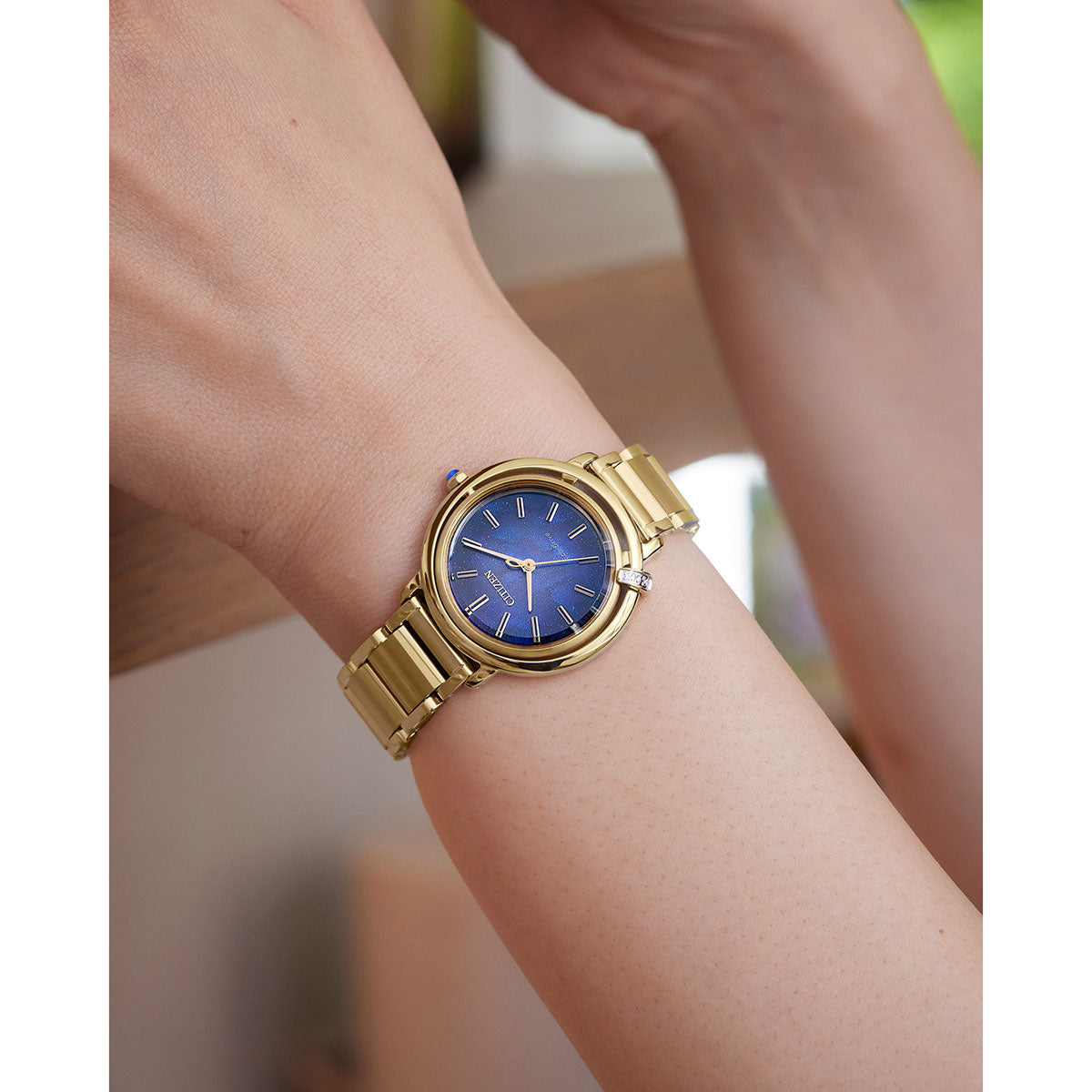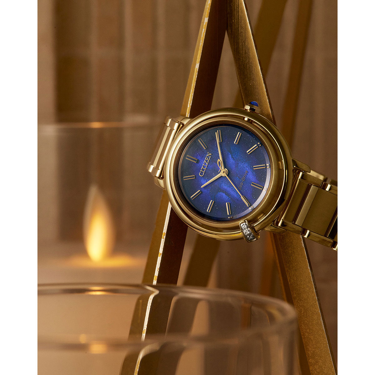 地球のように美しいサステナブルウオッチ、CITIZEN L(シチズン エル)。アンティーク風のテイストを生かしたライトゴールドのケース、ベルベットのような上質感を表現した深いブルーの文字板。生命力あふれる美しい水(AQUA)を表現した「ARCLY Collection」限定モデルです。