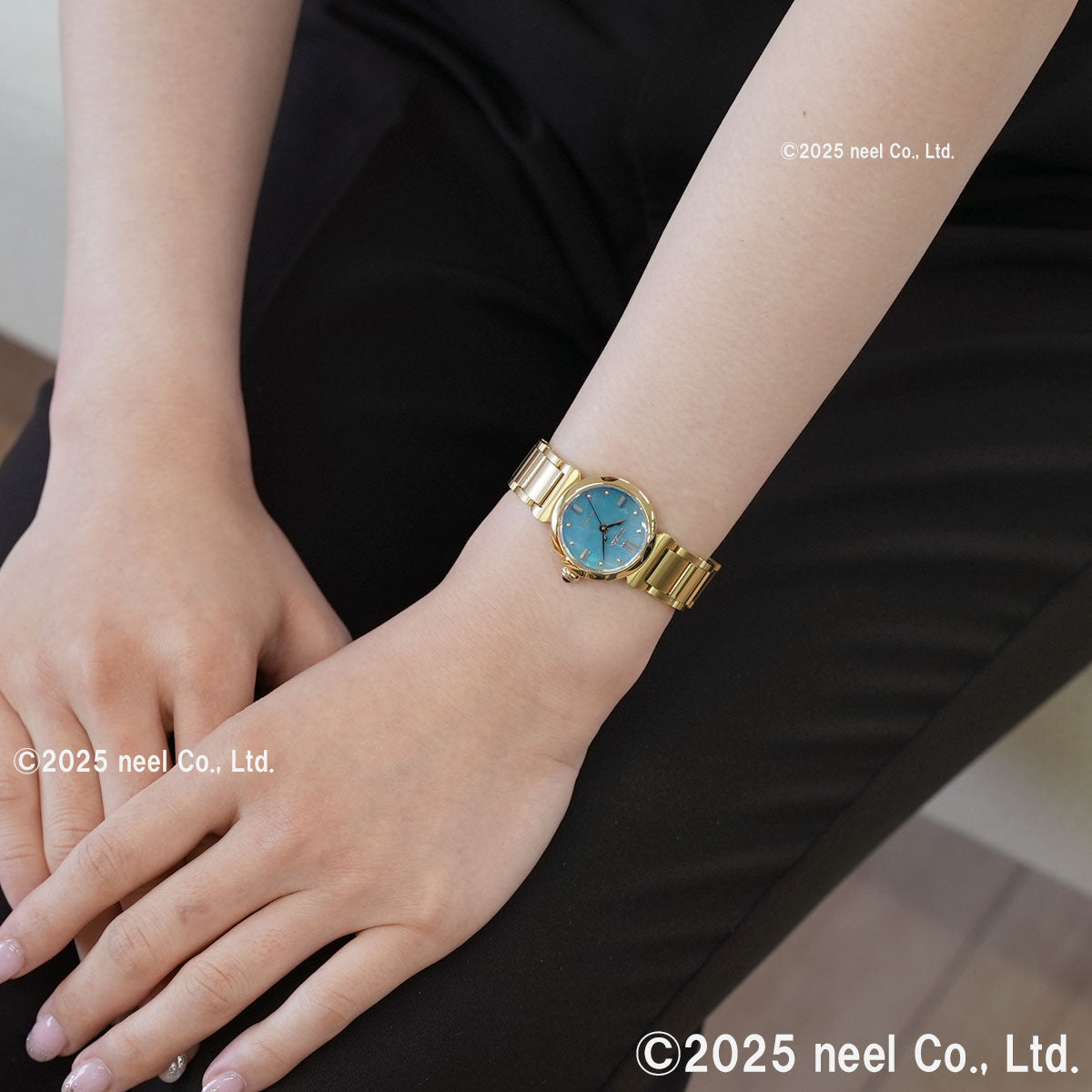 やわらかな曲線が手元を彩る限定モデル。地球上のすべての生命にとって欠かせない存在である水(AQUA)をモチーフに、生命力あふれる美しさを表現しています。文字板は、光の反射で多彩な表情を見せる構造色とインクジェットの技法を採用。水の波紋を写し取った構造色フィルムを使い、トルコ石のように鮮やかなブルーの海面を表現。太陽のもとで揺らめき、角度によって海の底まで透けて見えるかのような、不思議な水の動きを感じさせます。トップにプリントを施したインデックスは、アンティーク時計にインスピレーションを得たデザイン。明るいブルーのアクセントカラーとドットのインデックスを組み合わせてバーインデックスの力強い印象をやわらげ、シチズン エルらしさを表現しています。