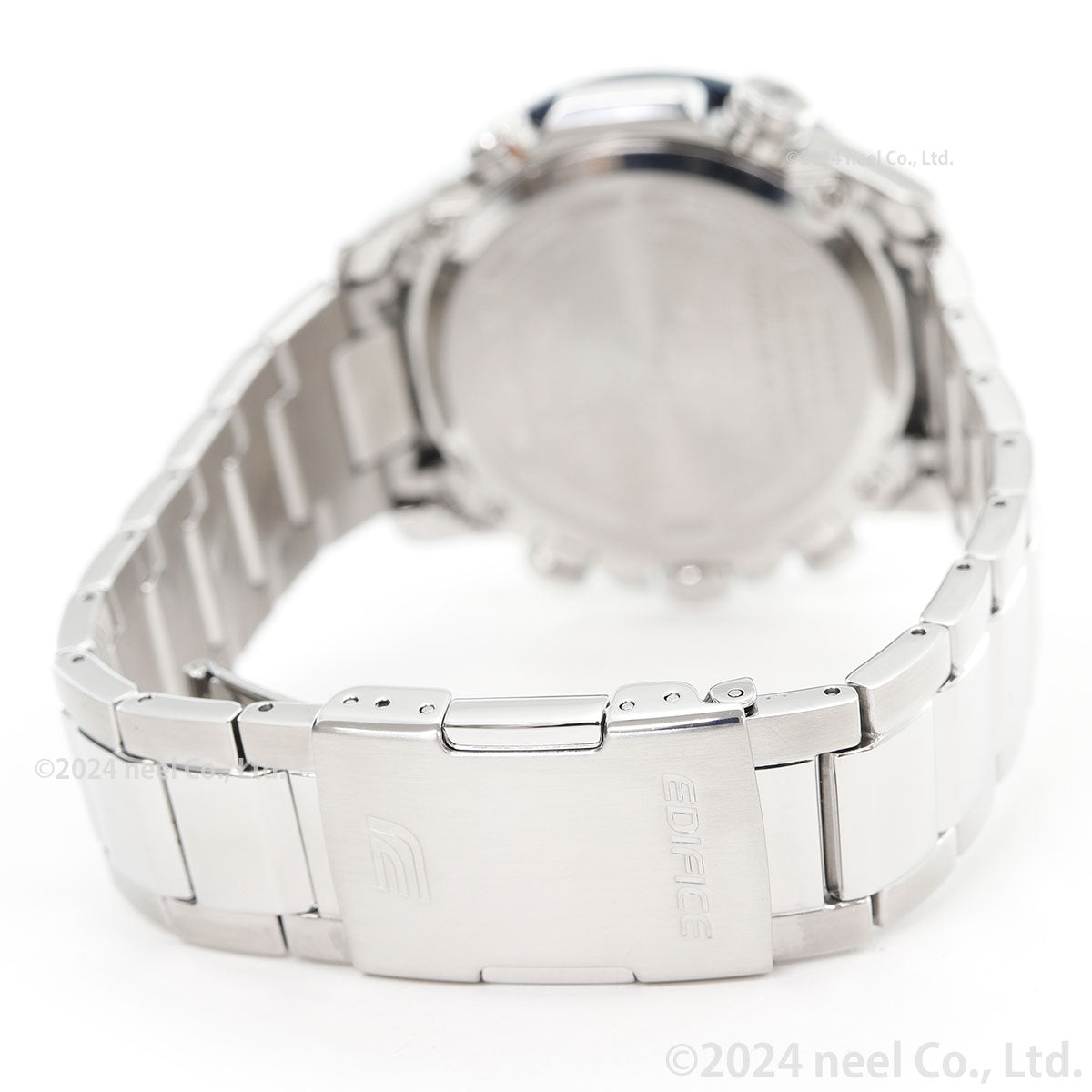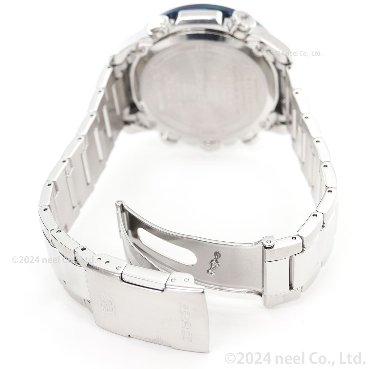 先進の高機能メタルクロノグラフとして進化を続ける「エディフィス」のスマートフォンリンクシリーズより、サイズの小型化を実現したNewモデルEQB-900の登場です。今回のモデルはケース幅・厚さ共にシリーズ最小サイズを実現。ベゼルにブルーIP 処理を施したEQB-900DB。また、インデックス・インダイアルは力強く存在感のあるデザインを採用。シリーズ最小ながら迫力を損なわないボールドデザインとしました。機能面では、文字板6-7時位置にLEDライトを新たに搭載し、昼夜問わない時計の視認性を確保しました。また、スマートフォンを経由してサマータイムやタイムゾーンの情報を1日4回自動更新する自動時刻修正や、アプリ上の約300都市からタップするだけで表示できるワールドタイム設定機能も搭載。その精度は時刻取得システム「Accurate TimeSystem」によって更に向上。インターネット上で時刻情報を提供するタイムサーバーにアクセスし、独自のデータベースと照合することで、現在地におけるタイムゾーン情報とサマータイム情報を抽出し、精度の高い時刻を取得。世界中あらゆるところで正確な時を刻みます。また、これらの各種機能はタフソーラーにより、定期的な電池交換をすることなく安心して使用することができます。先進の機能性・実用性とシリーズ最小サイズを実現したNewクロノグラフモデルの登場です。