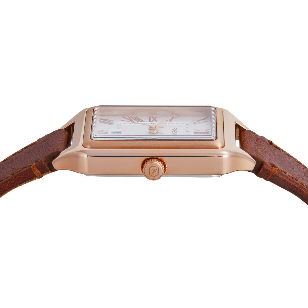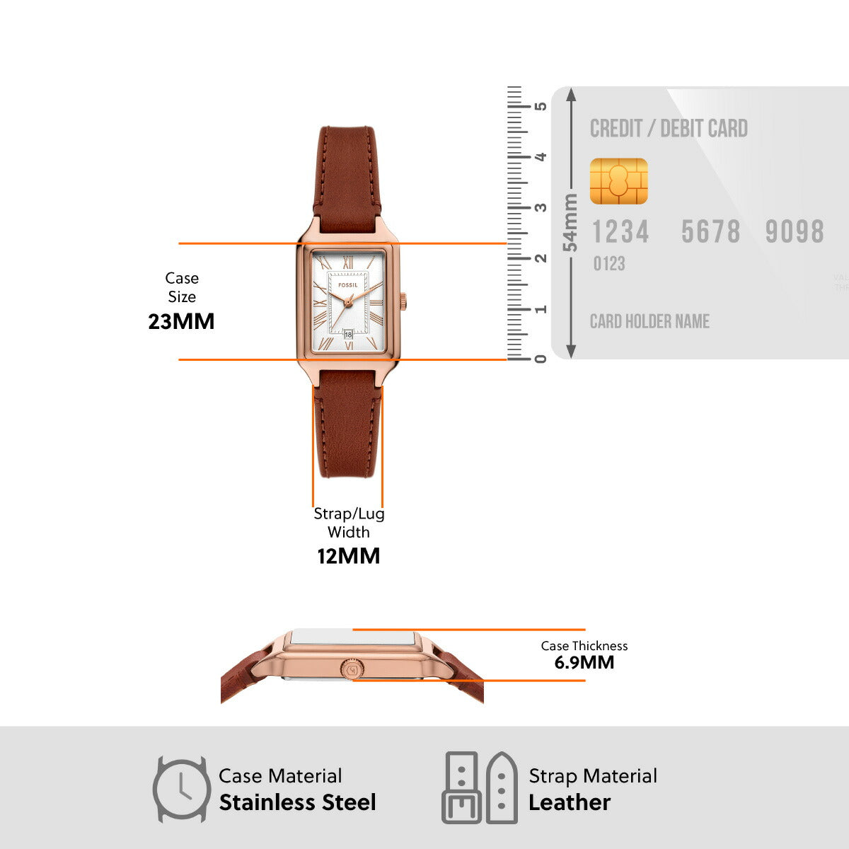 トレンドのレイヤースタイルをお求めなら、こちらのセットがおすすめ。こちらのウォッチとブレスレットのセットは、アーカイブの真のアイコンであるレクタングル型のRAQUELウォッチと、Heritage D-Linkデザインが特徴のローズゴールドトーンのステンレススチール製ブレスレットがセットになっています。ウォッチはホワイトのダイヤルにブラウンのレザーストラップを組み合わせたデザインです。Fossilのレザー製品は、Leather Working Group(LWG)を通じて責任あるものづくりを支援しています。