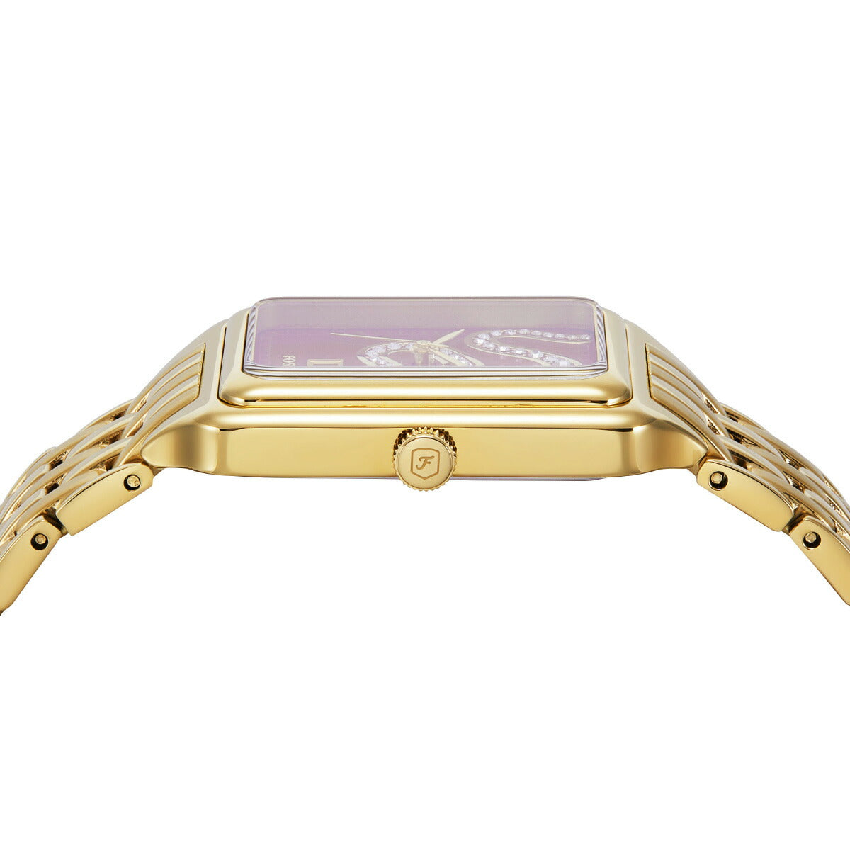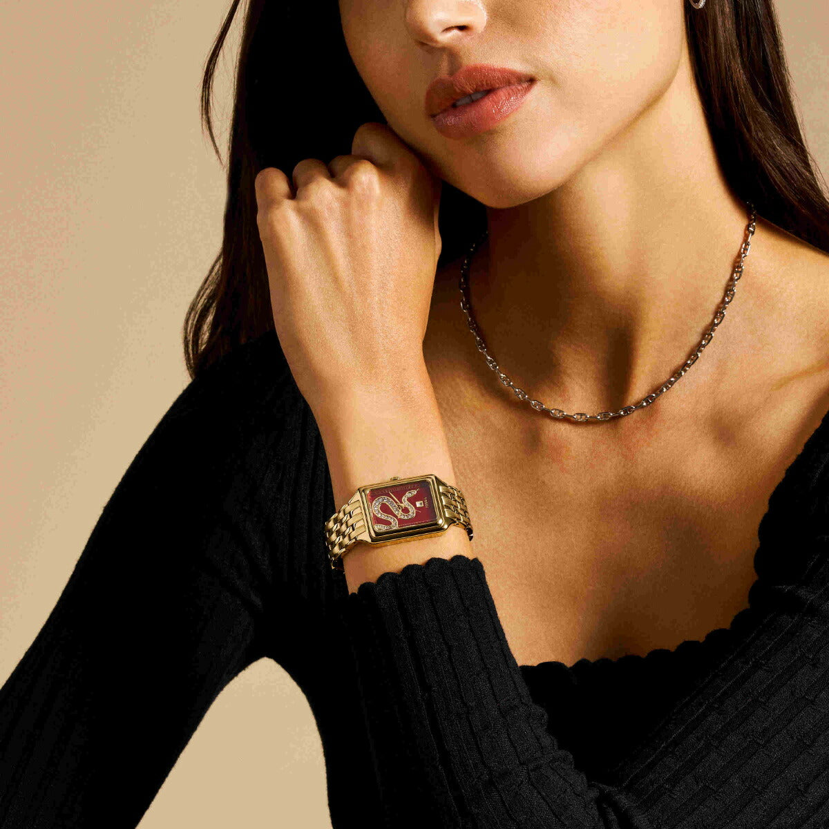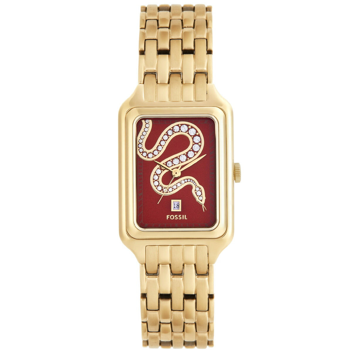 巳年を祝うLUNAR NEW YEARカプセルコレクション。巳年は知恵と変革を象徴しています。スリムで汎用性の高いレクタングル型のRAQUELウォッチは、ゴールドトーンのステンレススチール製7連リンクブレスレット、デイト表示付き三針ムーブメント、印象的なクリスタルのスネークをあしらったレッドのダイヤルが特徴です。