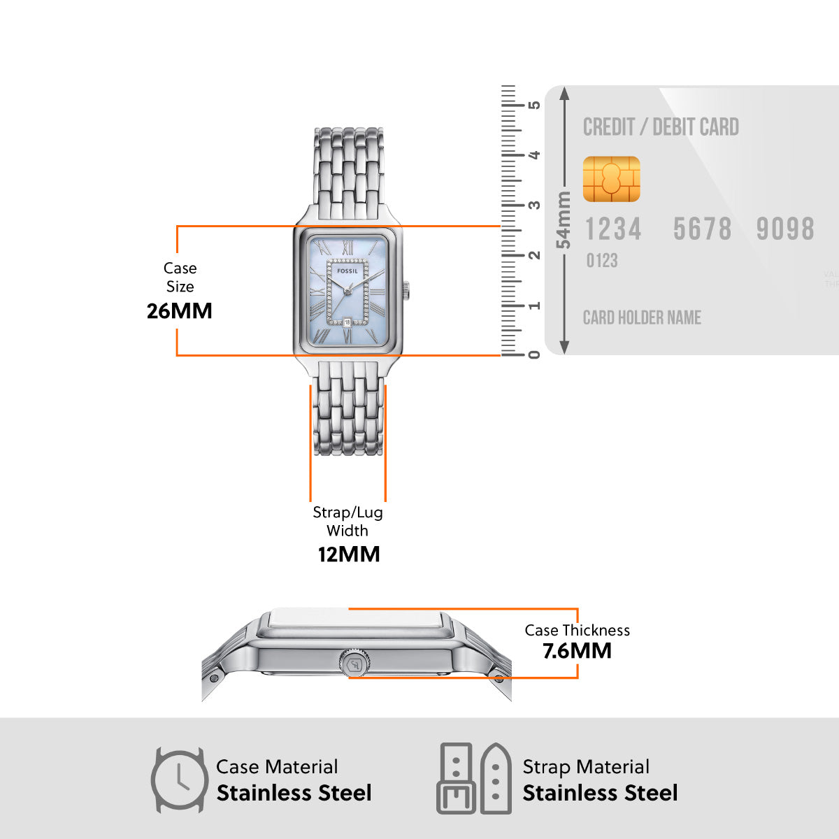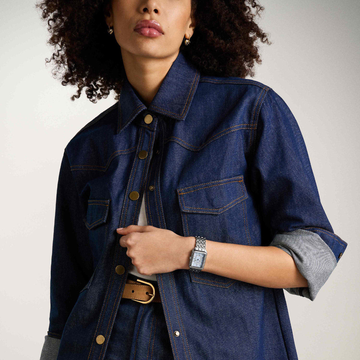 生まれ変わった正真正銘のアイコン、RAQUELウォッチ。スリムなレクタングル形ケースとステンレススチールブレスレットがタイムレスで洗練された魅力を演出します。光沢あるブルーマザーオブパールのダイヤルが輝く、コーディネート力の高いデザインです。デイト表示付き三針ムーブメントを搭載した実用的な機能性も備えています。ヴィンテージ風でありながら新鮮でモダンな魅力をたたえた、毎日使いたくなるクラシックなアイテムです。