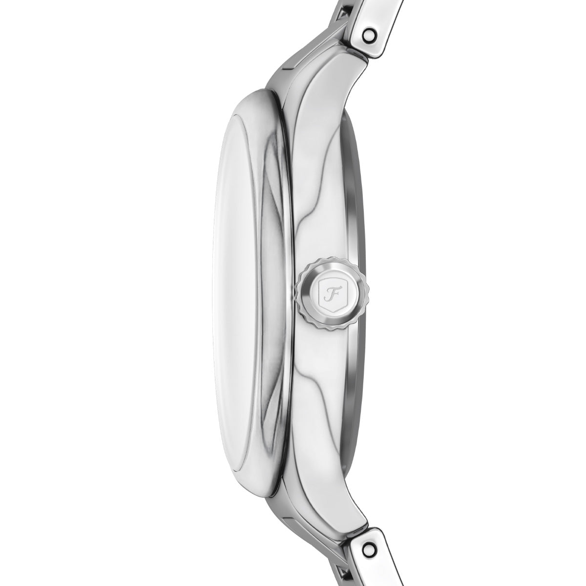 シルバートーンのステンレススチールを全体に使用したこのウォッチは、洗練されたモノトーンのラウンドケースとマッチするブレスレットを組み合わせています。サテンサンレイダイヤルはシルバートーンのデザインを踏襲し、控えめなディテールによって統一感のある仕上がりになっています。三針構成でデザインされたミニマルなアプローチは、精度とシンプルさを強調しています。ポリッシュ仕上げのブレスレットと流線型のダイヤルが、考え抜かれたクラフツマンシップとモダンなスタイリングを際立たせます。