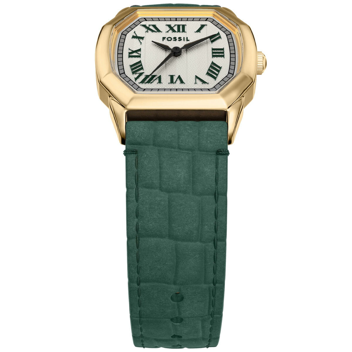 ゴールドトーンの八角形ケースがクリーム色の質感のあるダイヤルを縁取り、この小さなウォッチの特徴的なシルエットを生み出しています。グリーンのクロコ型押しレザーストラップが深みと個性を添え、ケースの温かみのある色調を引き立てています。ステンレススチールとレザーの素材を使用し、考え抜かれたデザインと上質な仕上がりがバランスよく調和しています。