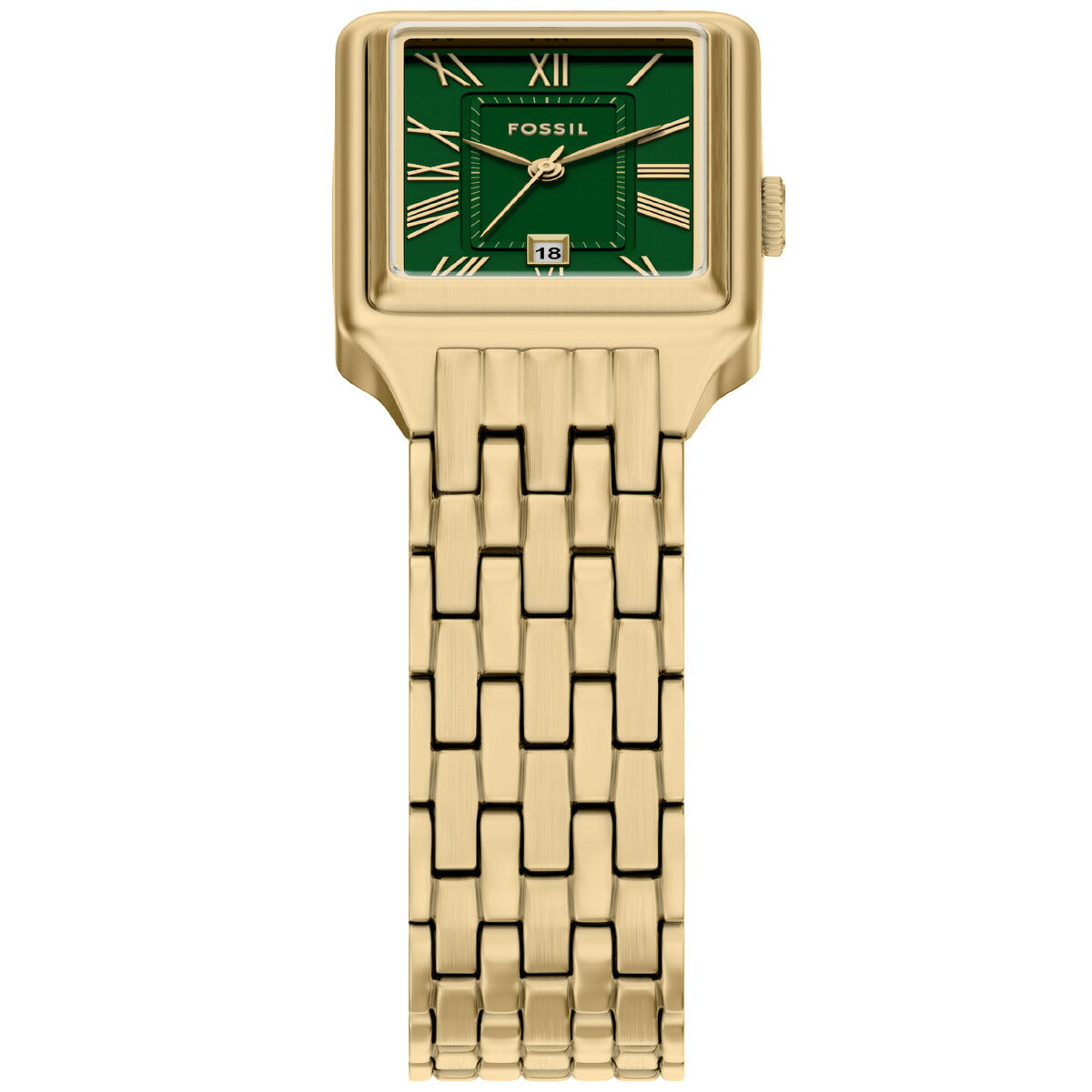 ゴールドトーンのステンレススチール製長方形ケースとマッチしたブレスレットが組み合わされ、洗練された統一感のあるデザインに仕上がっています。グリーンのサテンダイヤルは洗練されたポップカラーを添え、すっきりとした三針表示と便利な日付窓を備えています。ダブルプッシュ中折れクラスプを備えたこのウォッチは、考え抜かれたディテールと上質な素材が組み合わされ、洗練されたデイリーアクセサリーに仕上がっています。
