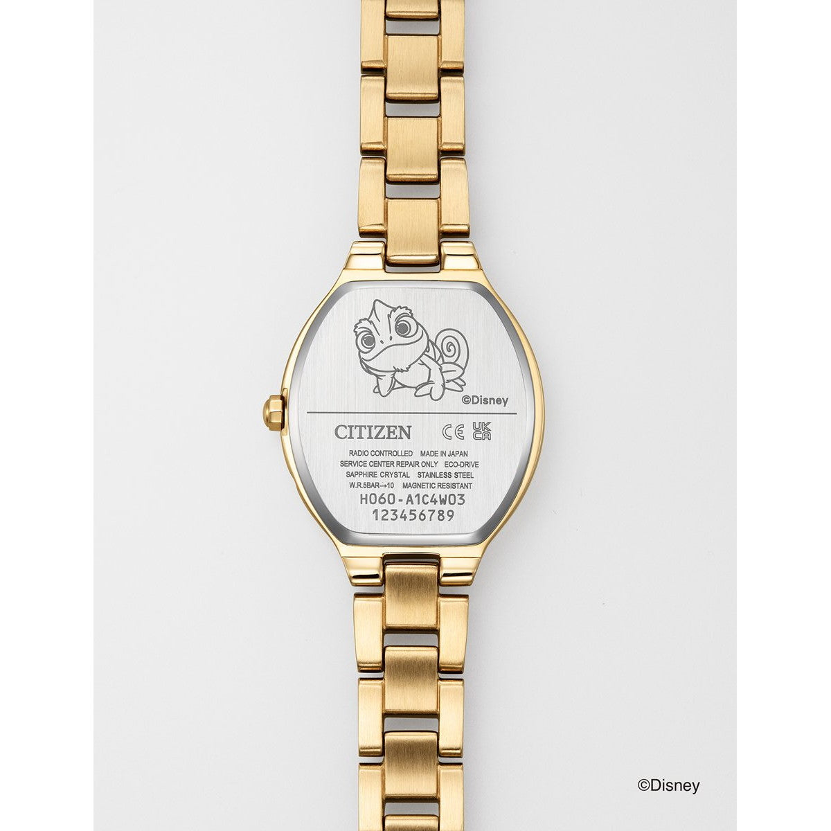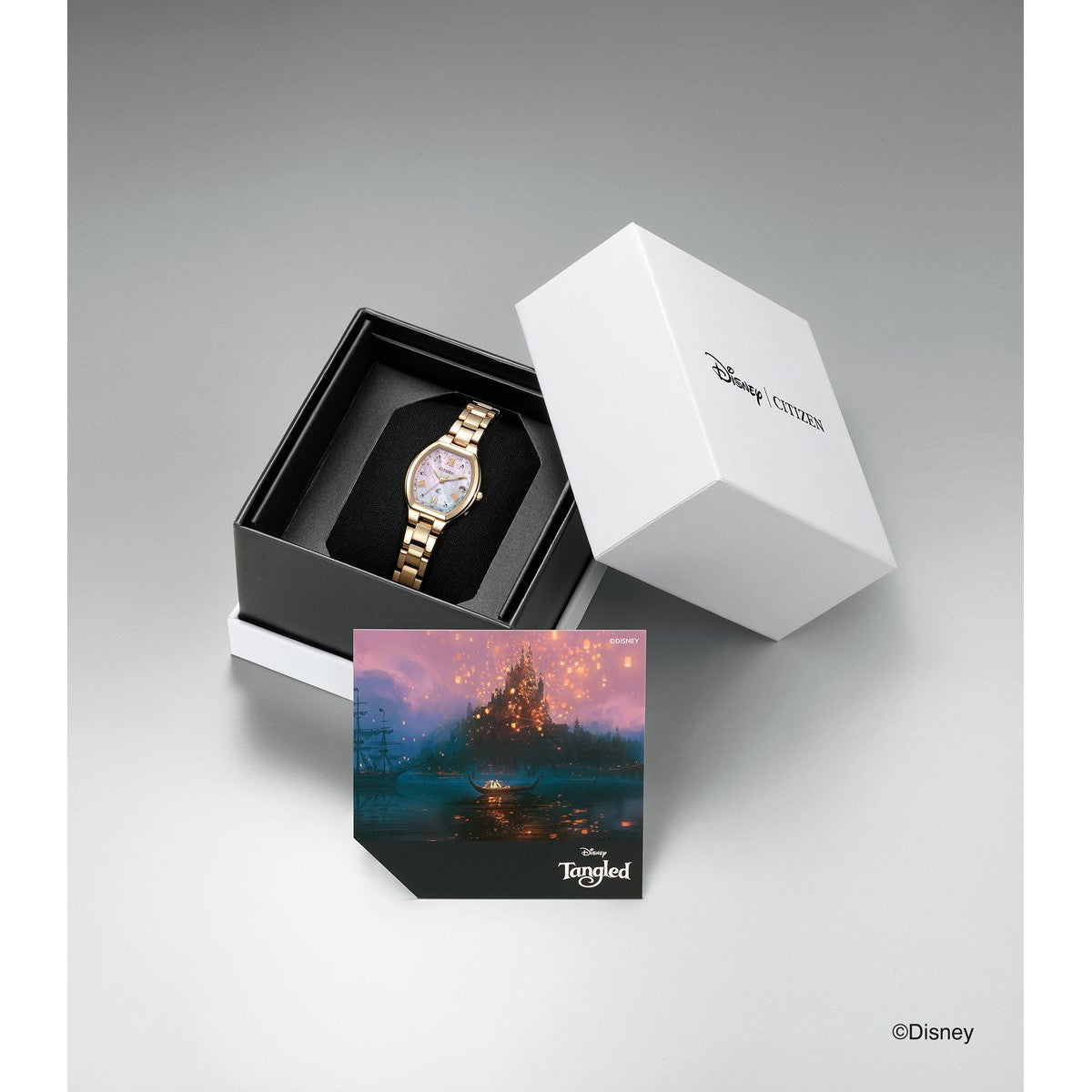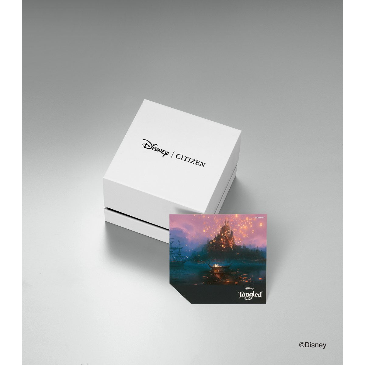 幸せな瞬間を、共に過ごしていきたい。そんな想いを込め、シチズンがブランドを超えてデザインしたディズニーコクションが登場。それぞれのキャラクターたちを表現した特別なデザイン。手に取った瞬間、喜びと美しさに彩られた時間が始まります。モチーフ:『塔の上のラプンツェル』。映画『塔の上のラプンツェル』の中でもひときわ美しく印象的なシーンを文字板上に描いた限定仕様です。白蝶貝の文字板に淡いパープルのグラデーションを施し、エレガントなデザインのローマ数字インデックスとともに、きらめくカットパーツをレイアウト。夜空に浮かぶランタンの美しい輝きを、ゴールドやホワイトのパターンで表現しました。5時の位置には、美しい情景を背景に、「ラプンツェル」と「ユージーン」がボートに乗って寄り添う姿が描かれています。裏ぶたには、「ラプンツェル」の親友「パスカル」が刻印されています。