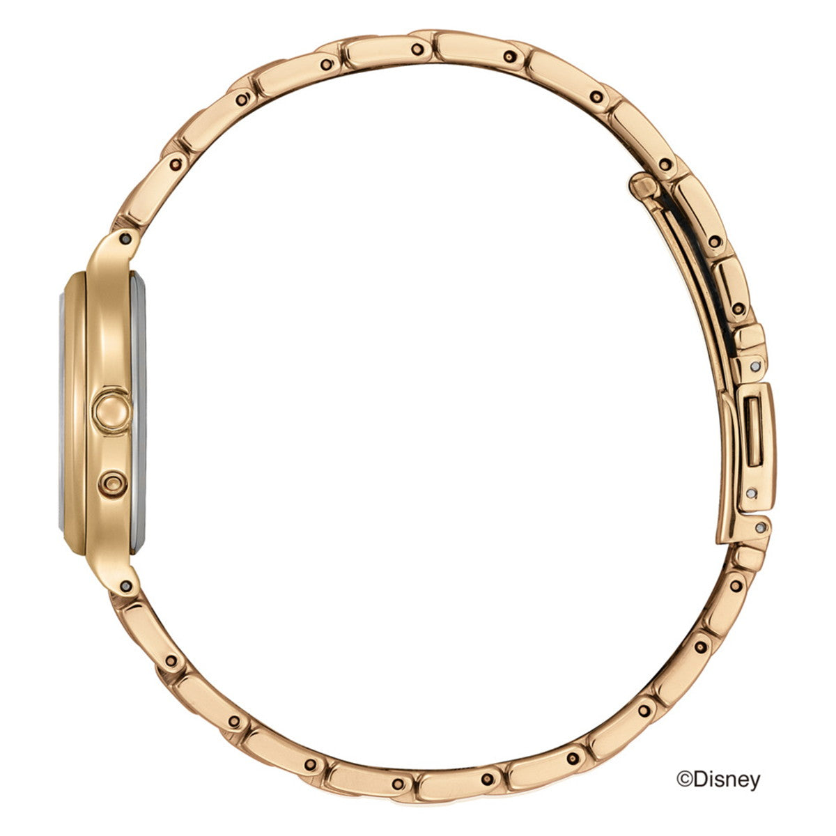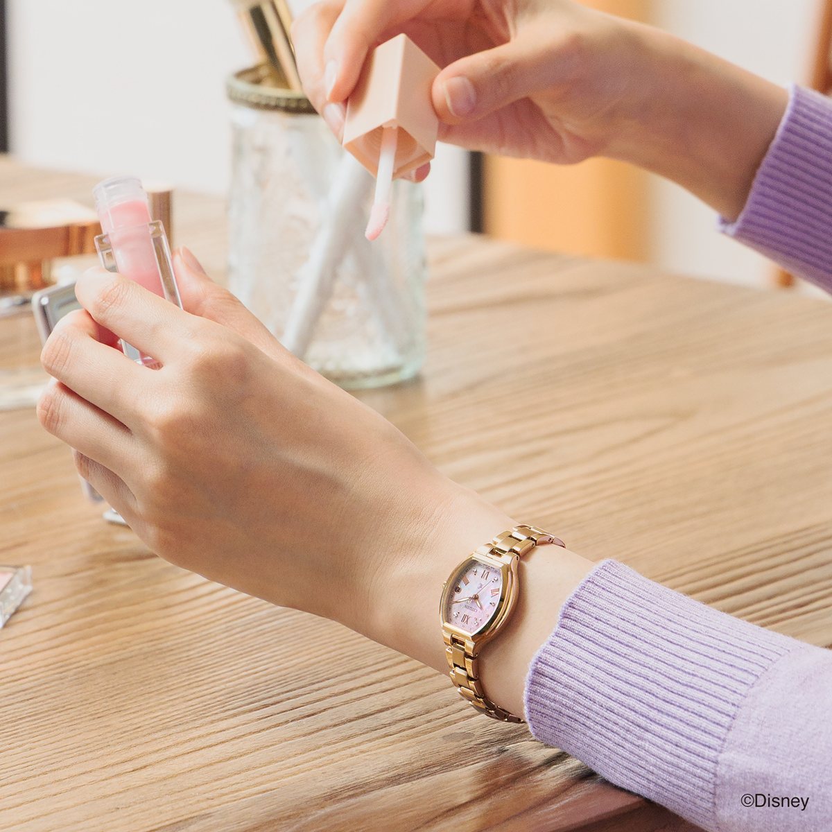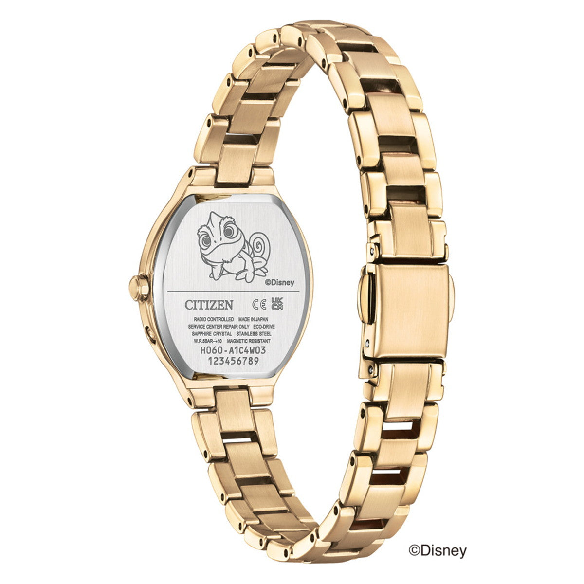 幸せな瞬間を、共に過ごしていきたい。そんな想いを込め、シチズンがブランドを超えてデザインしたディズニーコクションが登場。それぞれのキャラクターたちを表現した特別なデザイン。手に取った瞬間、喜びと美しさに彩られた時間が始まります。モチーフ:『塔の上のラプンツェル』。映画『塔の上のラプンツェル』の中でもひときわ美しく印象的なシーンを文字板上に描いた限定仕様です。白蝶貝の文字板に淡いパープルのグラデーションを施し、エレガントなデザインのローマ数字インデックスとともに、きらめくカットパーツをレイアウト。夜空に浮かぶランタンの美しい輝きを、ゴールドやホワイトのパターンで表現しました。5時の位置には、美しい情景を背景に、「ラプンツェル」と「ユージーン」がボートに乗って寄り添う姿が描かれています。裏ぶたには、「ラプンツェル」の親友「パスカル」が刻印されています。