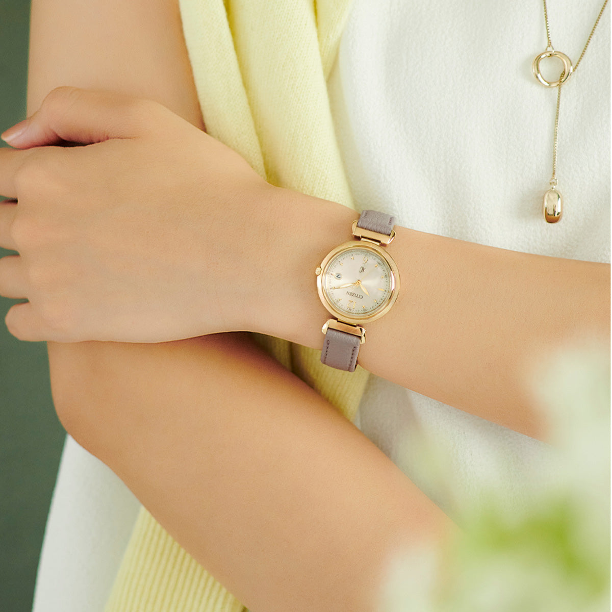 前を向く女性を応援するエンパワーウオッチブランド、シチズン xC(クロスシー)。透明感あふれるカラーとやわらかなフォルムが、手元をみずみずしく彩る「mizu collection」の新作。繊細な可愛らしさを表現したアラビア数字インデックスモデルです。露のようにキラキラ輝く8個のカットパーツと、9時位置にセッティングされた雫型のカットパーツが、水面に広がる波紋をイメージしたケースラインとともに、手元を美しく彩ります。