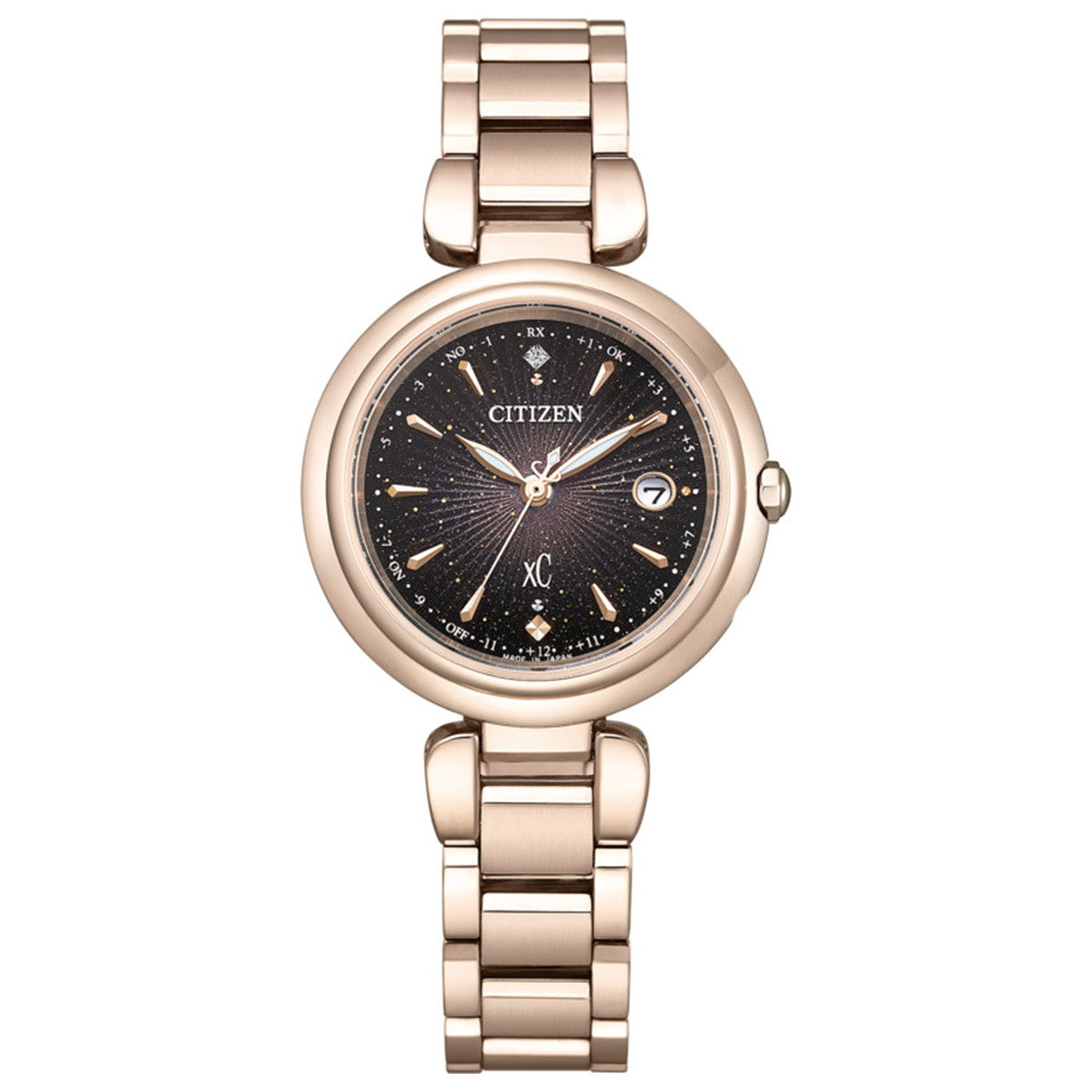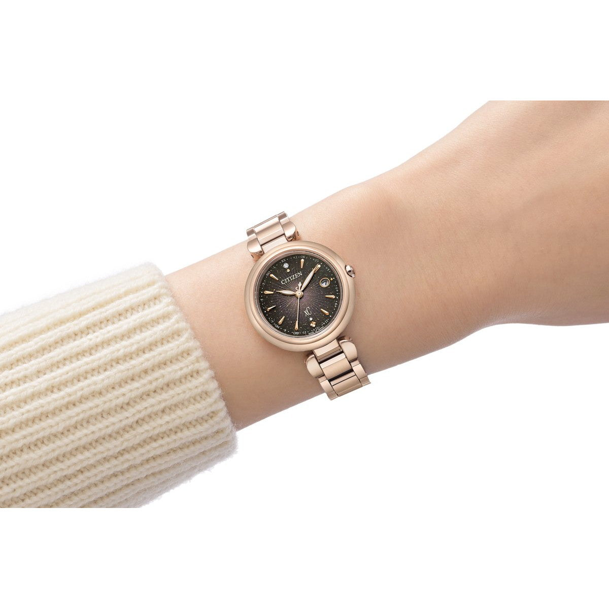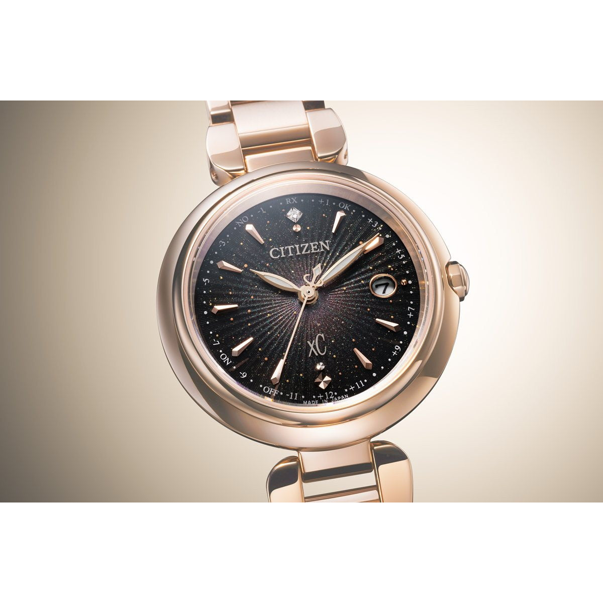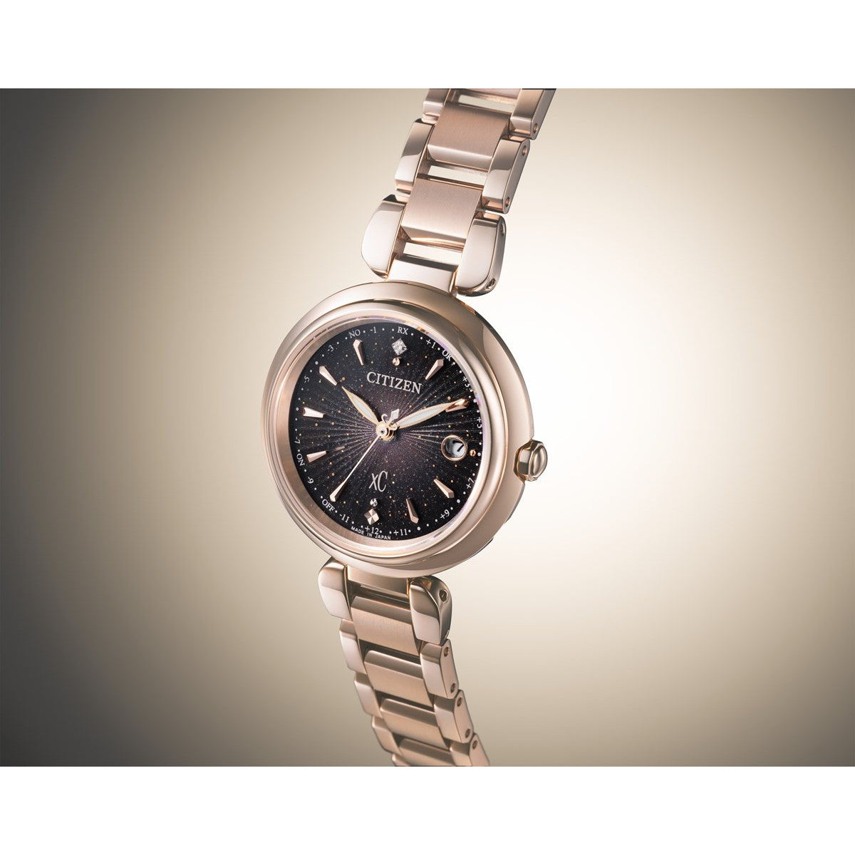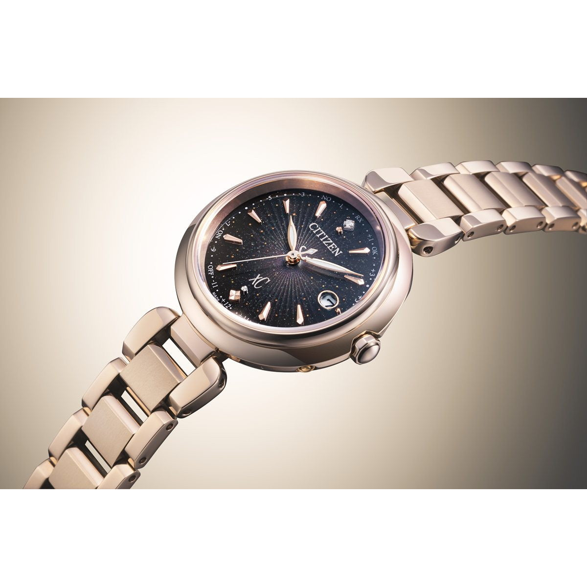新しいときのはじまりを告げる光が、腕元で華やかに彩りを添える、年始のブランド横断企画。サンレイパターンとゴールドをあしらい、中心からまっすぐと広がっていく光を表現した、特別感のあるデザイン。ATTESA、EXCEED、xC、CITIZEN COLLECTIONの4ブランドで展開します。[xC]前を向く女性を応援するエンパワーウオッチブランド、シチズン xC(クロスシー)。放射状に光が反射する成形パターンとインクジェットのグラデーションを組み合わせて、新しいときのはじまりを告げる光が広がっていく様子を表現しました。文字板は、ゴールドパールとゴールドプリント、多色のインクジェットプリントを重ねた奥行きのある幻想的な仕上がり。見る角度によって、さまざまな表情を楽しめます。インデックスは、放射状に広がる光をイメージしたカットパーツをレイアウト。12時の位置で輝く1ポイントのラボグロウン・ダイヤモンドが華やかさをきわだたせます。