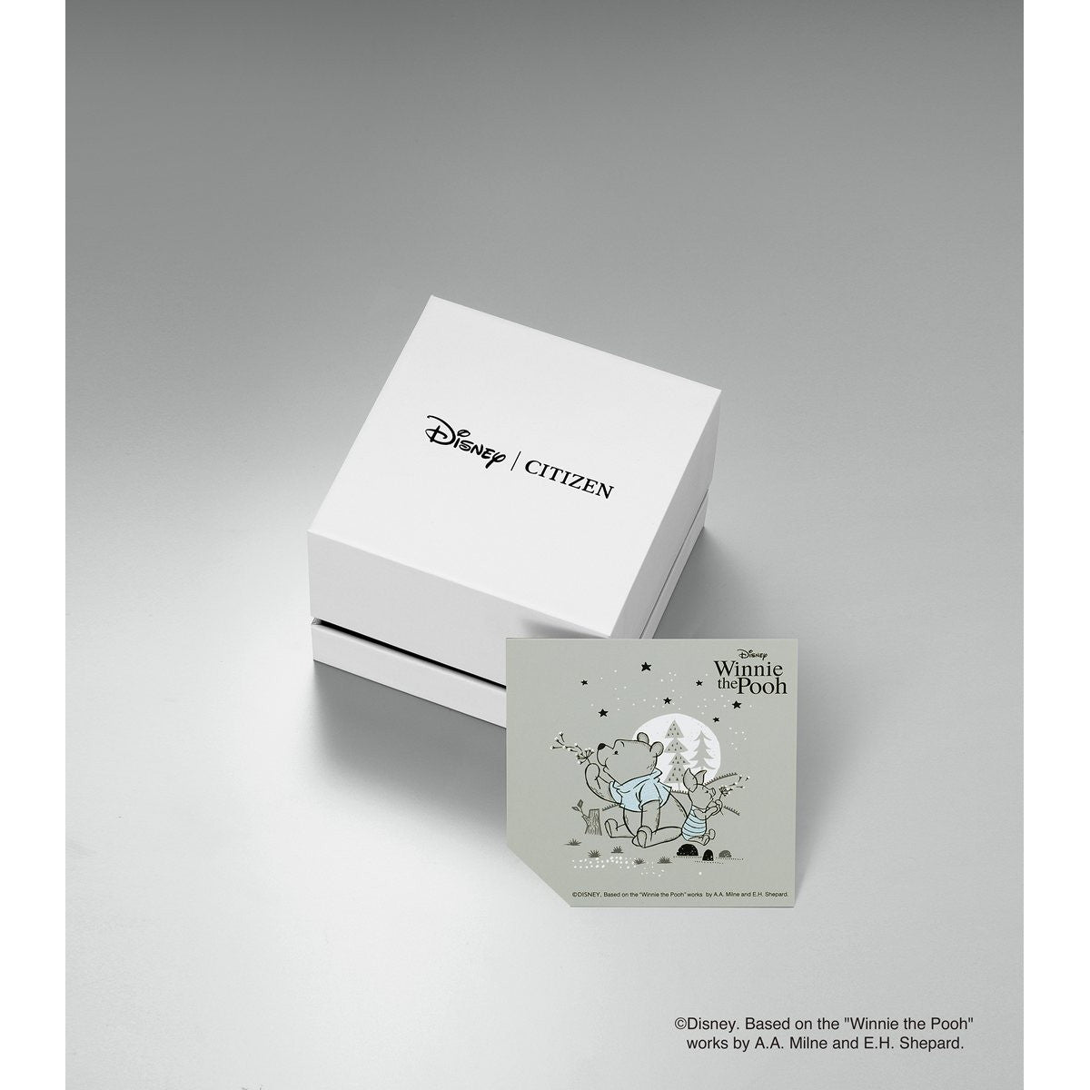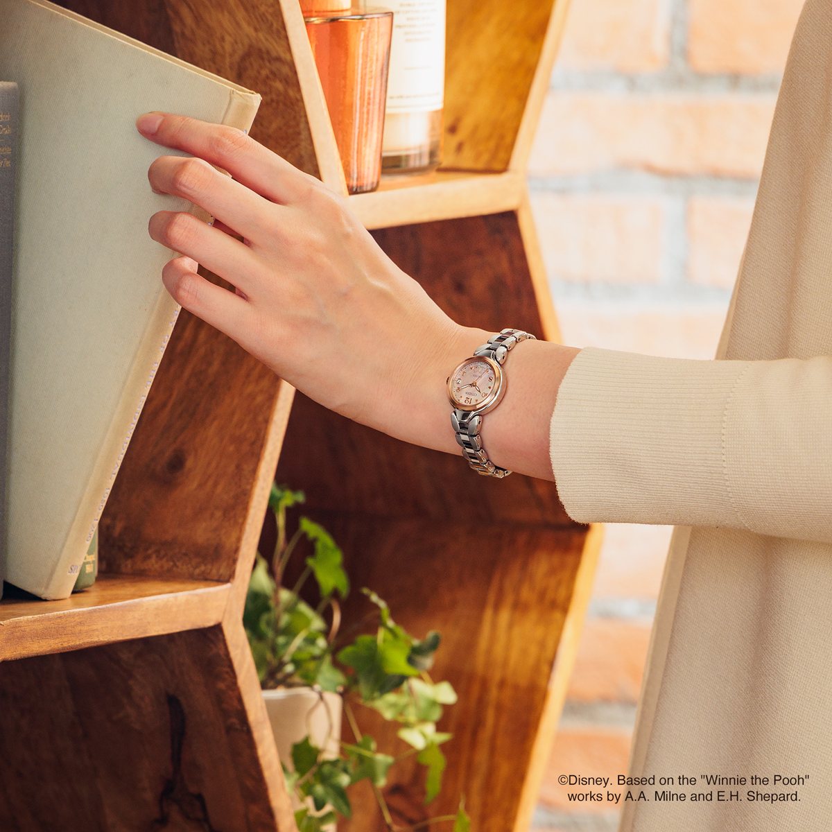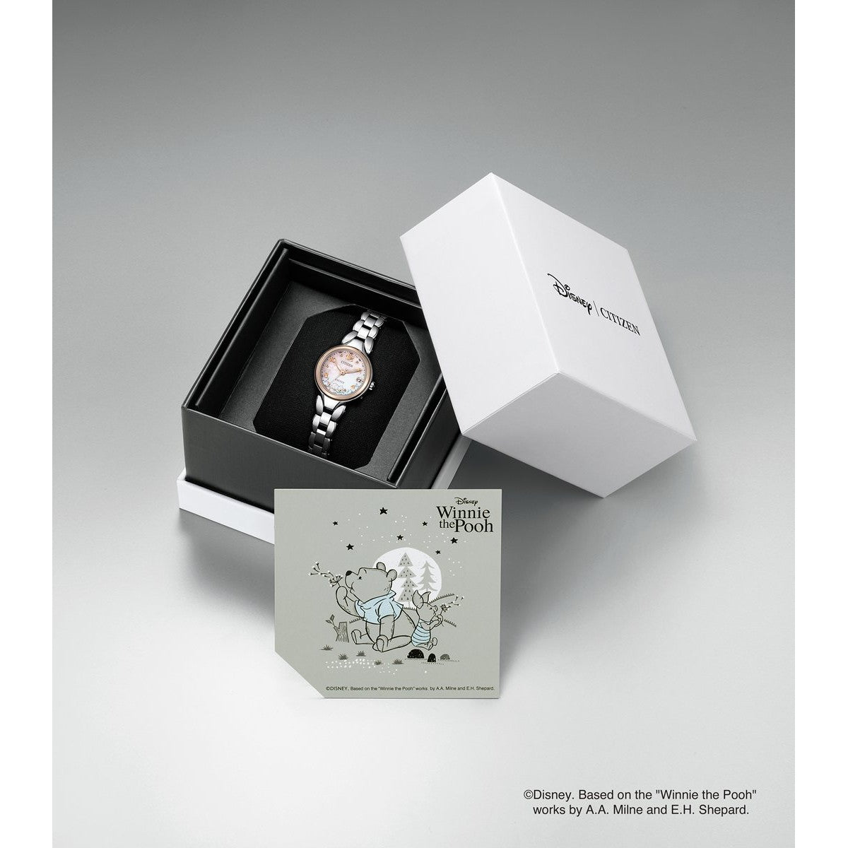 幸せな瞬間を、共に過ごしていきたい。そんな想いを込め、シチズンがブランドを超えてデザインしたディズニーコクションが登場。それぞれのキャラクターたちを表現した特別なデザイン。手に取った瞬間、喜びと美しさに彩られた時間が始まります。モチーフ:『くまのプーさん』。お花をモチーフにしたバンドのデザインが人気のモデルをベースに『くまのプーさん』の世界観を表現。美しさと愛らしさ、実用性にもこだわった特別感あふれる1本です。文字板の素材は白蝶貝。6時の位置にタンポポの綿毛が舞う森でうたた寝をしている「プーさん」をプリントしました。インデックスは、『くまのプーさん』の世界観に合わせた可愛いデザインのアラビア数字。暗い場所でも時刻が見やすい夜光針を採用しています。裏ぶたに、綿毛を吹く「プーさん」と「ピグレット」のシルエットを刻印。舞い散る綿毛が文字板のデザインとリンクしています。