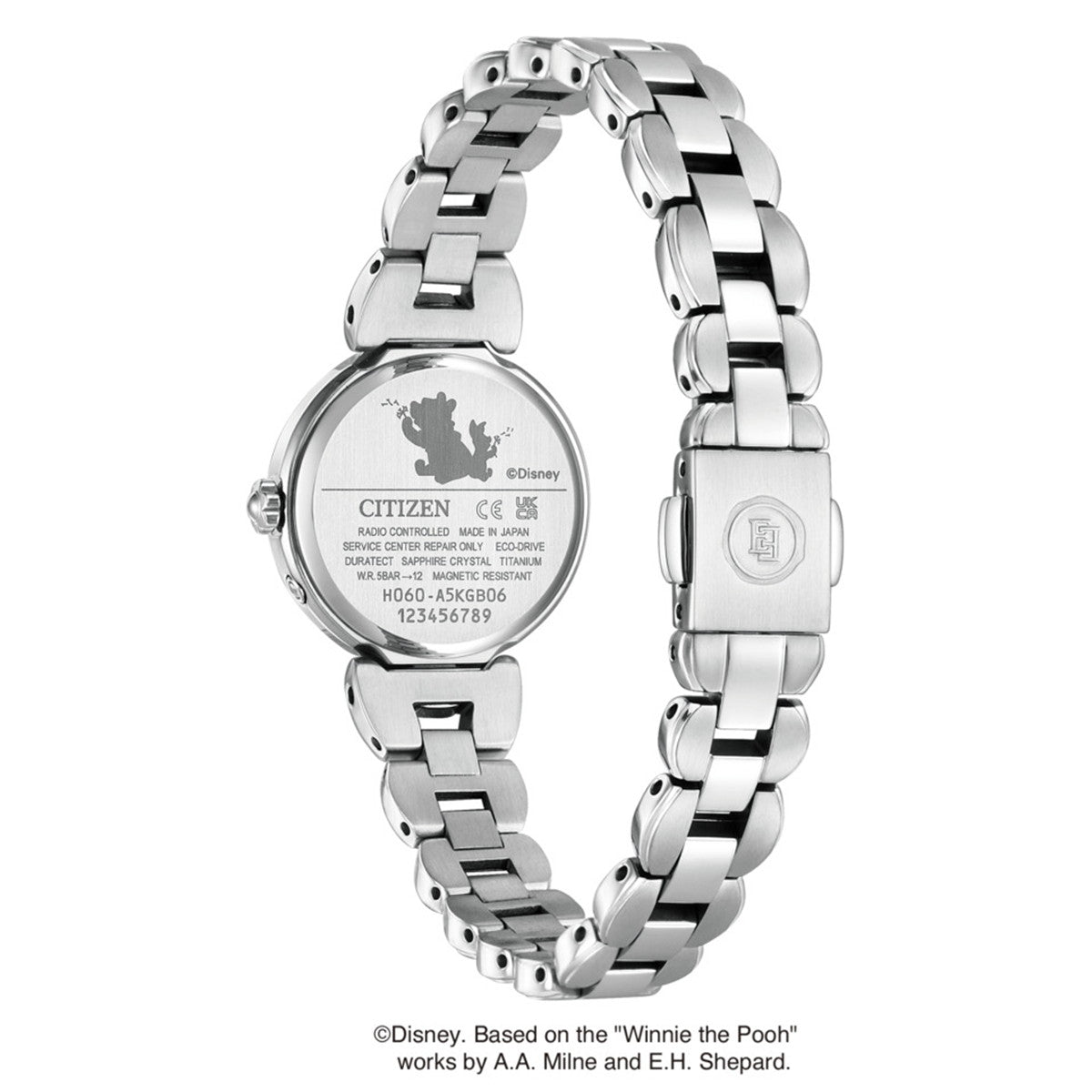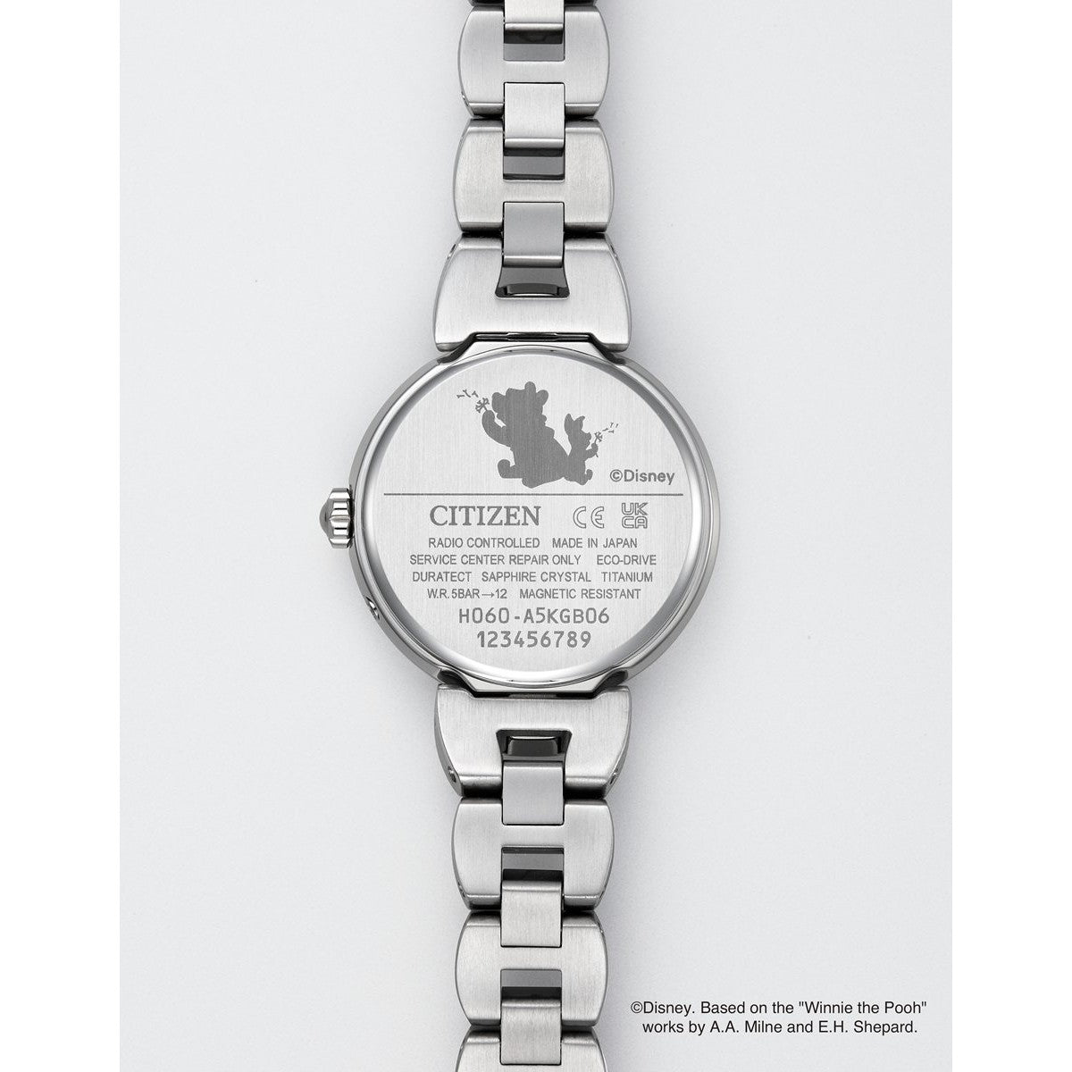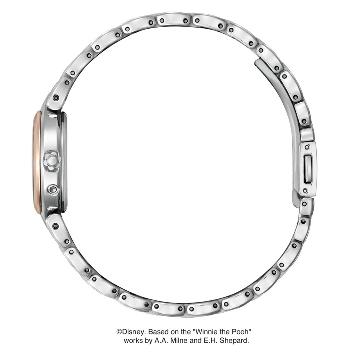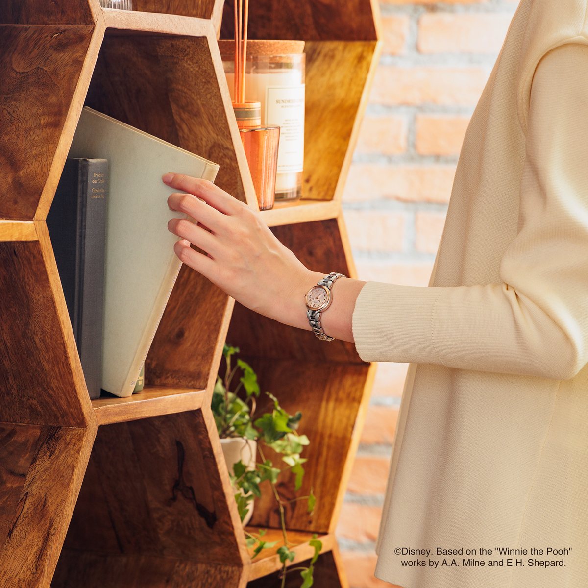 幸せな瞬間を、共に過ごしていきたい。そんな想いを込め、シチズンがブランドを超えてデザインしたディズニーコクションが登場。それぞれのキャラクターたちを表現した特別なデザイン。手に取った瞬間、喜びと美しさに彩られた時間が始まります。モチーフ:『くまのプーさん』。お花をモチーフにしたバンドのデザインが人気のモデルをベースに『くまのプーさん』の世界観を表現。美しさと愛らしさ、実用性にもこだわった特別感あふれる1本です。文字板の素材は白蝶貝。6時の位置にタンポポの綿毛が舞う森でうたた寝をしている「プーさん」をプリントしました。インデックスは、『くまのプーさん』の世界観に合わせた可愛いデザインのアラビア数字。暗い場所でも時刻が見やすい夜光針を採用しています。裏ぶたに、綿毛を吹く「プーさん」と「ピグレット」のシルエットを刻印。舞い散る綿毛が文字板のデザインとリンクしています。