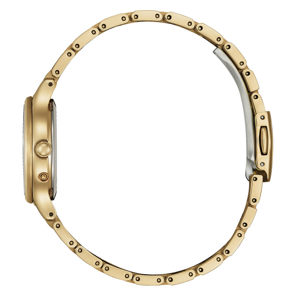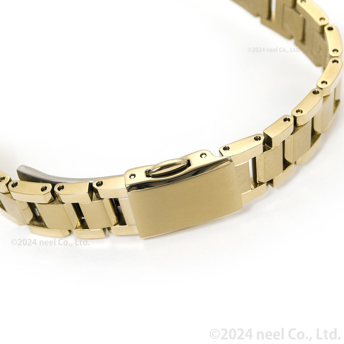 ”光の環”をイメージした、すっきり細く艶やかなベゼルに文字板を彩るカットパーツ。光の粒をイメージしたガラス淵のミルグレインリングは女性の輝きとしなやかさを表現しています。ケース、バンドには表面硬化技術デュラテクトの新色”アンバーイエロー”を纏い、落ち着いたゴールドカラーのデュラテクトは日常使いからフォーマルな場面まで幅広く活躍します。白蝶貝文字板は視認性の良いブラウンのインデックスを組み合わせたクラシカルな印象です。