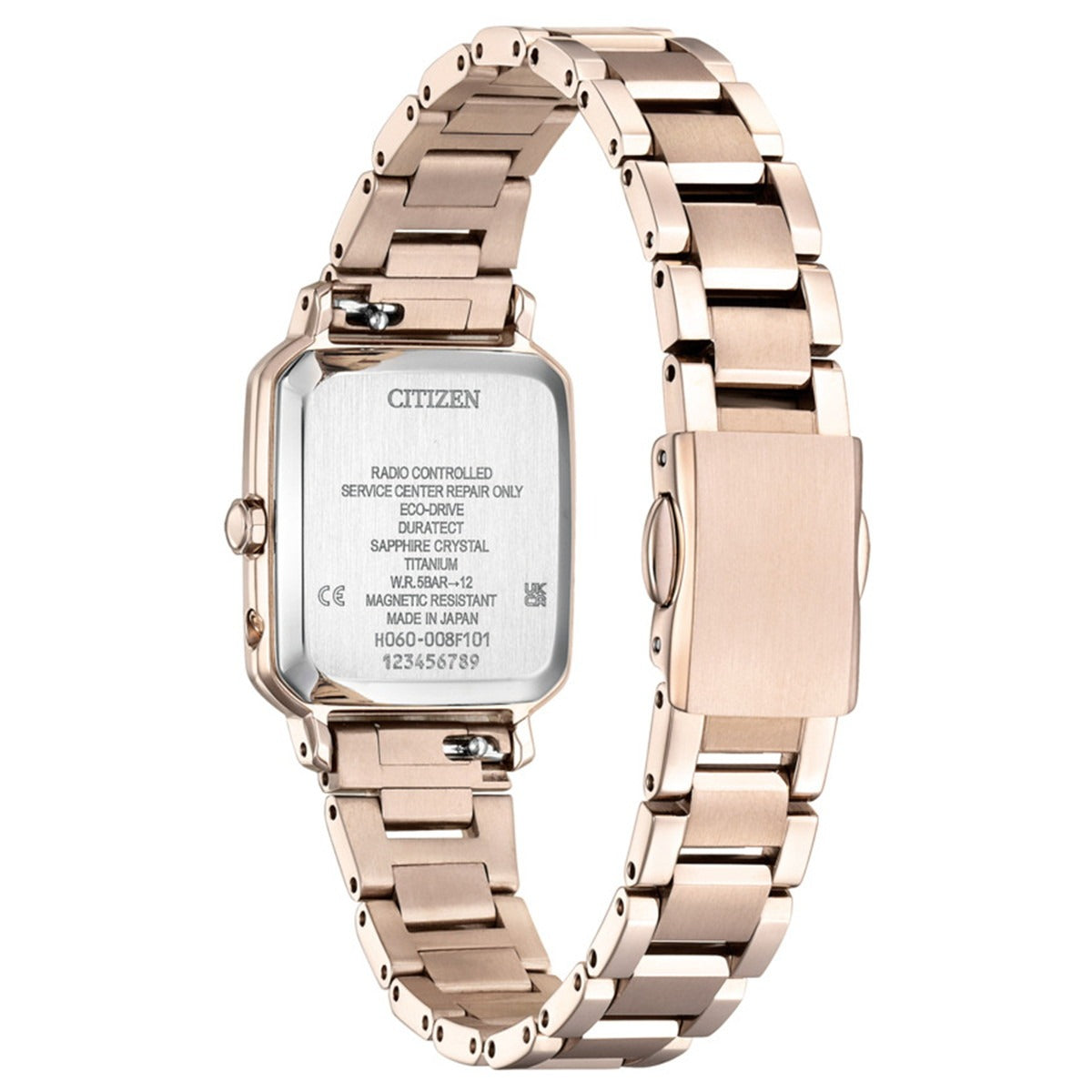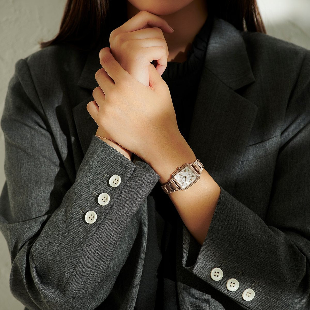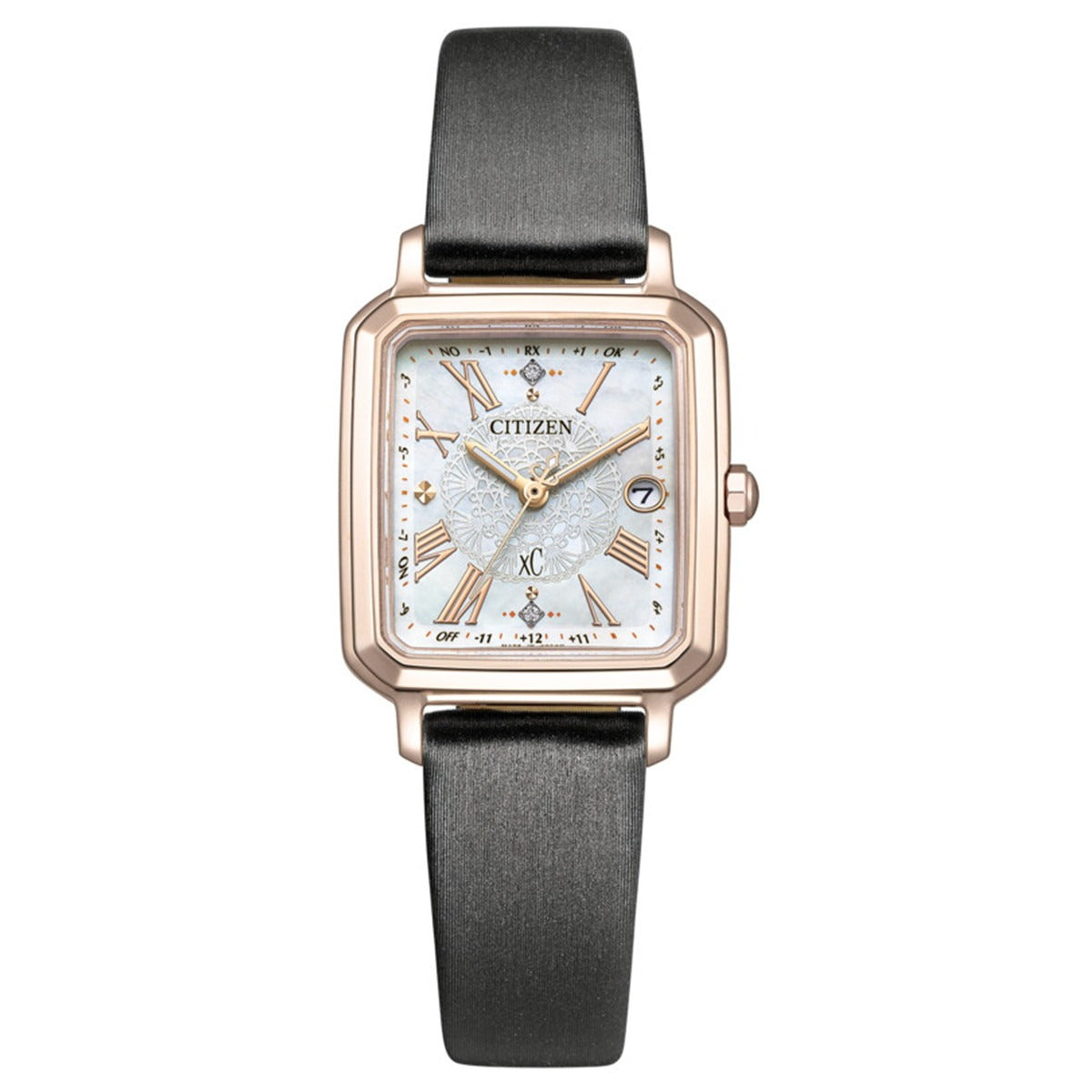 前を向く女性を応援するエンパワーウオッチブランド、シチズン xC(クロスシー)。サクラピンク(R)のケースと白蝶貝文字板を生かした、hikari collectionスクエア2wayモデルの限定仕様。アンティークレースをモチーフにしたクラシカルなデザインです。サクラピンク(R)のケースは、やさしくフェミニンな印象のスクエアフォルム。白蝶貝文字板にほんのりとベージュカラーをのせた、クラシカルで華やかなモデルです。文字板の中央に、繊細で美しいアンティークレースをモチーフにしたパターンをエッチングで描いています。12時と6時の位置にラボグロウン・ダイヤモンドをセッティング。ネックレスのような装飾を、デザインのアクセントとしてさりげなく添えています。ダークグレーのサテン調バンドをセットした2Way仕様。その日の気分やシーンに合わせて、ご自身で簡単にバンドを交換できるインターチェンジャブル構造です。