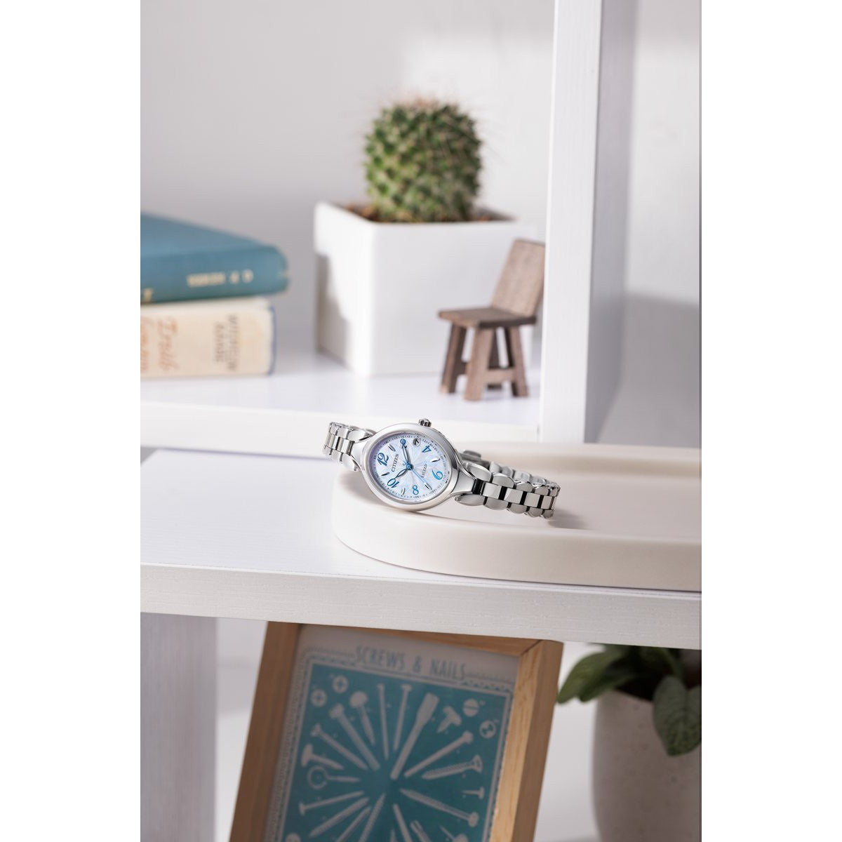 確かな品質と洗練されたデザイン。大人のためのドレスウオッチ、シチズン EXCEED(エクシード)。優雅なデザインが人気のお花をモチーフにしたバンドに、サイズ感にこだわったオーバルケースの新作が登場しました。お花をモチーフにしたフェミニンなバンドが人気のシリーズに、オーバルケースの新作が登場。バンドから繋がるようなケースラインがエレガントな印象を演出しています。大きすぎず、厚みを感じさせないケース設計。優れた視認性を確保しつつ、腕の細い方でも着けやすいサイズ感を実現しました。ES9510-57Dは、視認性に優れたブルーのアラビア数字インデックスと針を採用。白蝶貝文字板の中央に、優雅に咲くお花の重なりをエッチングで描いています。