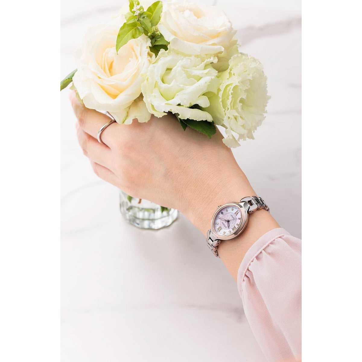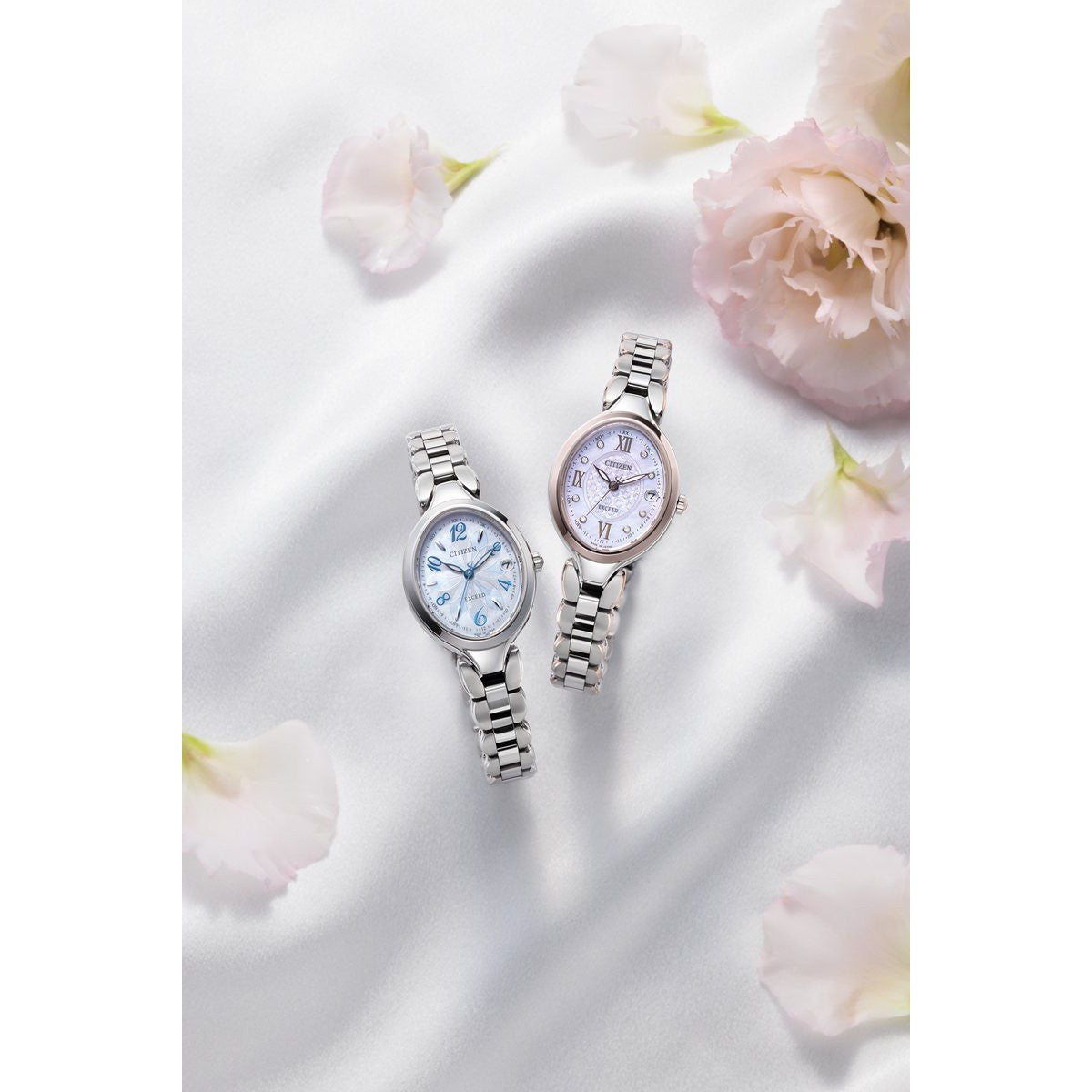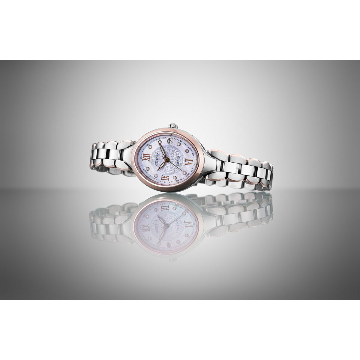 確かな品質と洗練されたデザイン。大人のためのドレスウオッチ、シチズン EXCEED(エクシード)。優雅なデザインが人気のお花をモチーフにしたバンドに、サイズ感にこだわったオーバルケースの新作が登場しました。お花をモチーフにしたフェミニンなバンドが人気のシリーズに、オーバルケースの新作が登場。バンドから繋がるようなケースラインがエレガントな印象を演出しています。大きすぎず、厚みを感じさせないケース設計。優れた視認性を確保しつつ、腕の細い方でも着けやすいサイズ感を実現しました。ES9515-53Nは、ブラウンのローマ数字インデックスと針を採用し、8ポイントのダイヤモンドをセッティング。ピンクの白蝶貝文字板に小花のパターンを彫刻で表現した、艶やかさと華やかさあふれるデザインです。