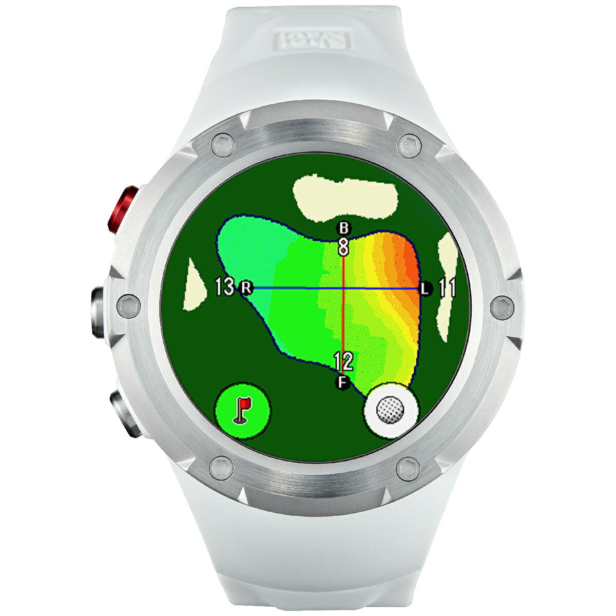 腕時計型ゴルフナビ最大サイズ1.4インチ・タッチパネル液晶ディスプレイ。Dynamic Green Eye、3点間距離計測、ピンポジ登録、パットシミュレーション、リバース表示、フェアウェイナビ(特許取得)、オートメジャー、オートビューチェンジ、グリーンディレクション、レイアップ機能搭載。MIPカラー反射型液晶。高精度測位みちびきL1S対応。腕時計型GPSゴルフナビ。日本プロゴルフ協会推薦品。国内100%&海外のゴルフ場に対応。