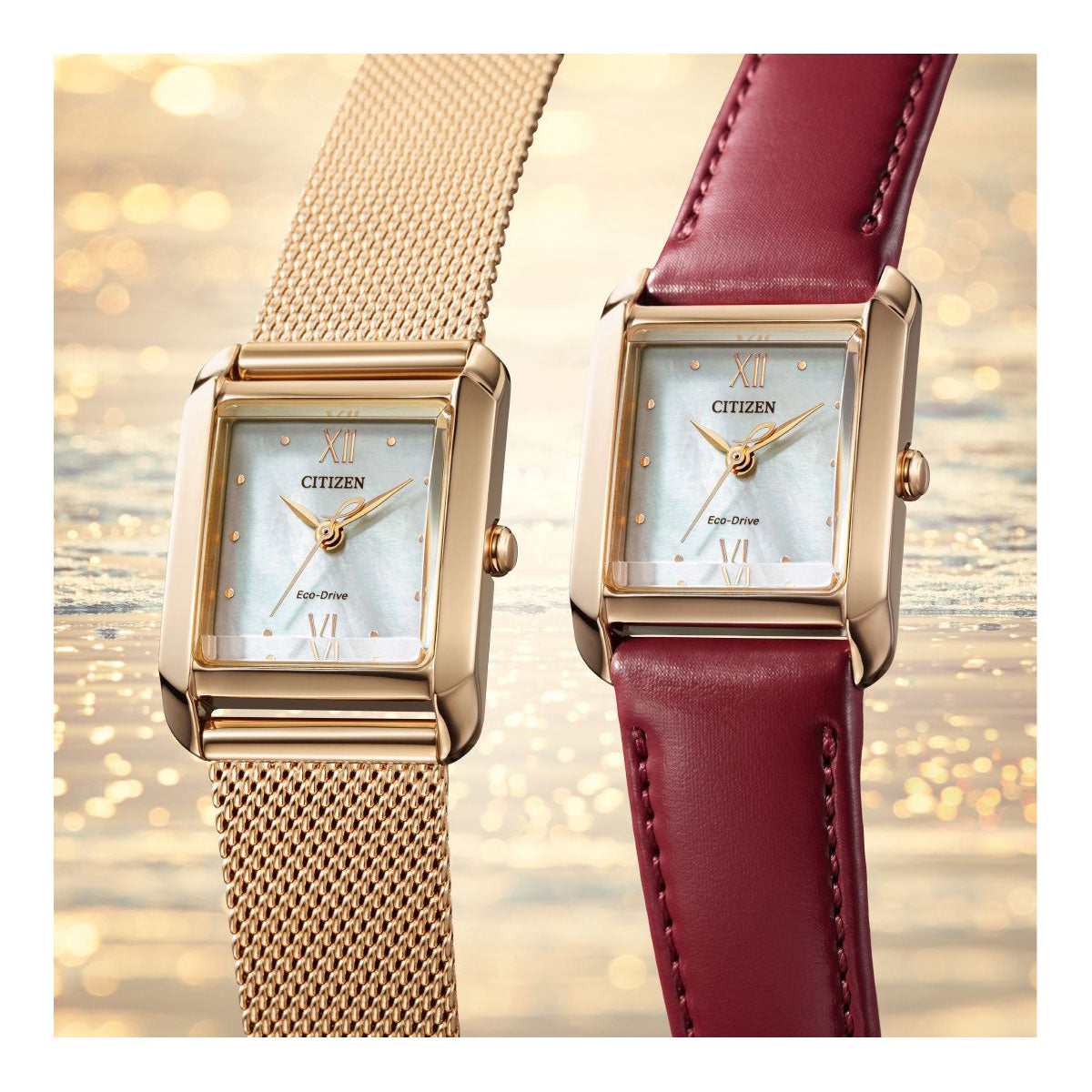地球のように美しいサステナブルウオッチ、CITIZEN L(シチズン エル)。ストライプとラメで、光の揺らぎを表現した深みのある文字板。モダンでエレガントなスクエアシェイプのモデルに、サステナブルな素材を使った替えバンド付きの新作が登場。大胆なカットを施したカーブサファイアガラスと、やや丸みをおびたケースラインが、女性のしなやかさと芯の強さを感じさせます。文字板は「光の揺らぎ」をテーマにデザイン。ストライプのパターンとラメの煌めきが、深みのある美しさを演出しています。メッシュバンドに加え、サステナブルな素材「ECOPETR(R)」を使用した替えバンド付き。レバー付きばね棒仕様なので、その日の気分やファッションに合わせて自分で手軽にバンドの付替ができます。