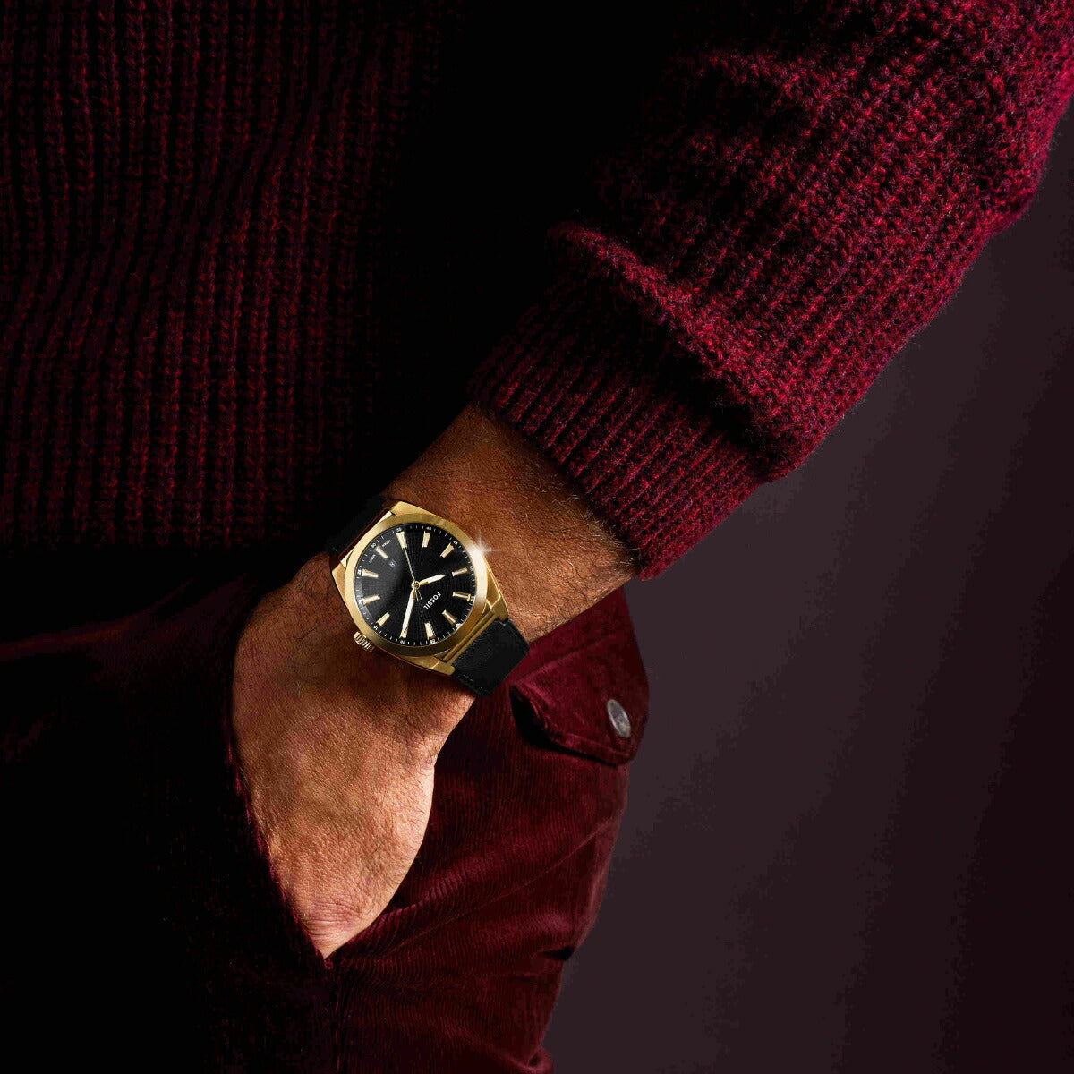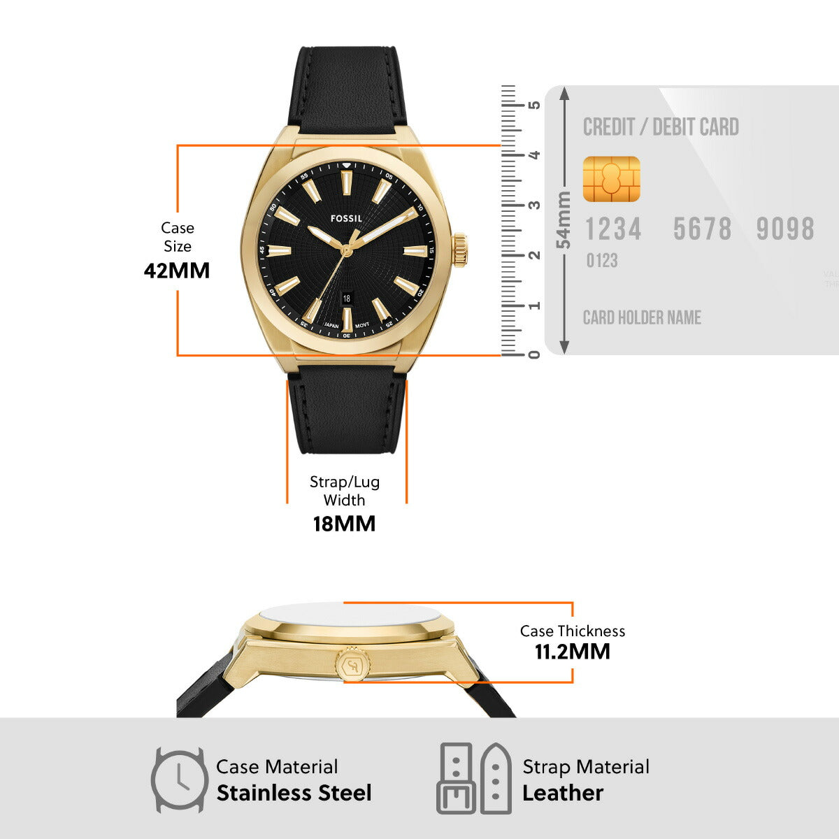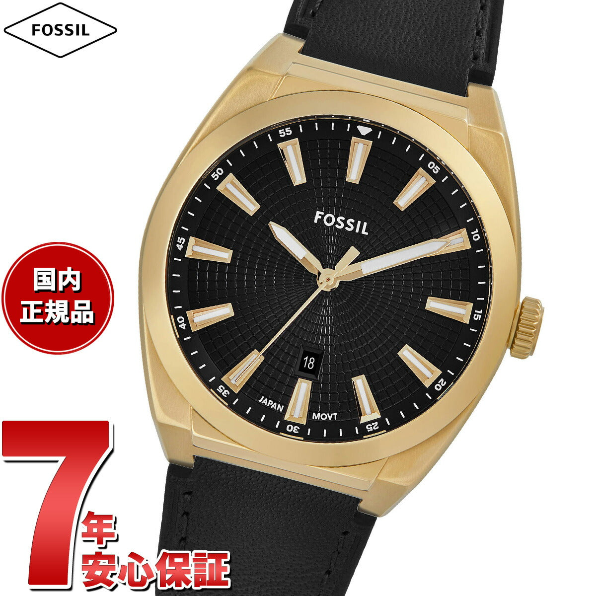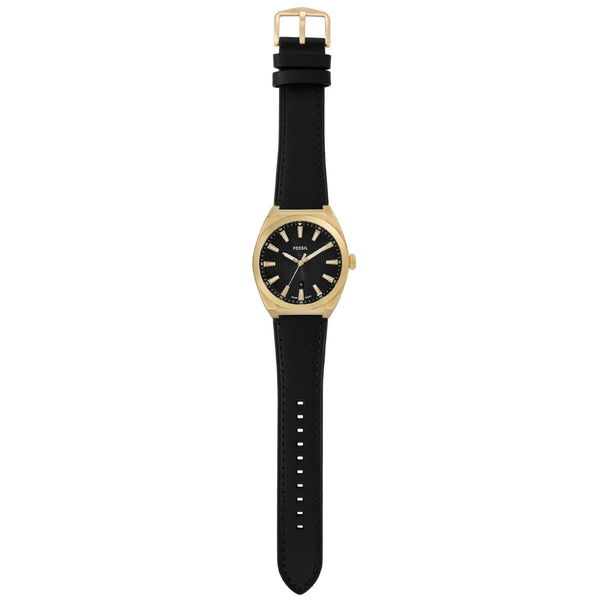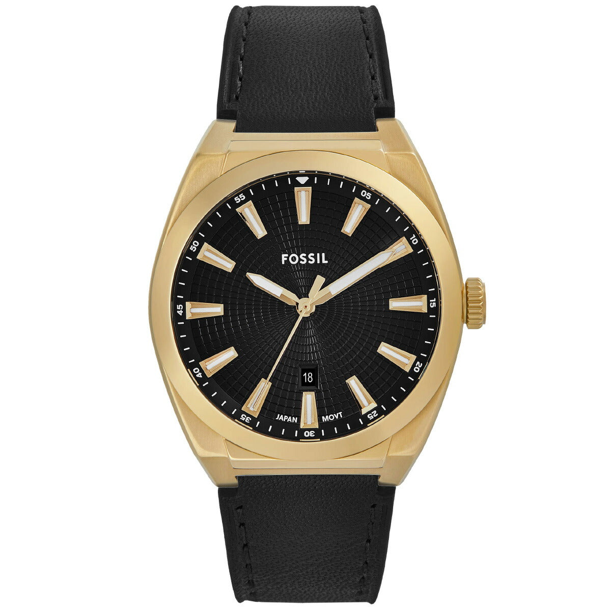 42mm径のケースにデイト表示付き三針ムーブメントを搭載したEVERETT。ブラックのサンレイダイヤルに、ブラックのレザーストラップを組み合わせました。Fossilのレザー製品は、Leather Working Group(LWG)を通じて責任あるものづくりを支援しています。