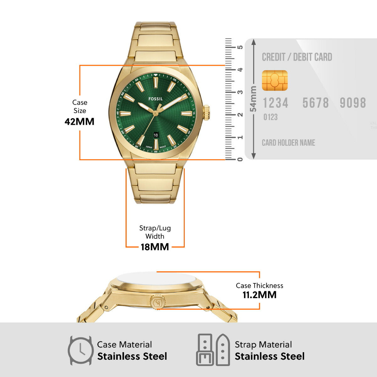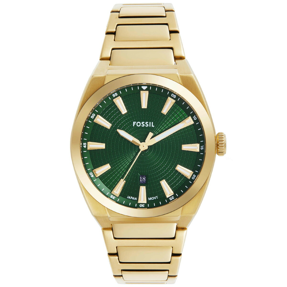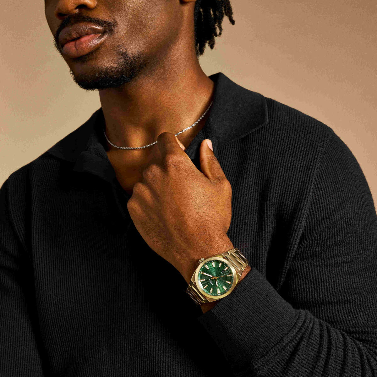 42mm径のケースにデイト表示付き三針ムーブメントを搭載したEVERETT。グリーンのサンレイダイヤルに、ゴールドトーンのステンレススチールブレスレットを組み合わせました。